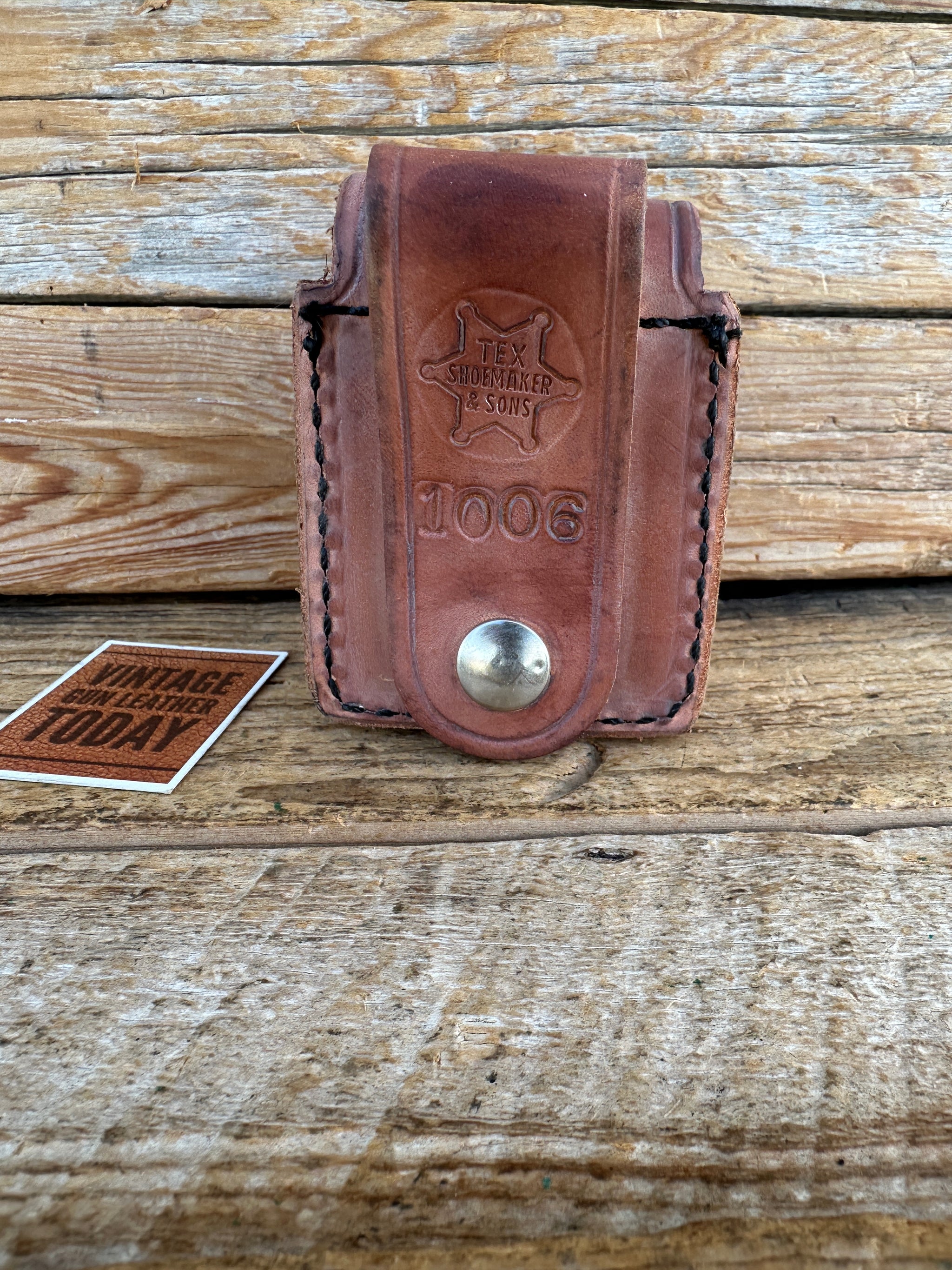 Vintage new old stock, Tex Shoemaker brown leather accessory case. Case is brown leather with nickel hardware. Rear has a 2 1/2" loop with directional snap. Interior measurements are 2 3/4" High x 2" Wide x 1 1/8" Deep. Bottom has a circular cut out 1/2" in diameter to push a item up and out. This may have been for a Mic box or panic button. This could be used for latex gloves, narcan or similar objects. This is new old stock with storage wear..