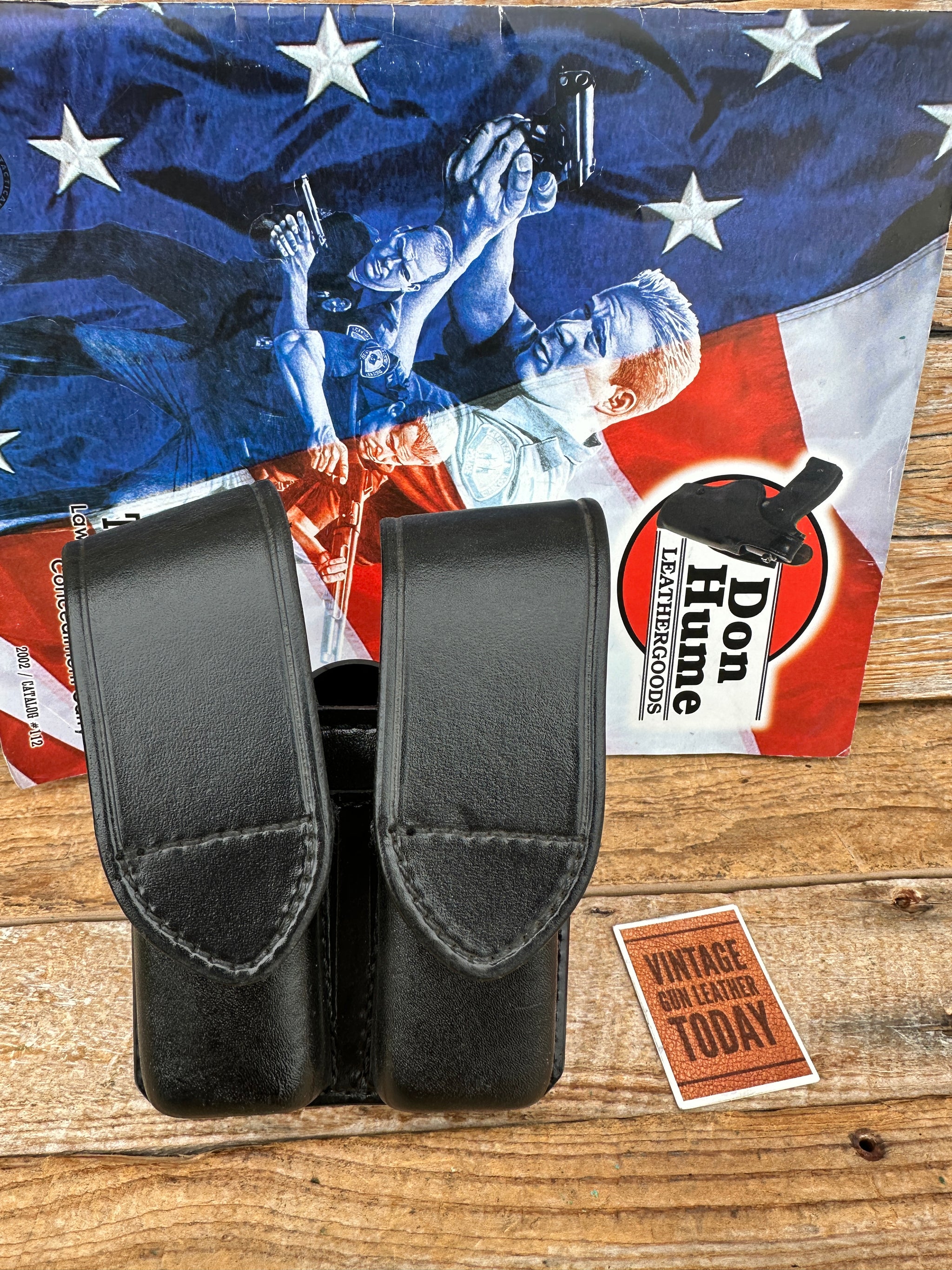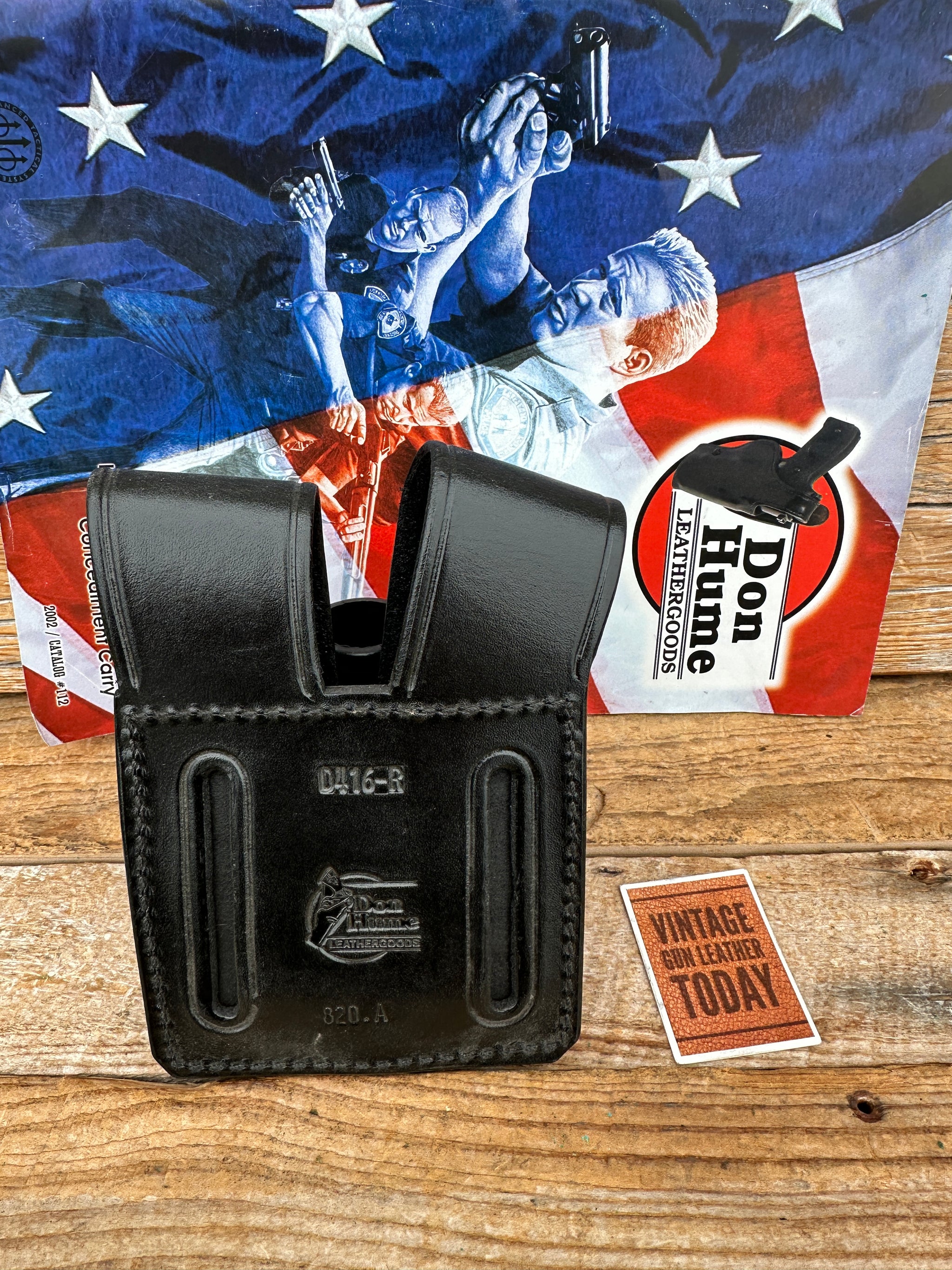 Vintage new old discontinued stock D416-R 820.A double magazine carrier. Carrier is plain black leather with hook and loop hardware. This model has angled flaps which contour to magazine. Pouches are at slight angle for ease of magazine removal and a fast reload. Slot will fit a belt up to 2 1/4". This carrier will hold TWO of the following magazines: