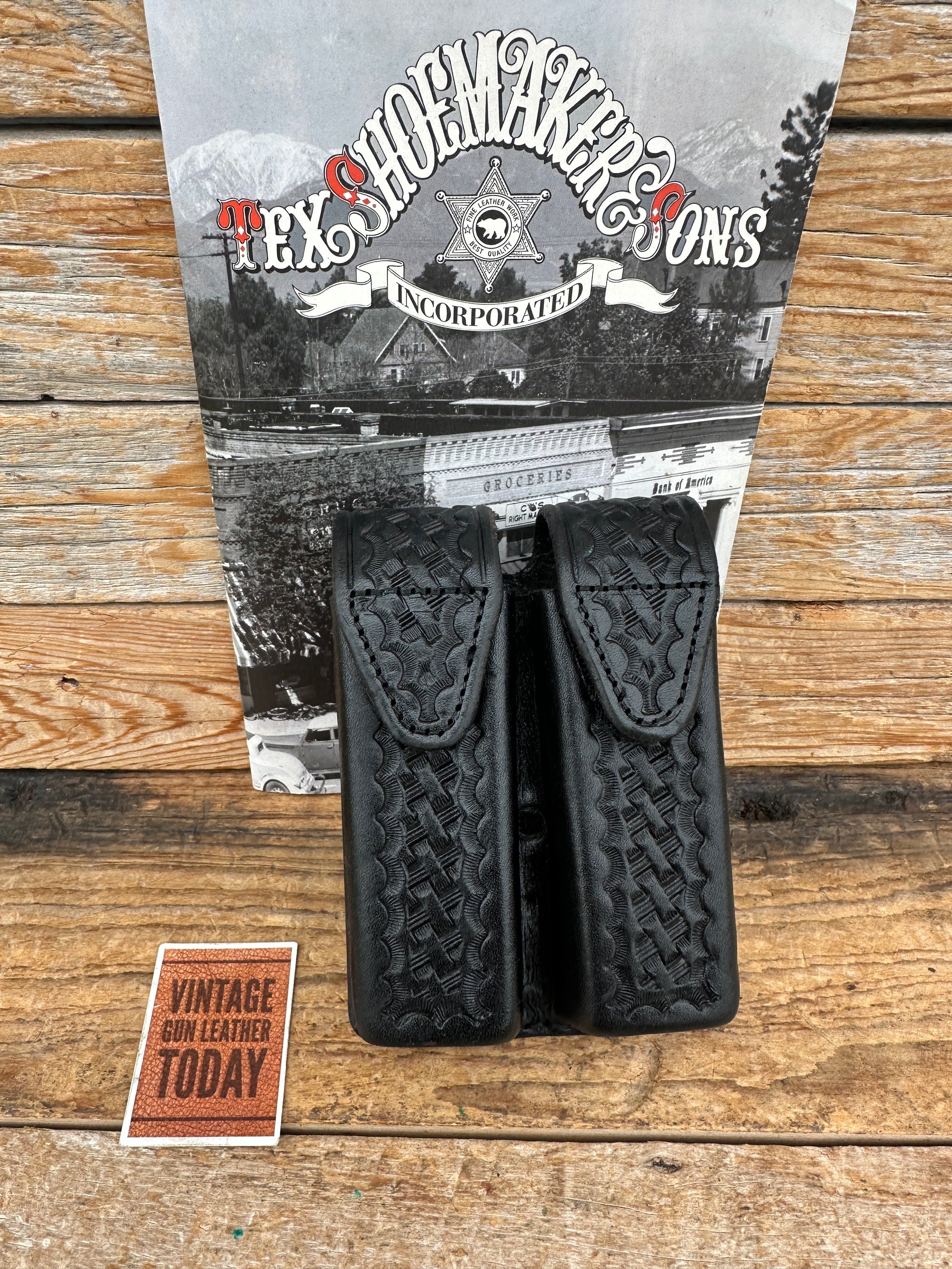 Vintage new old stock Tex Shoemaker black basket stamped leather 227 A4 QUAD 4 magazine carrier with hook and loop hardware. Belt slots will fit a belt up to 2 1/2" and will mount vertically. Carrier will fit the following: