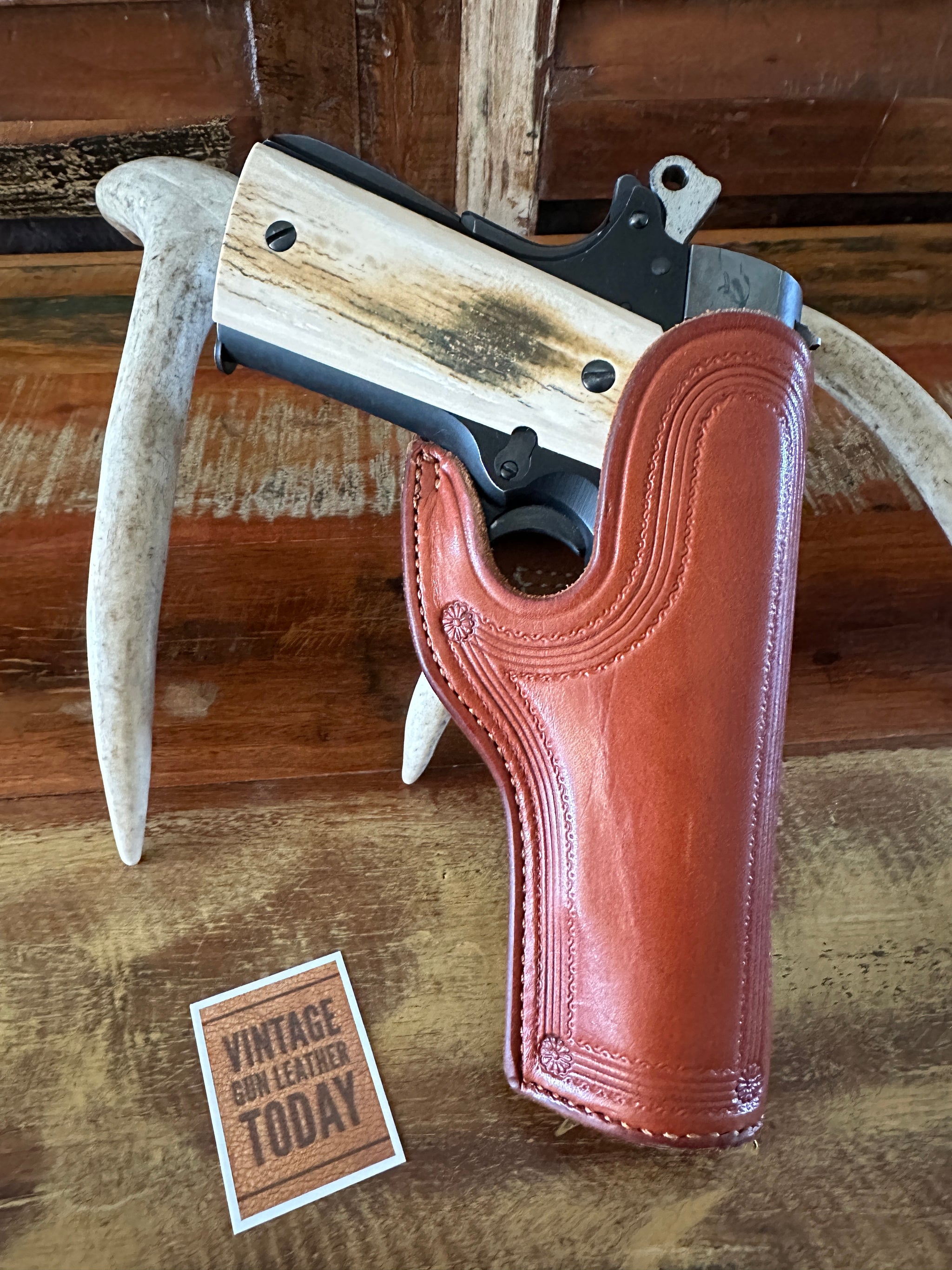 Beautiful R.M. Bachman #110 brown leather open top OWB holster with border stamping, 2” belt slot and closed sewn plug bottom. Holster is Right draw for a Colt 45 5” Government Model. This has a straight up and out draw with no angle. Very much reminds me of Doc Barranti’s work. Leather, stitching and hardware all in very nice condition..