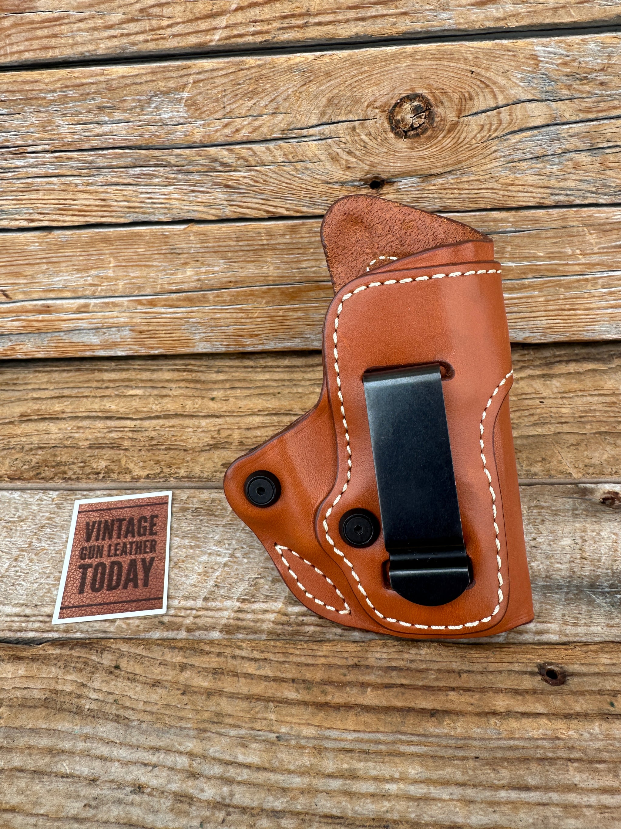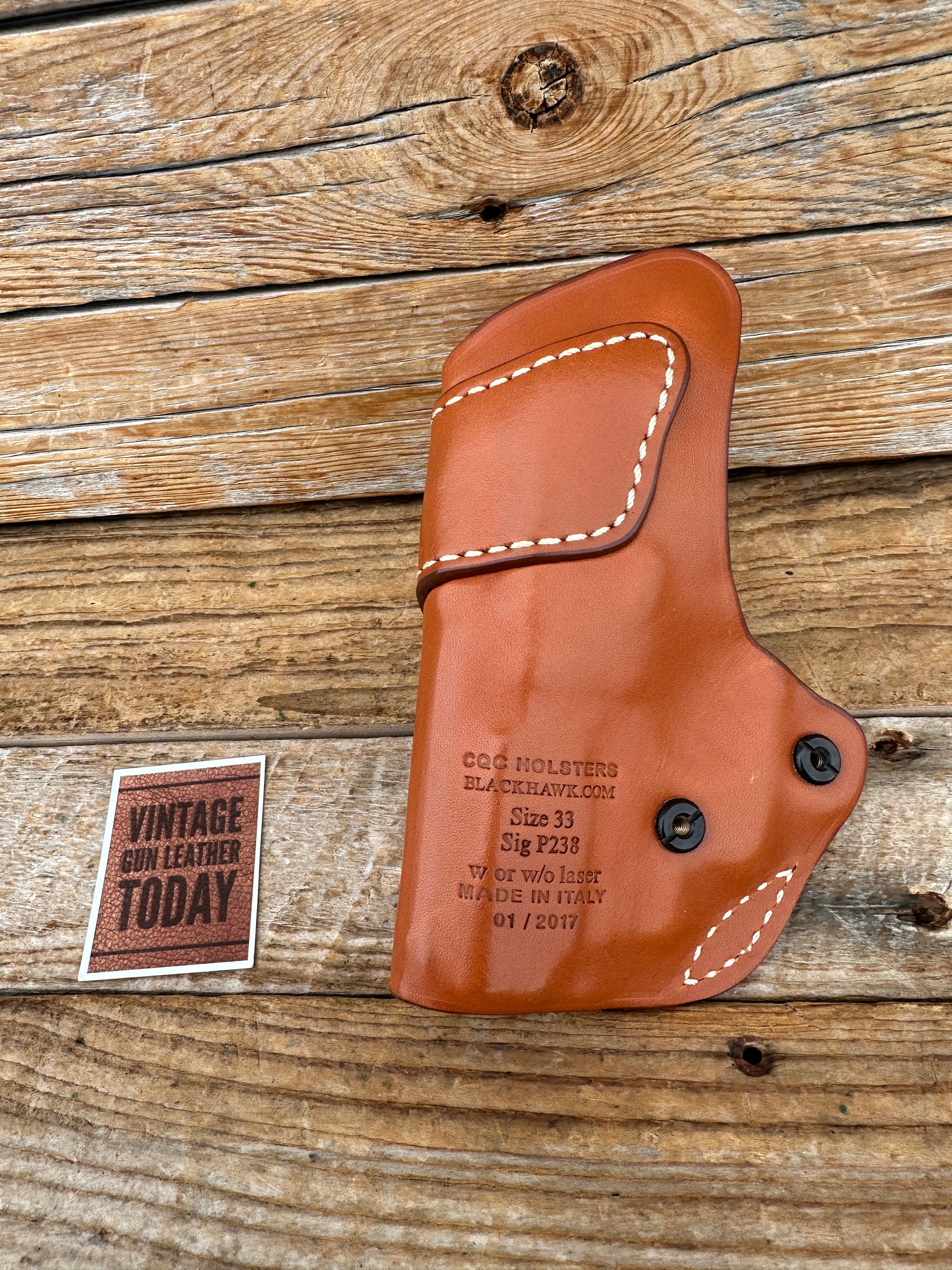 Discontinued CQC brown leather IWB holster For Sig P238 with or without laser. Holster has tension screws and 1 3/4" belt clip. Leather, stitching and hardware all in like new condition..
