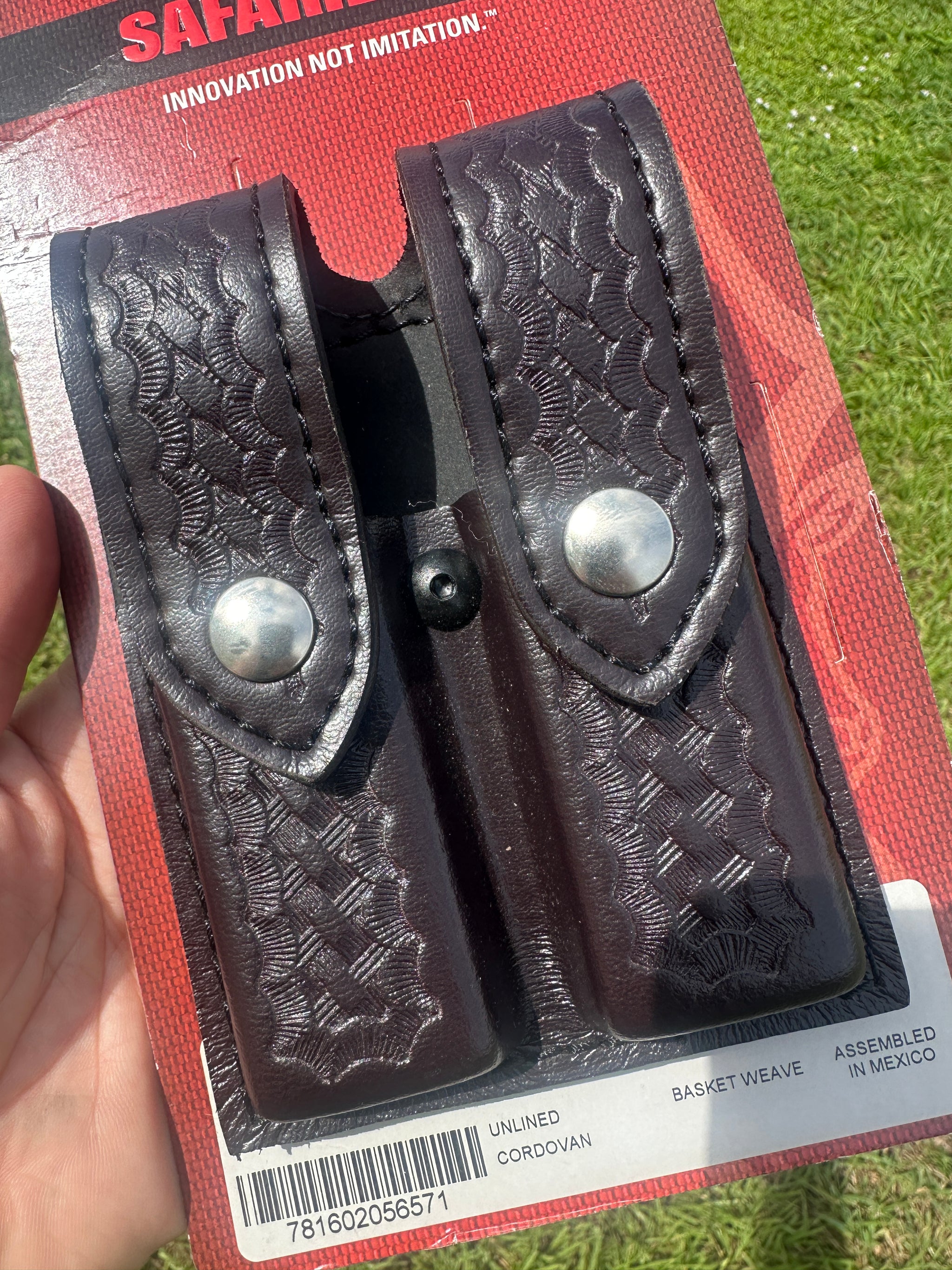 Also included is a matching NEW Safariland double magazine carrier. This is also cordovan basket stamped and will fit vertically or horizontally on a 2 1/4" duty belt. This will fit the Sig P220 among other steel single stack magazines..
