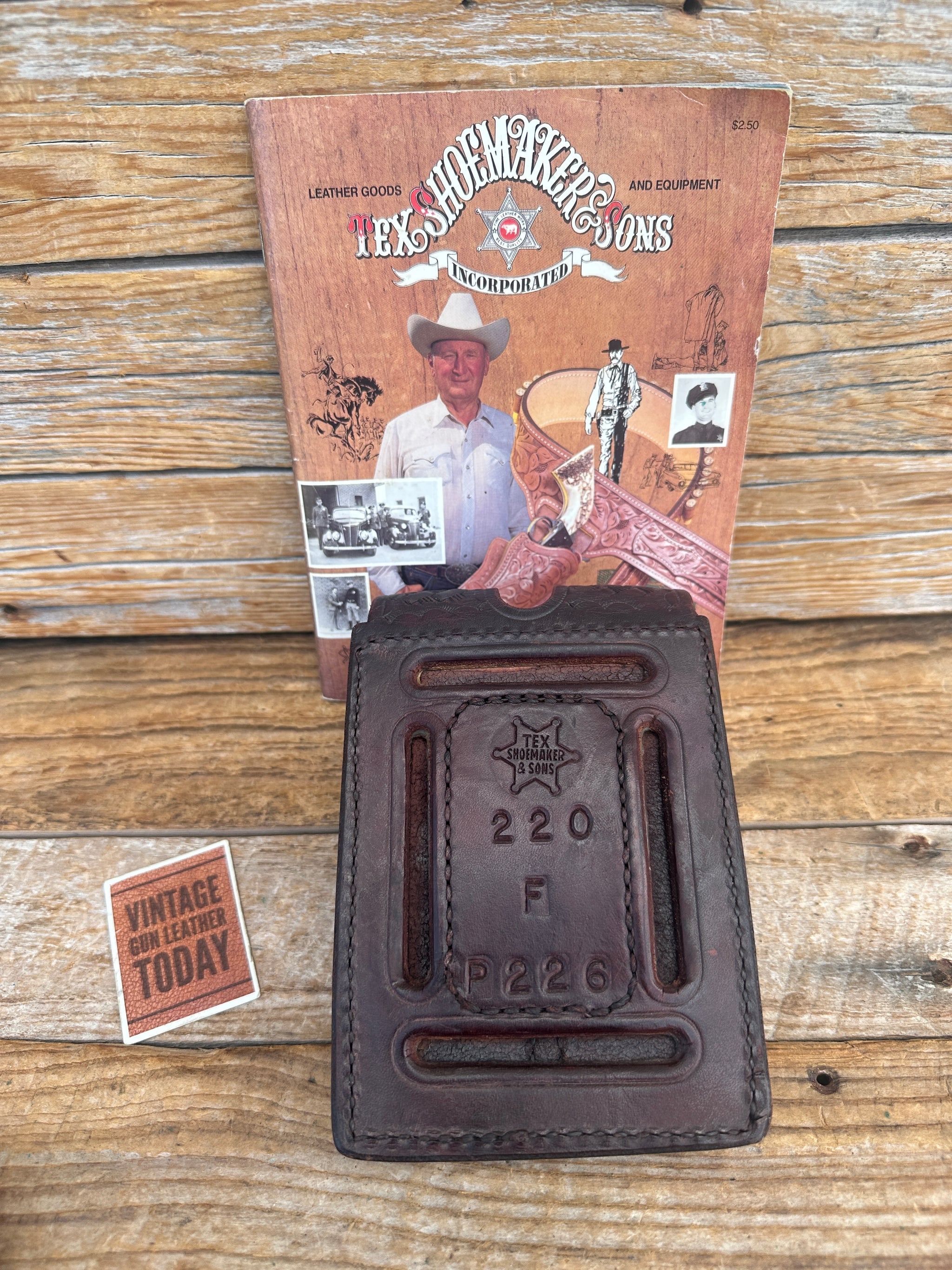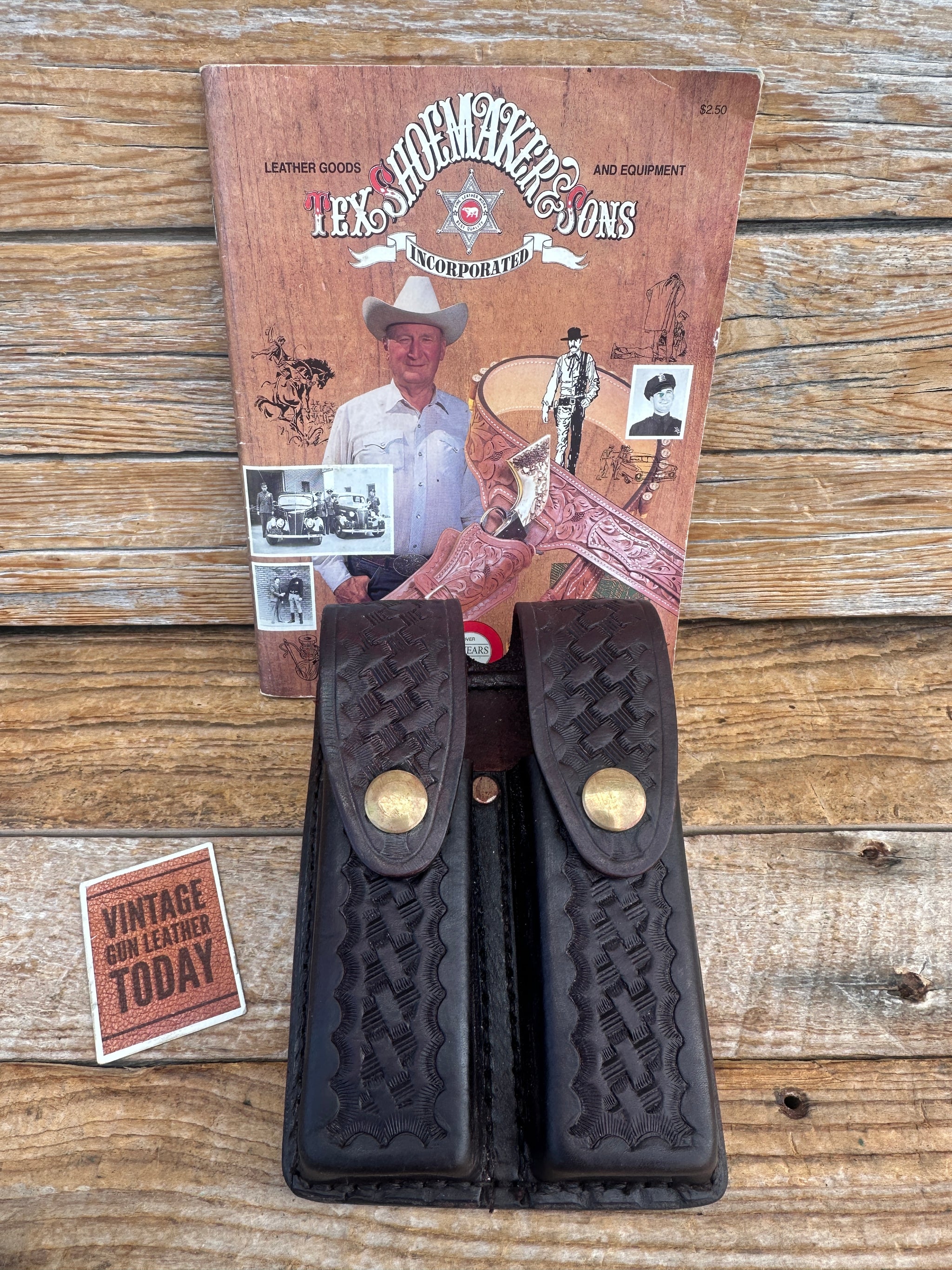 Tex Shoemaker Model 220 cordovan brown basket stamped double magazine carrier. This will hold 2 steel double stack magazines. Some examples are listed below. Slot will fit a belt up to 2 1/4" and will mount vertically or horizontally. Hardware is BRASS . Very difficult to find cordovan brown basket stamped magazine carriers.