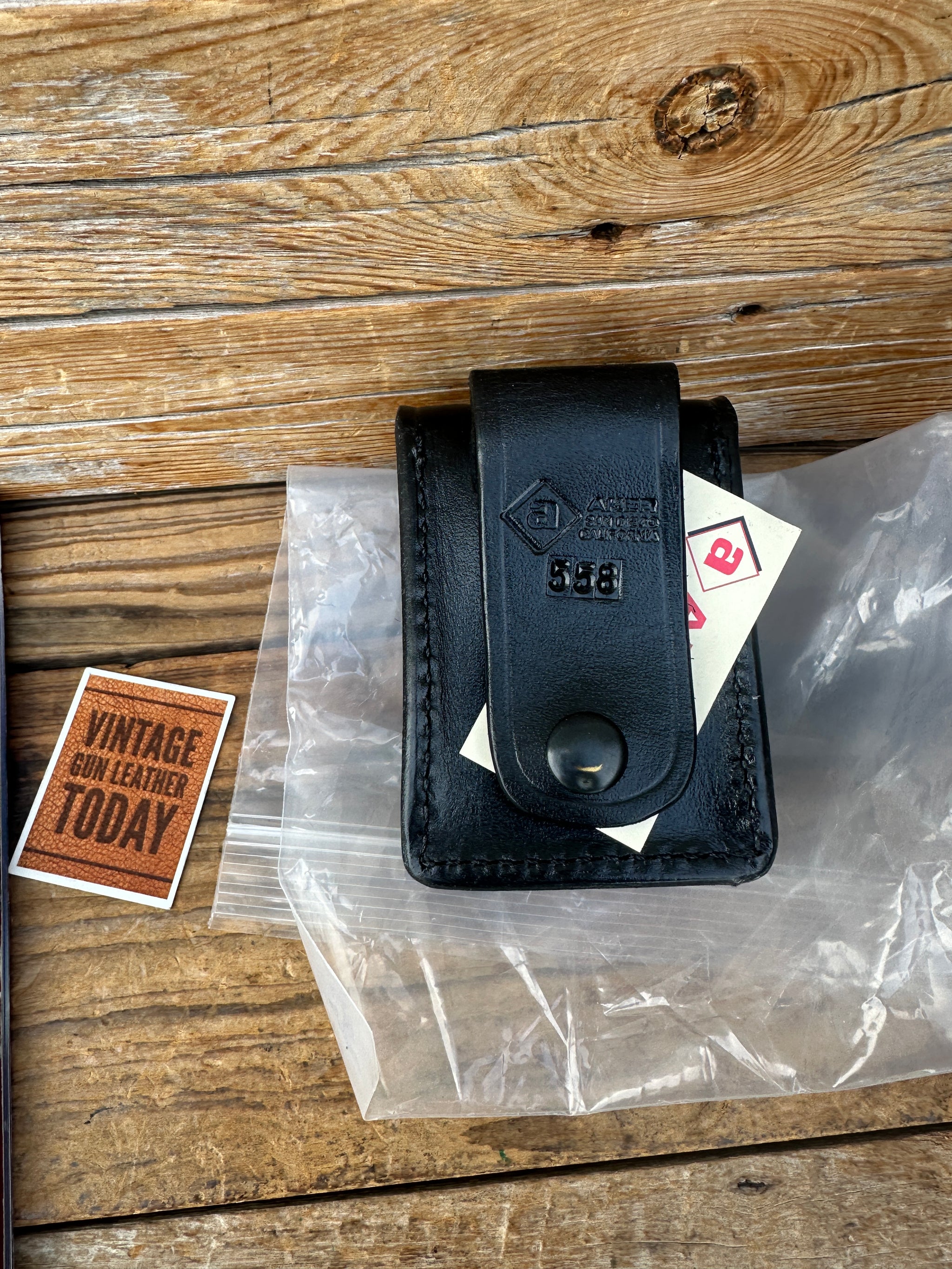 New old stock, AKER black basket stamped leather case. This will hold 2 Narcan and one set of latex gloves. Front has hook and loop closure. Rear has 2 1/4" belt loop with directional snap..