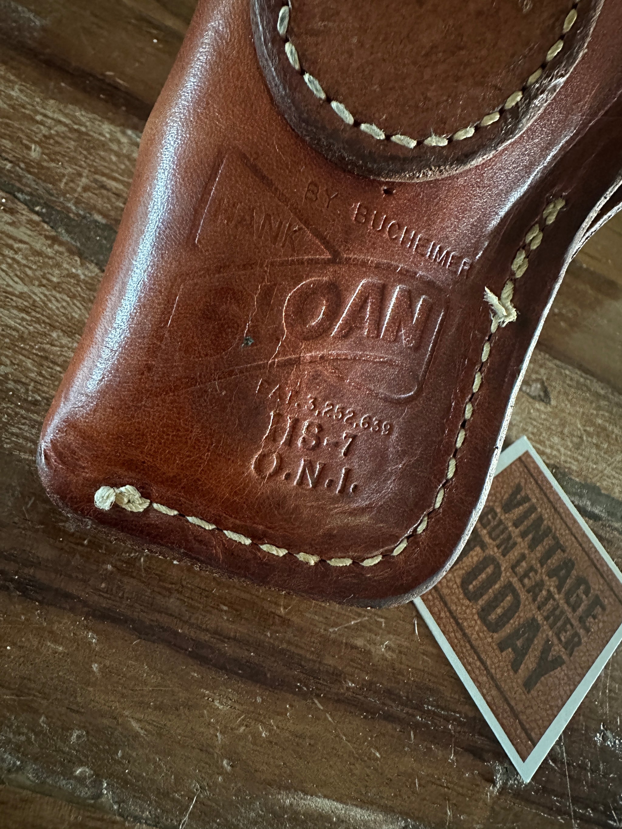 Vintage Bucheimer Hank Sloan FBI style holster. This particular Hank Sloan FBI styleholster was issued to the Office Of Naval Intelligence . At the end of 1965 these were shipped to individual Naval Intelligence offices for agents for their new 4" S&W model 19 revolvers and were stamped O.N.I. 9 A Bucheimer single snap dump pouch was also issued at same time. Each agent was given printed instructions on how to block their new holster for a better fit. Right were only issued in brown and Left were available only in black. A second issuance of this holster was done 2-3 years later were no longer stamped O.N.I. 9.