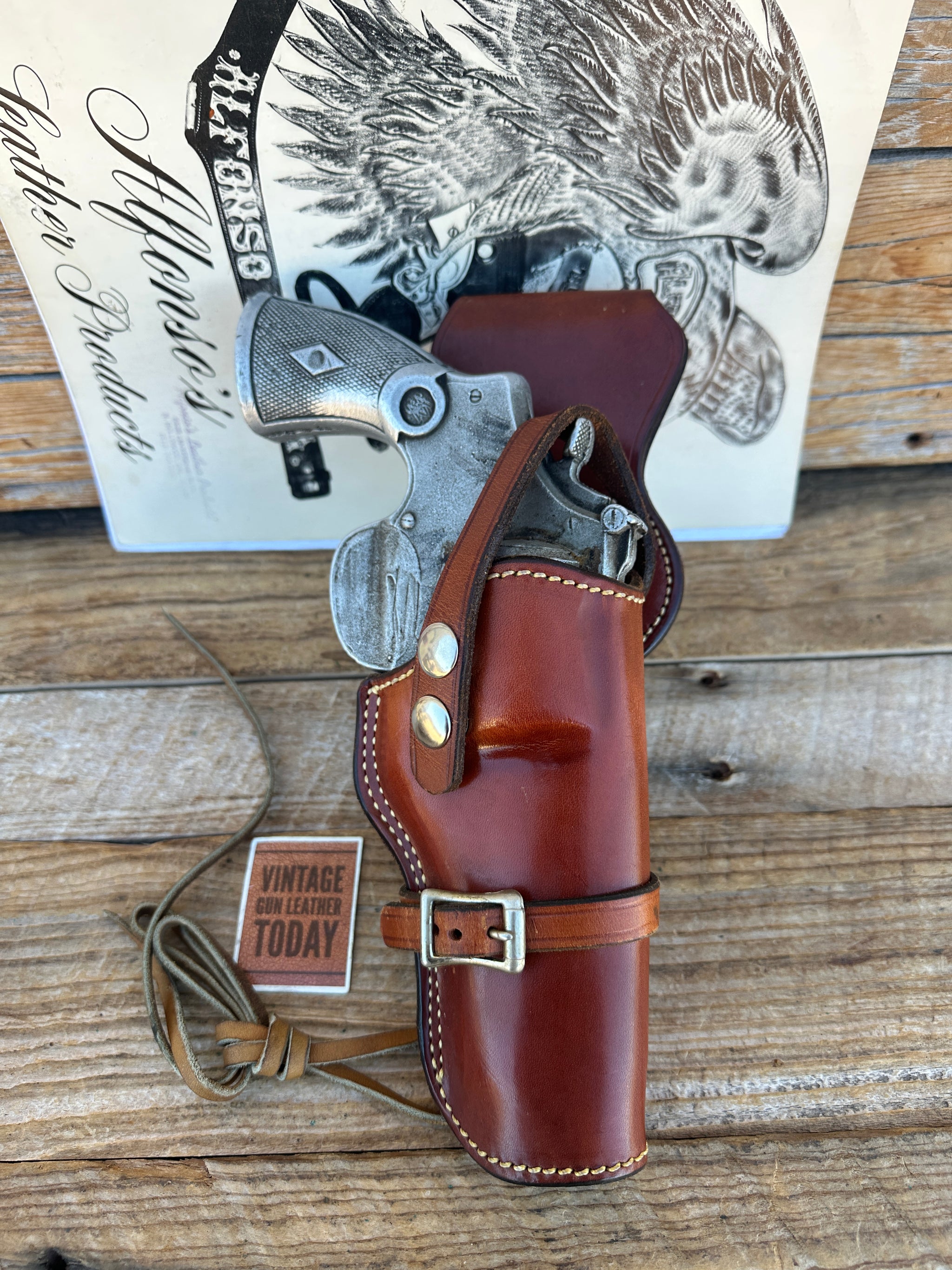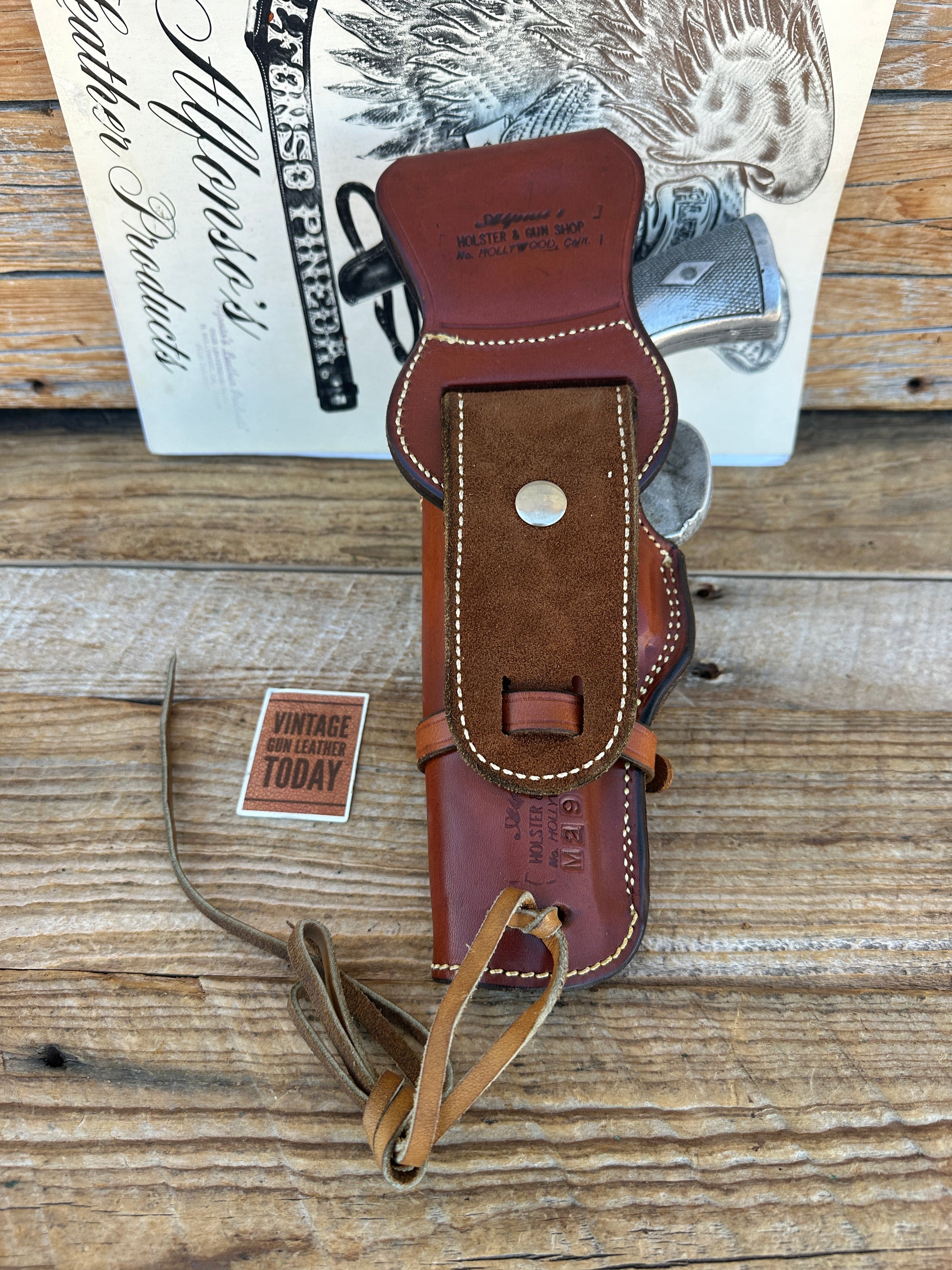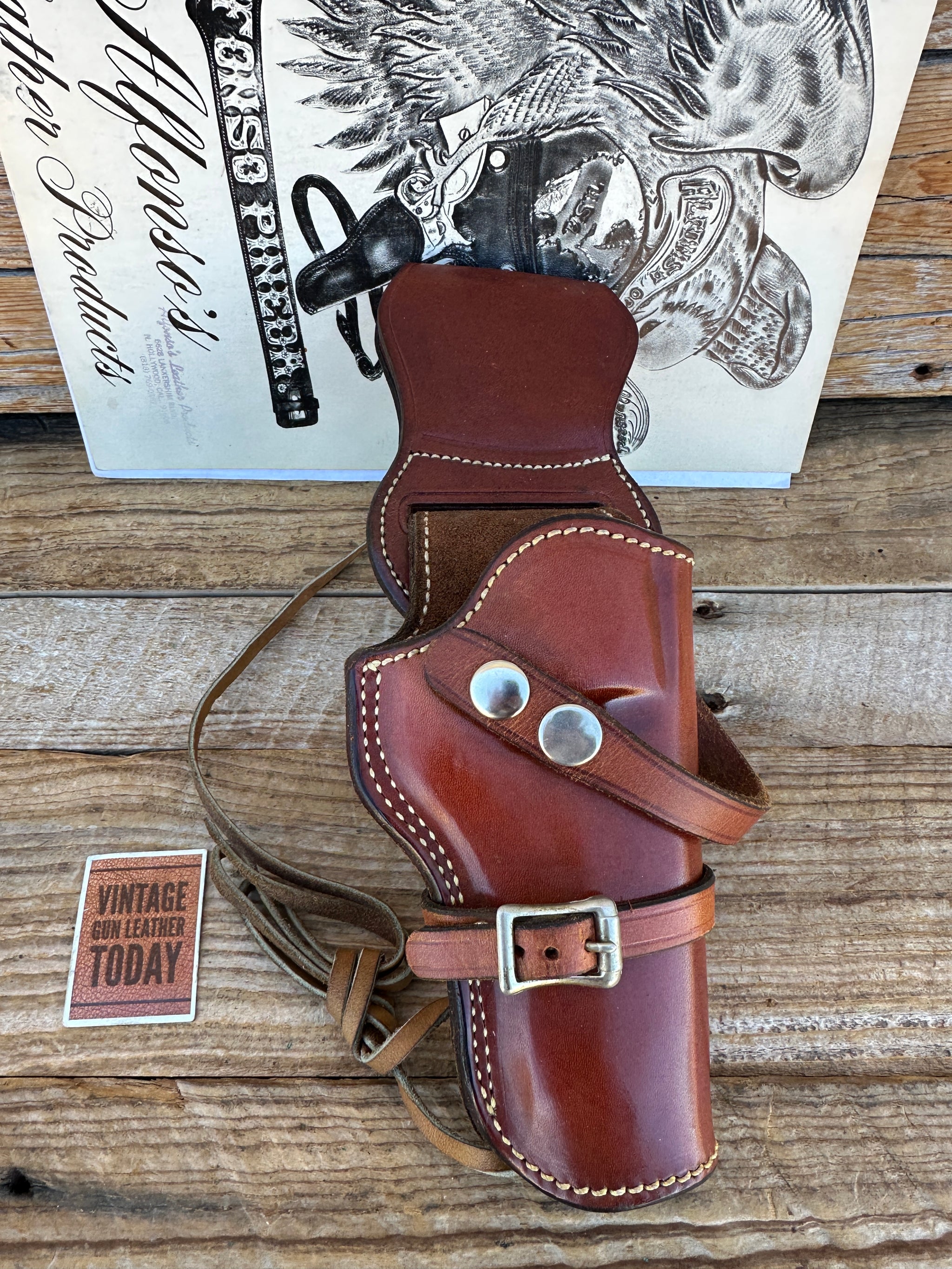 Alfonso's of No. Hollywood Calif. Western Sportsman Rig. Rig is brown leather, white stitched with nickel hardware. This holster easily and quickly converts from a low draw to a high draw or even a Shoulder rig. Should you add a shoulder strap which is not included. Included is a drop hanger, suede leather lined and backed holster and rawhide leg thong. This is in like new condition..