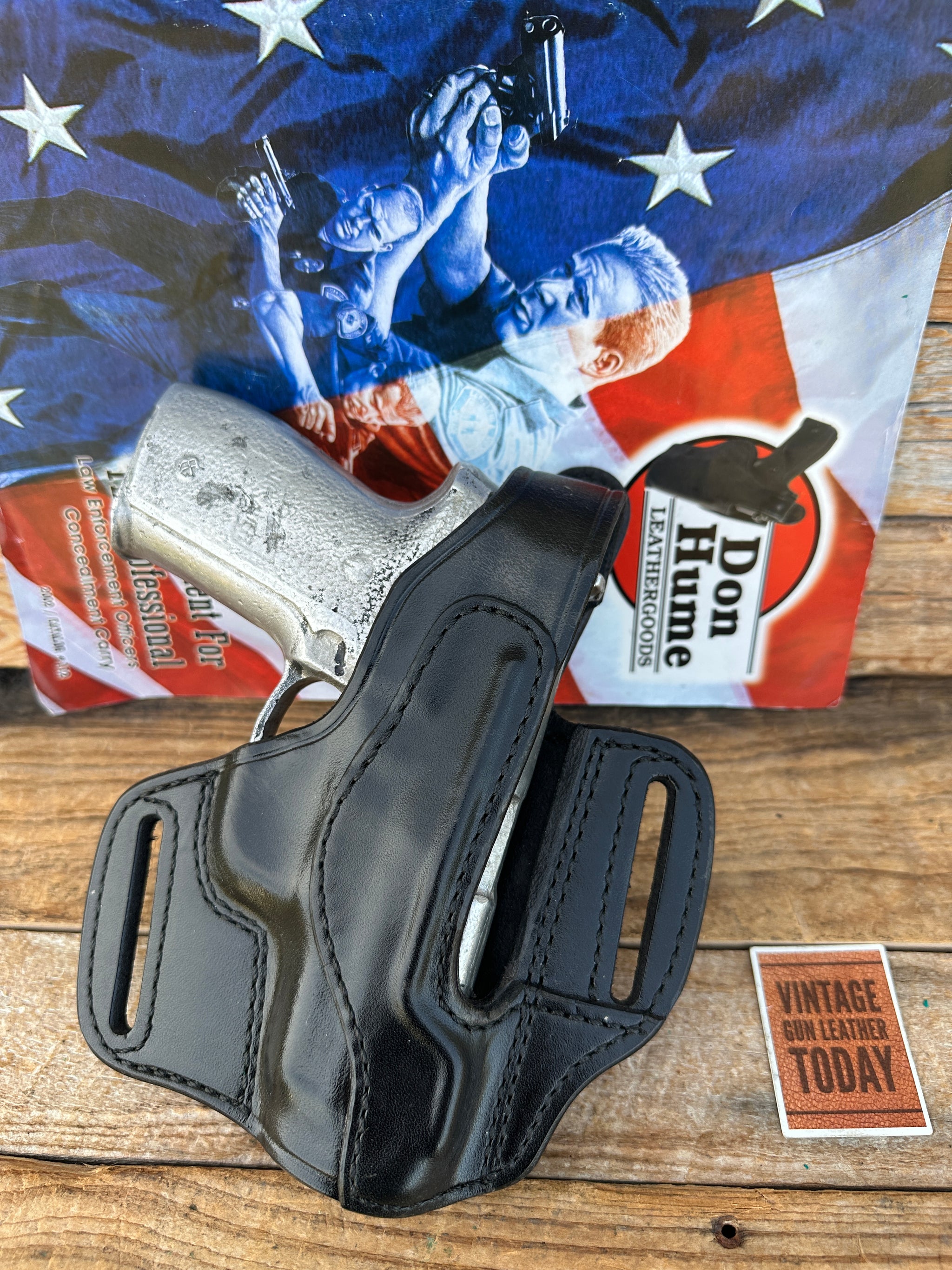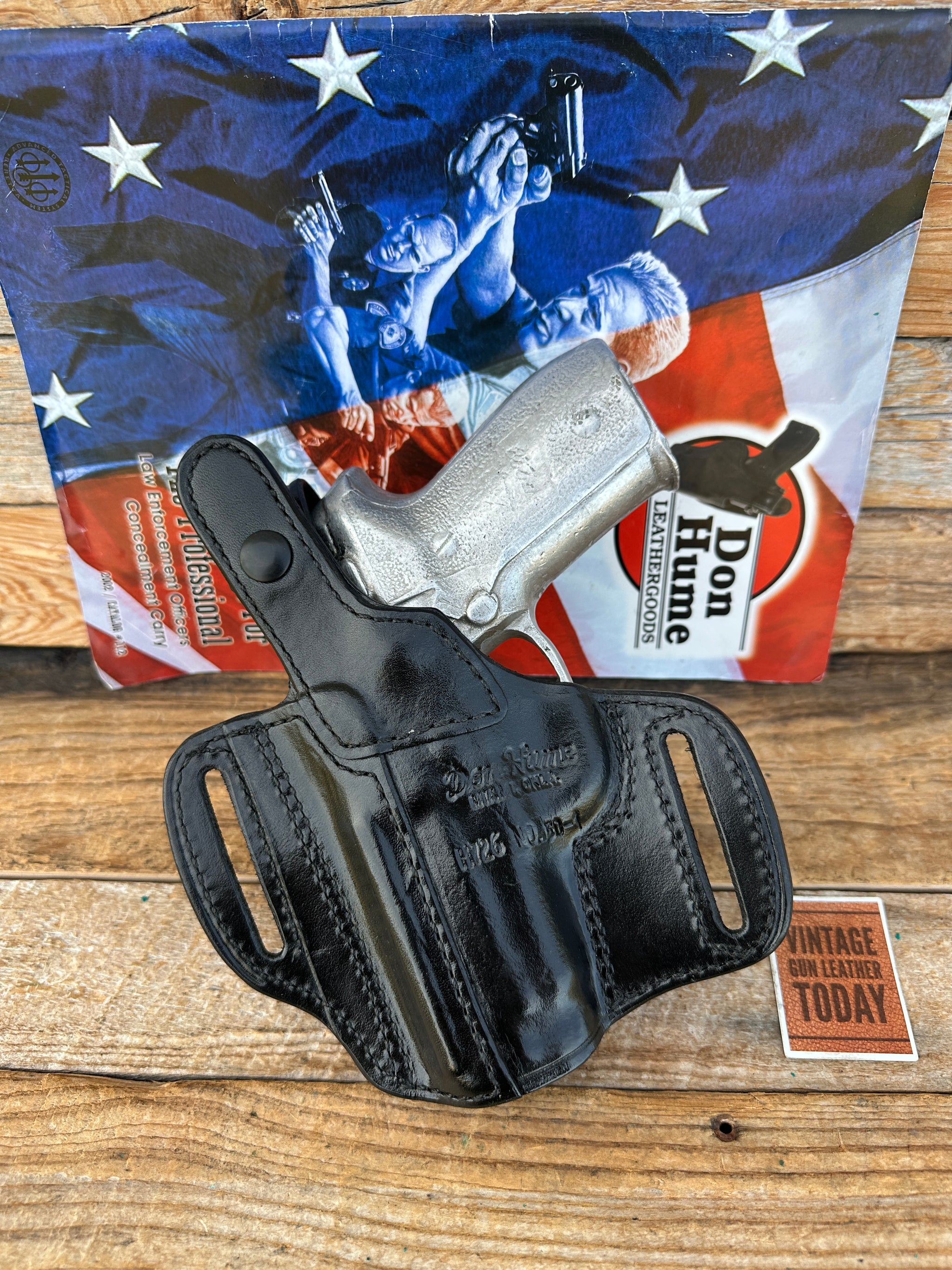 Vintage new old stock Don Hume Optics Ready H726 NO. 30-1 black leather holster with open 2 1/4" slots. Holster is for the Sig Sauer P228 or P229. This will work properly with or without optics.