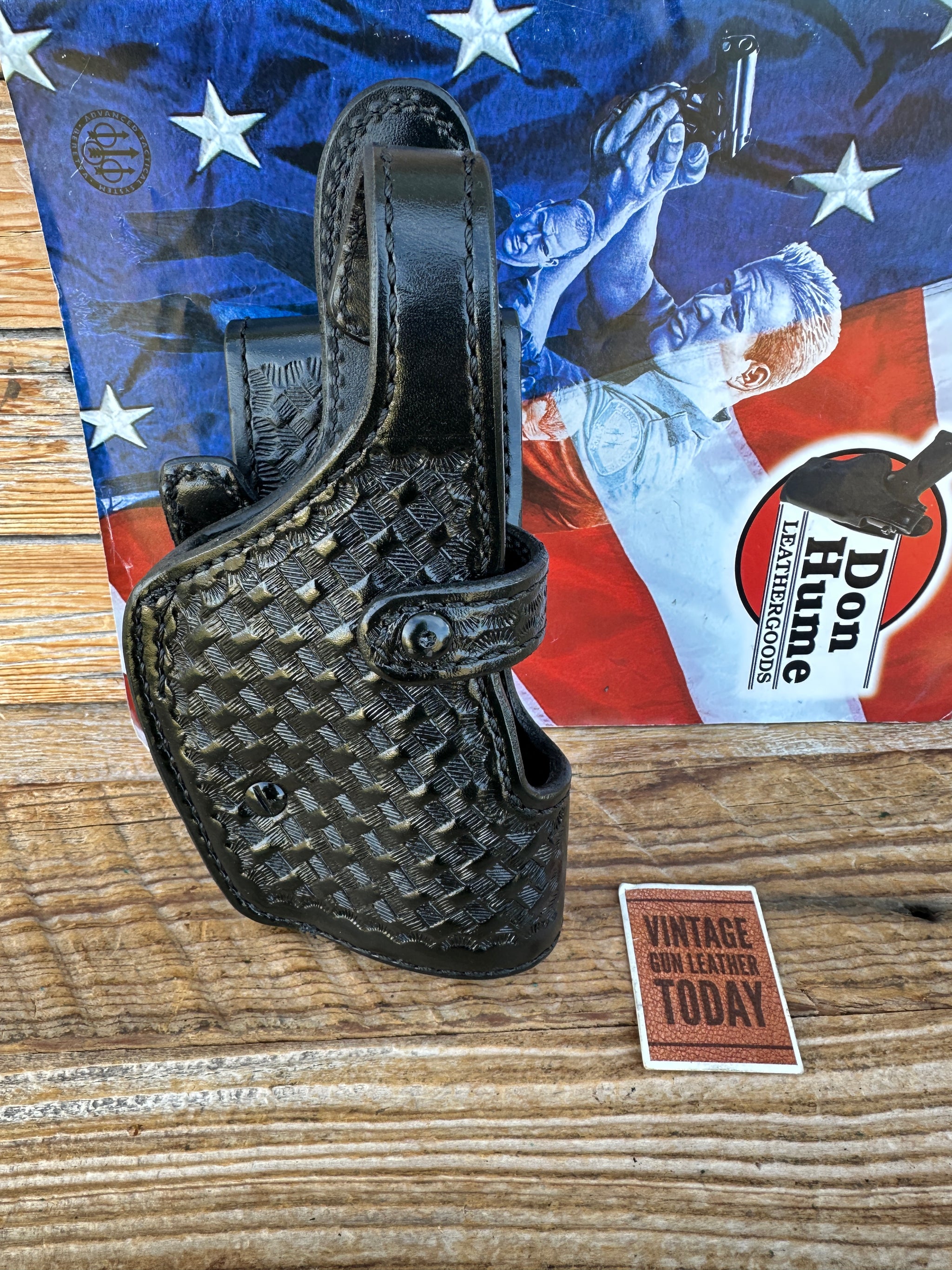 Holster is Don Hume black basket stamped leather and smooth leather lined. Holster will fit a standard 2 1/4" duty belt and can be locked in position with a locking screw. Very solid well made holster to last a career..