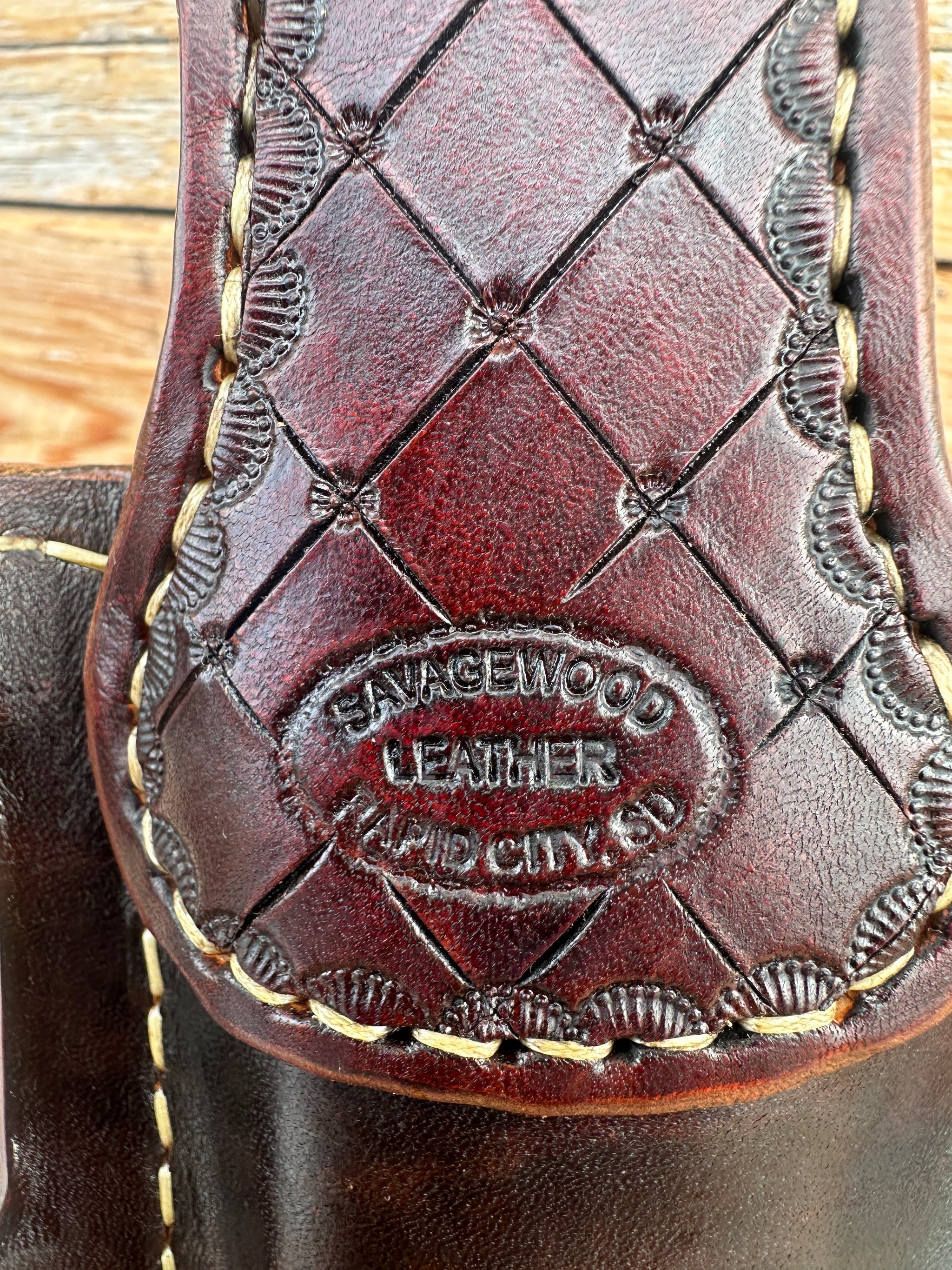 Savagewood Leather, Rapid City SD OWB holster. Holster is Right draw for a Sig P365. This is brown leather with stamped overlay and slots for a belt up to 1 1/2". very compact and concealable holster. Leather, stitching and hardware all in very close to new condition..