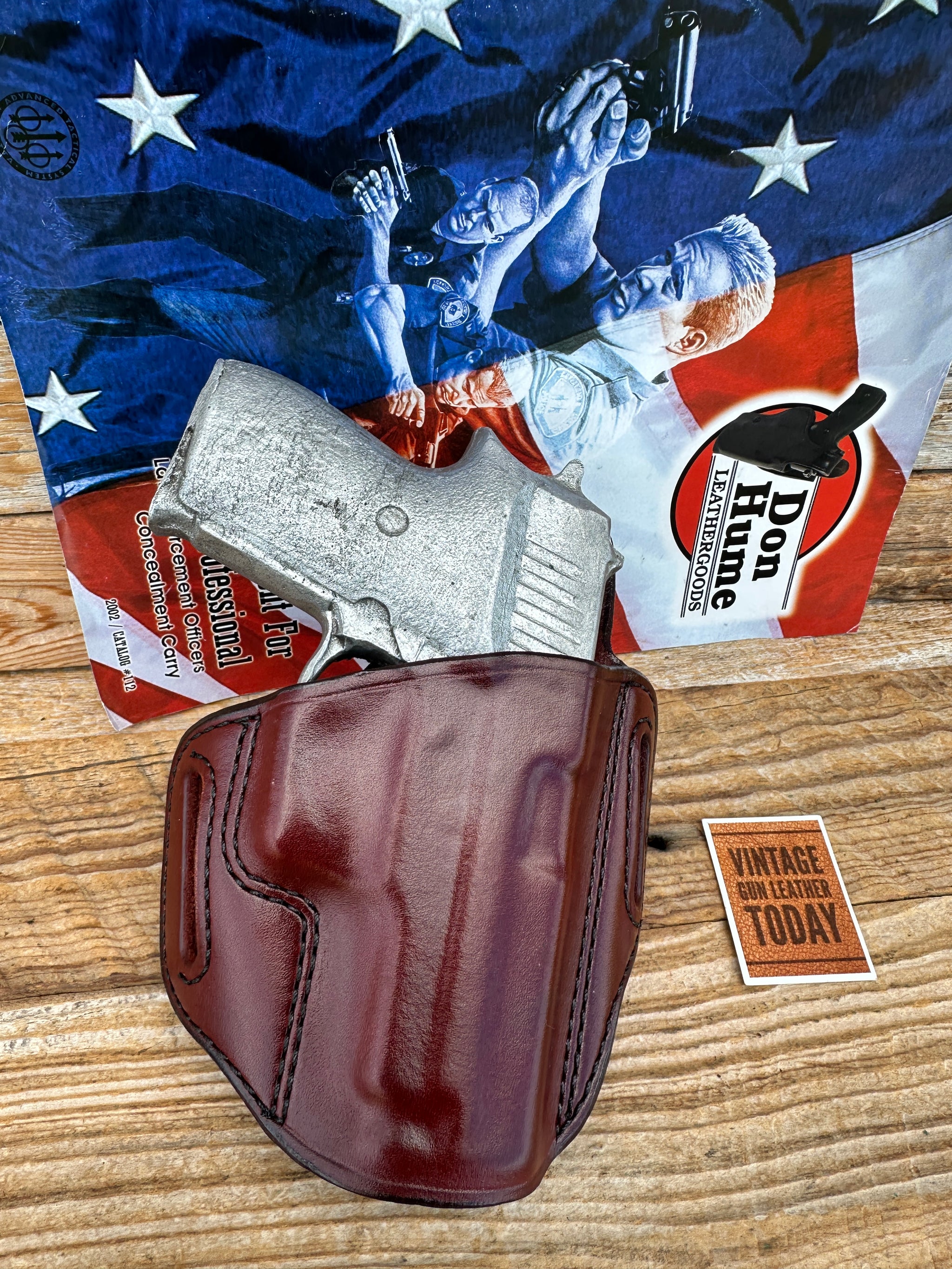 Vintage new old stock Don Hume H721 NO. 30-45 Double 9, black / brown leather open top holster with covered / open belt slots. Holster is for a Sig Sauer P245. This holster is no longer offered by Don Hume. A time of listing we have both Right and Left draw available.