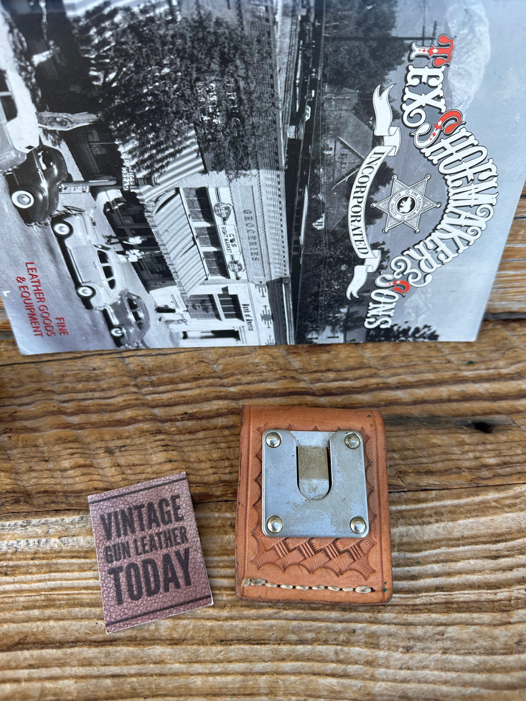New Old Stock natural brown basket stamped leather portable radio holder. Holder opening measures 1/2" wide x 1" high. Loop fits a belt up to 2 1/4". Holder is basket stamped but you can't see the finish when you are wearing it so if all you can use is plain leather this will work. Holders are very solid and well made..