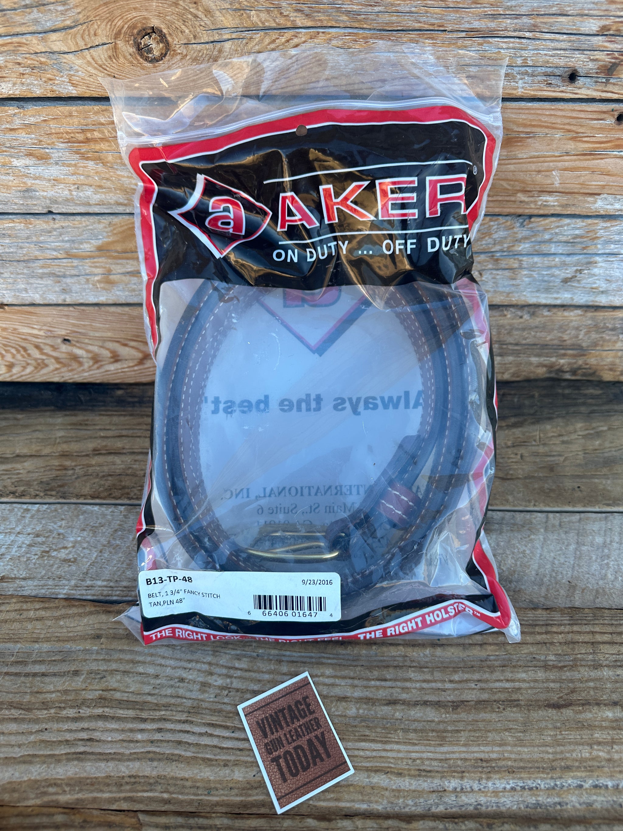 NEW, AKER brown fancy stitched leather 1 3/4" gun belt size 48. Belt measures 45 1/2" to 49 1/2" measuring from leather end prior to solid brass buckle.