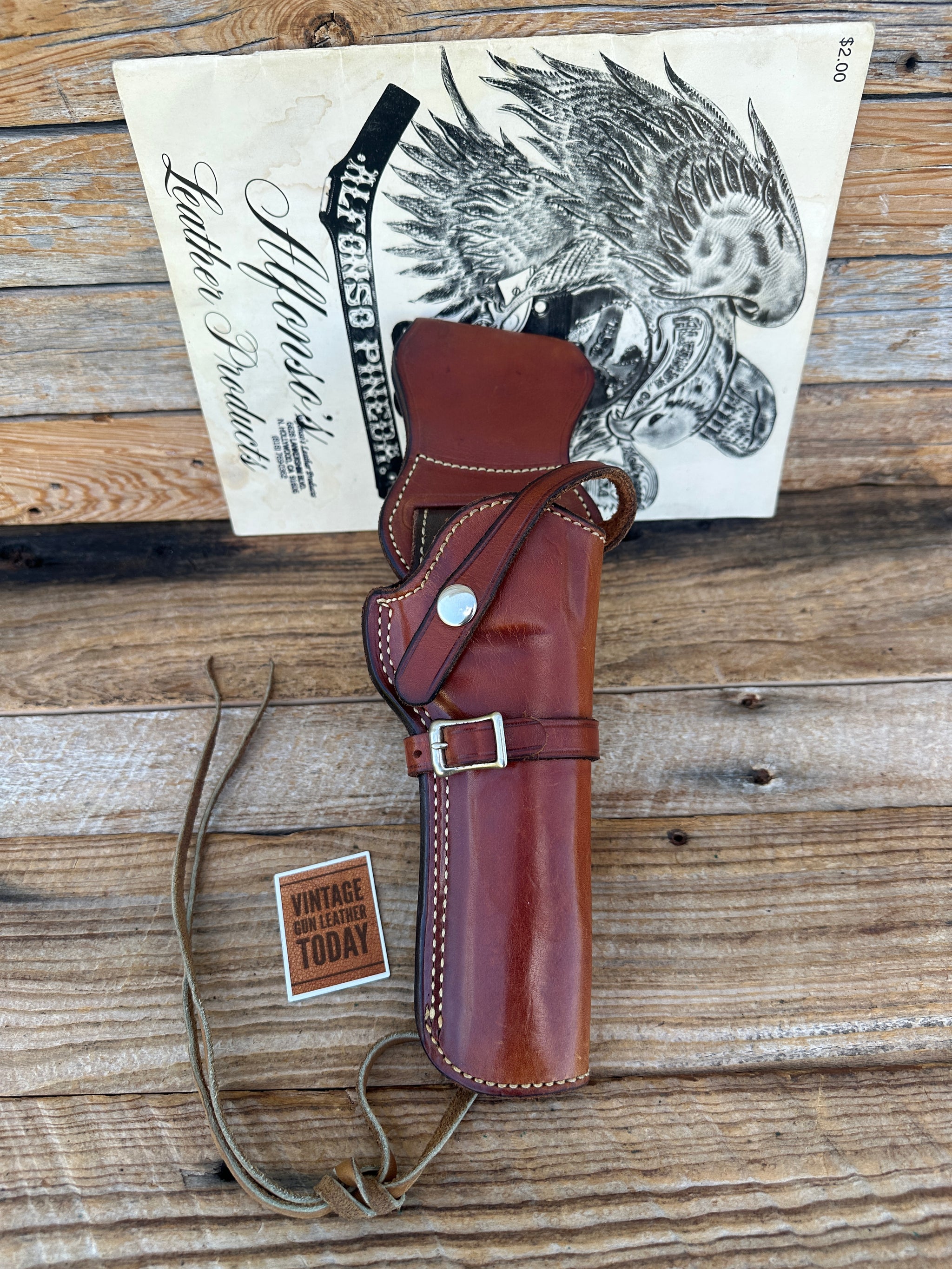 New Old Stock Alfonso's of No. Hollywood Calif. Western Sportsman Rig. Rig is brown leather, white stitched with nickel hardware. This holster easily and quickly converts from a low draw to a high draw or even a Shoulder rig. Should you add a shoulder strap which is not included. Included is a drop hanger, smooth leather lined and backed holster and rawhide leg thong.
