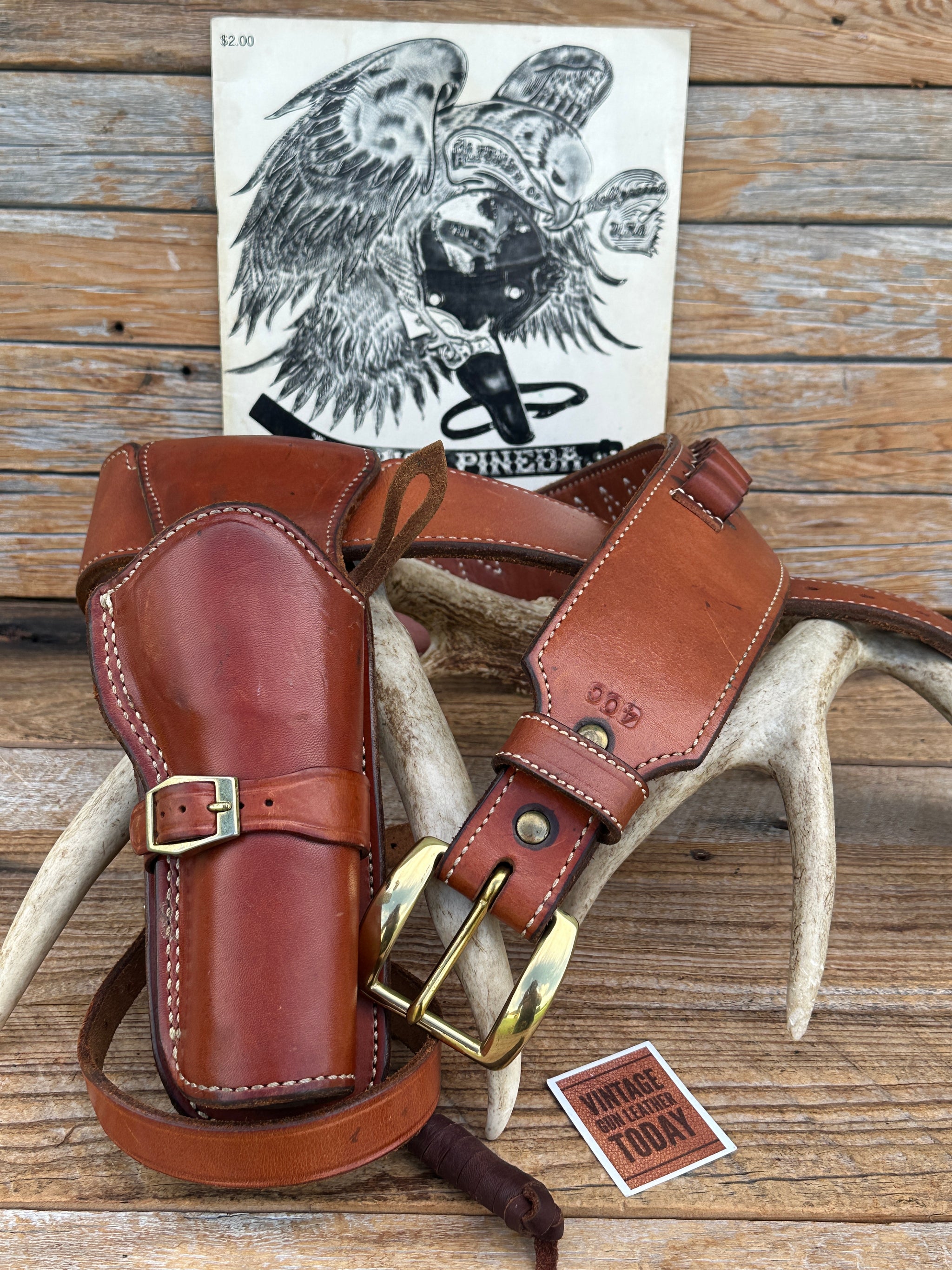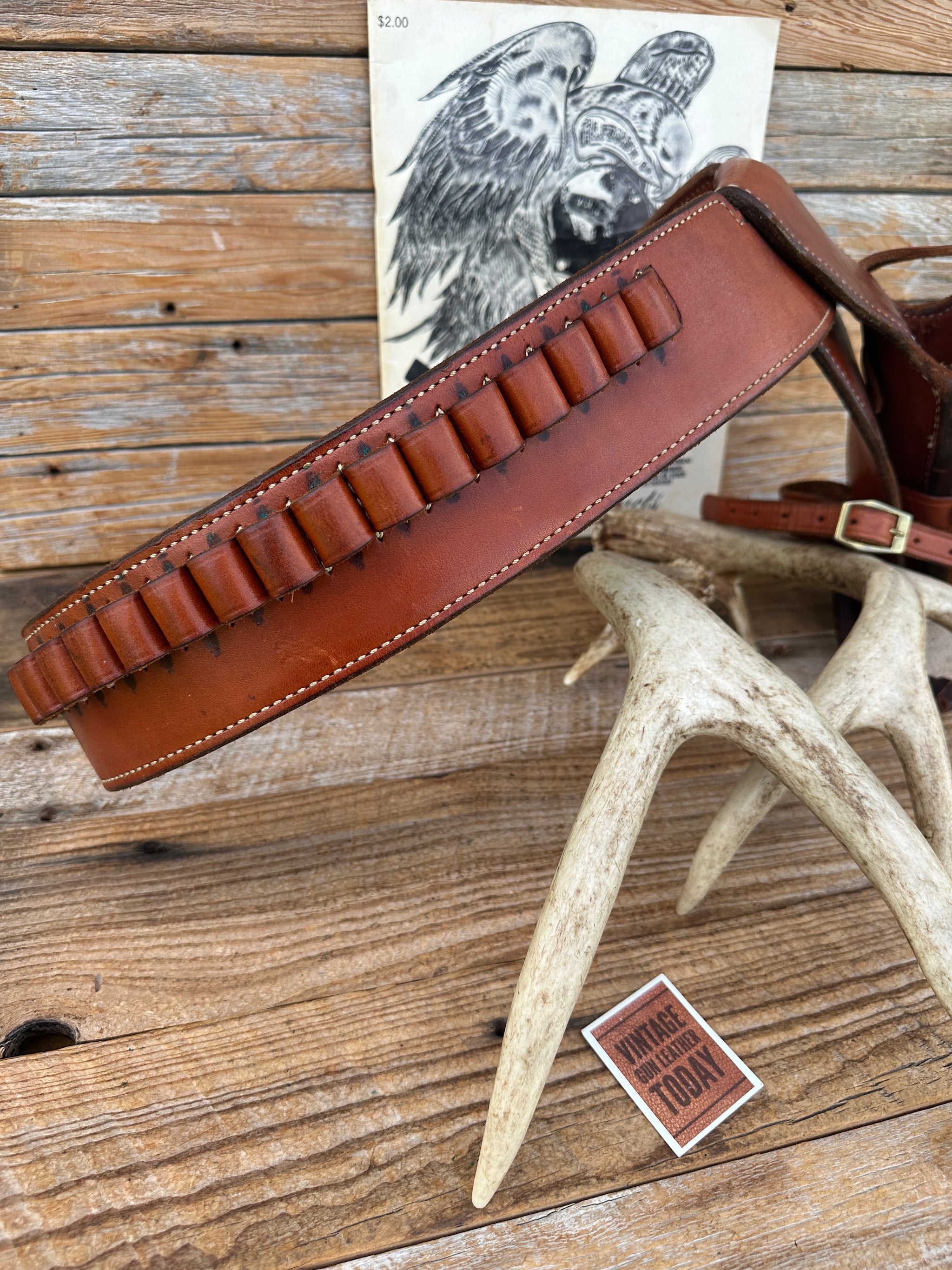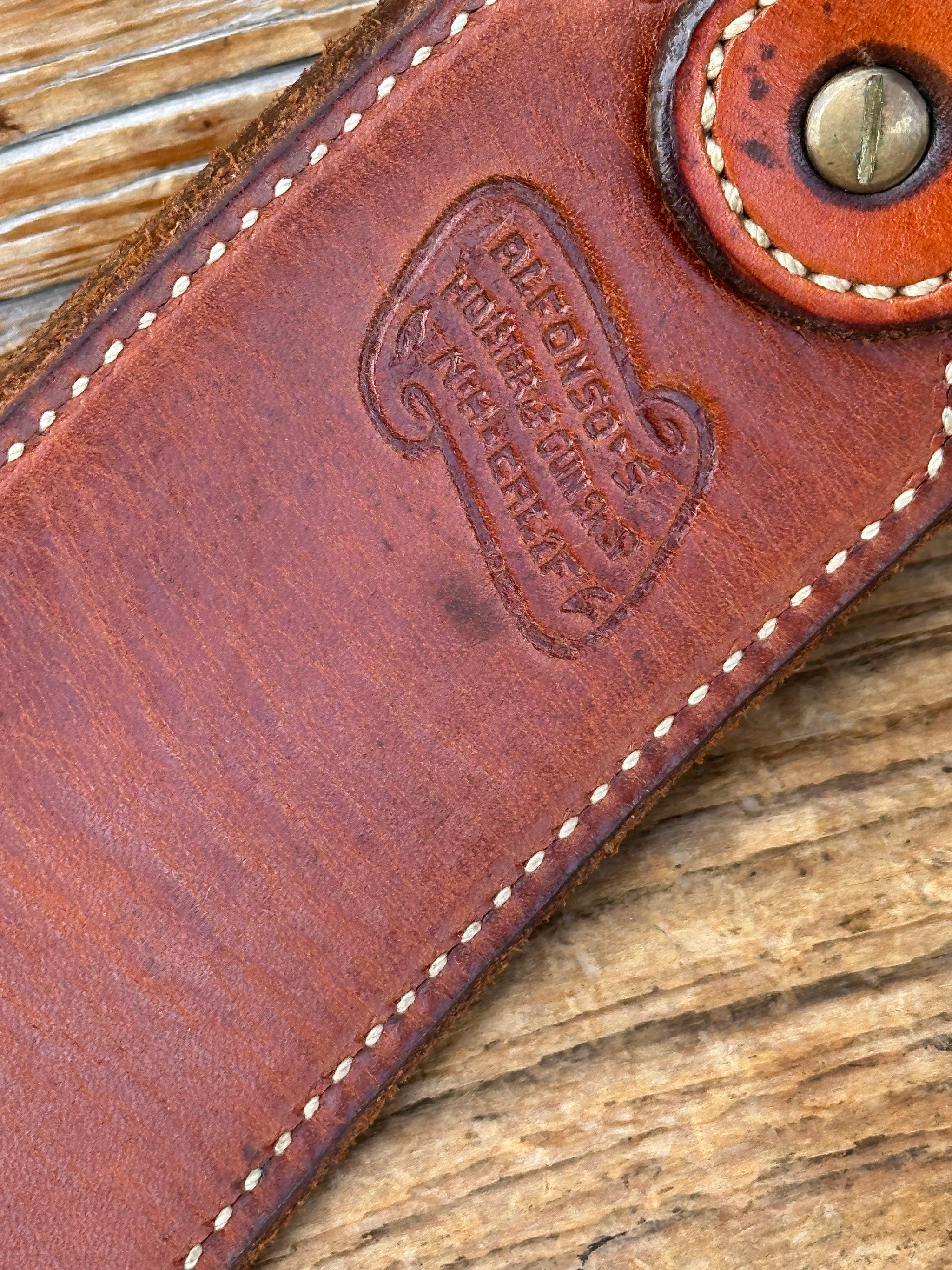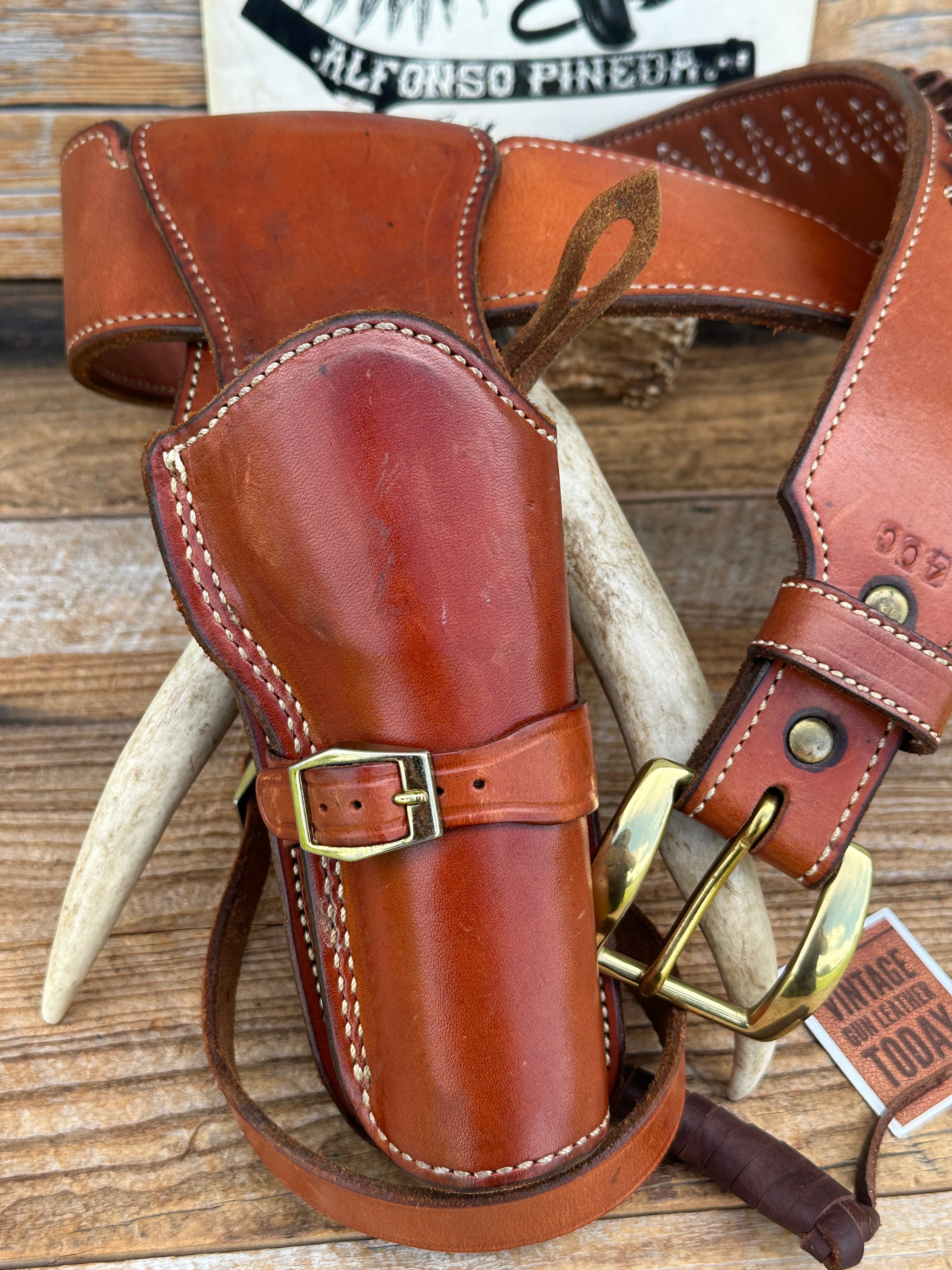 Beautiful vintage Alfonso's Model A8 Star Model Fast Draw Rig, designed for ease of draw and neat appearance. Gun belt is brown leather, white stitched, smooth leather lined with solid brass buckle. Belt is a size 40 measuring 37" to smallest setting and 42 1/2" to largest setting (Please read sizing below). This is measuring from the leather end prior to buckle. Belt is notched for holster, 2 1/2" wide and tapered down to 1 1/2" at end. There are 25 cartridge loops for .45 Long Colt.