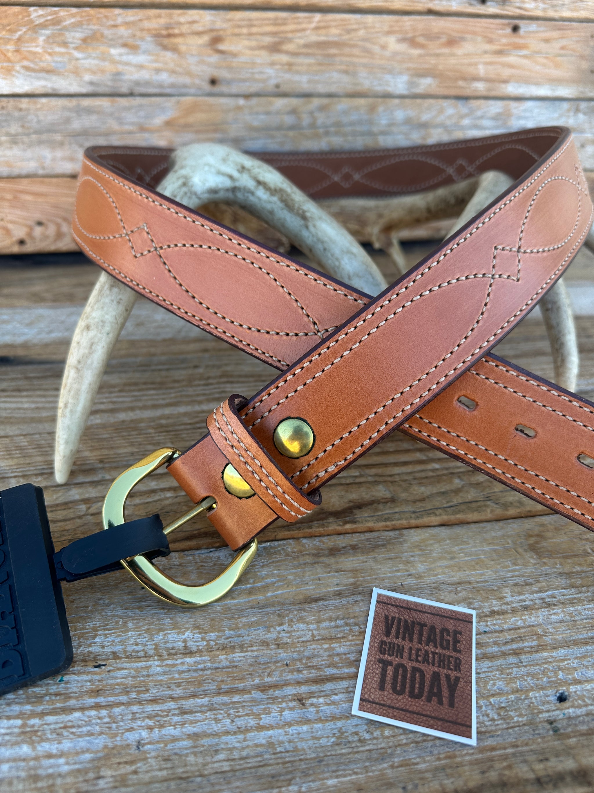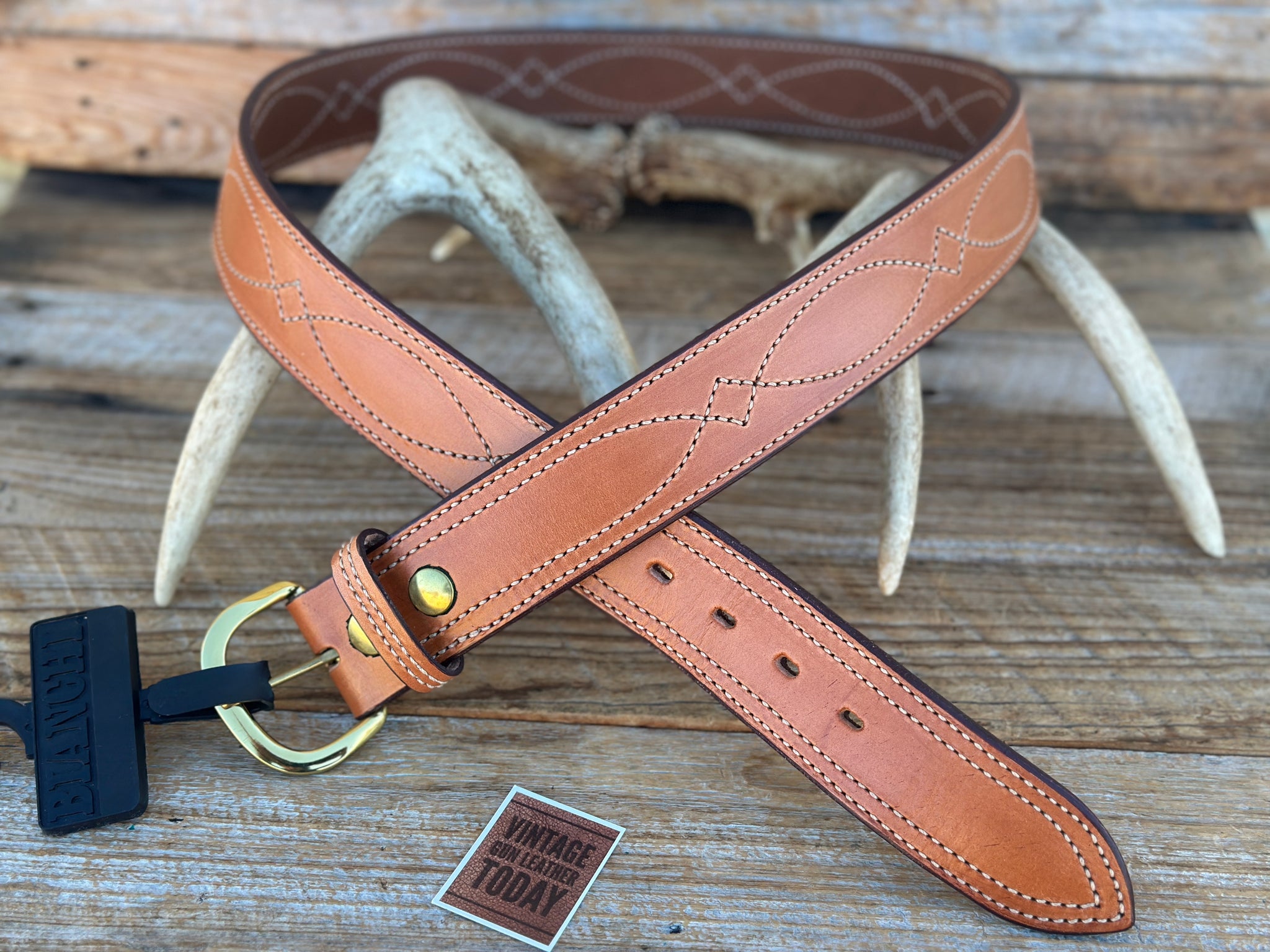 New Bianchi B9 brown leather fancy stitched gun belt. This is a size 48 1 3/4" wide belt, measuring 43 1/2" to the smallest setting and 47 1/2" to largest setting measuring from leather end prior to buckle.