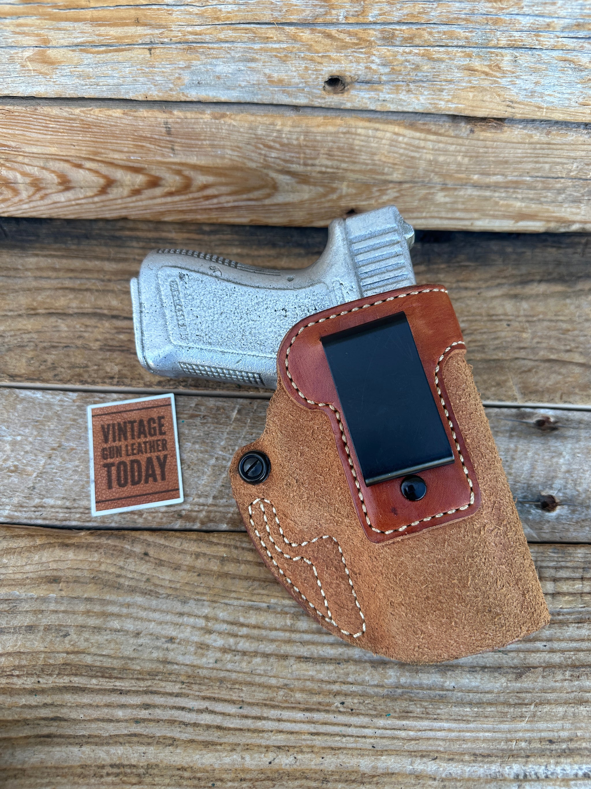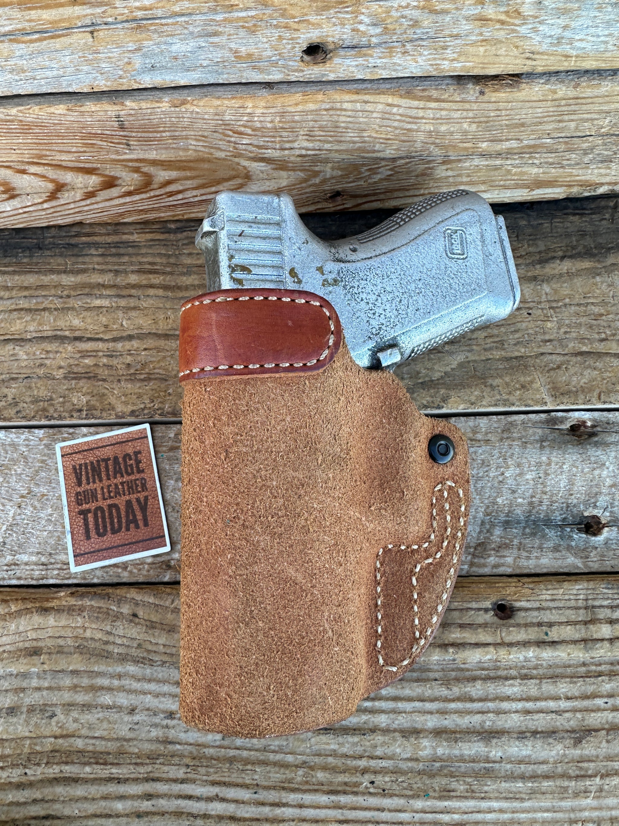 Brown leather IWB holster with tension screw, reinforced opening and 2" belt clip. Holster Right draw is for a GLOCK 26, 27 or 33. Nicely made, concealable holster. Leather, stitching and hardware all in very nice condition..