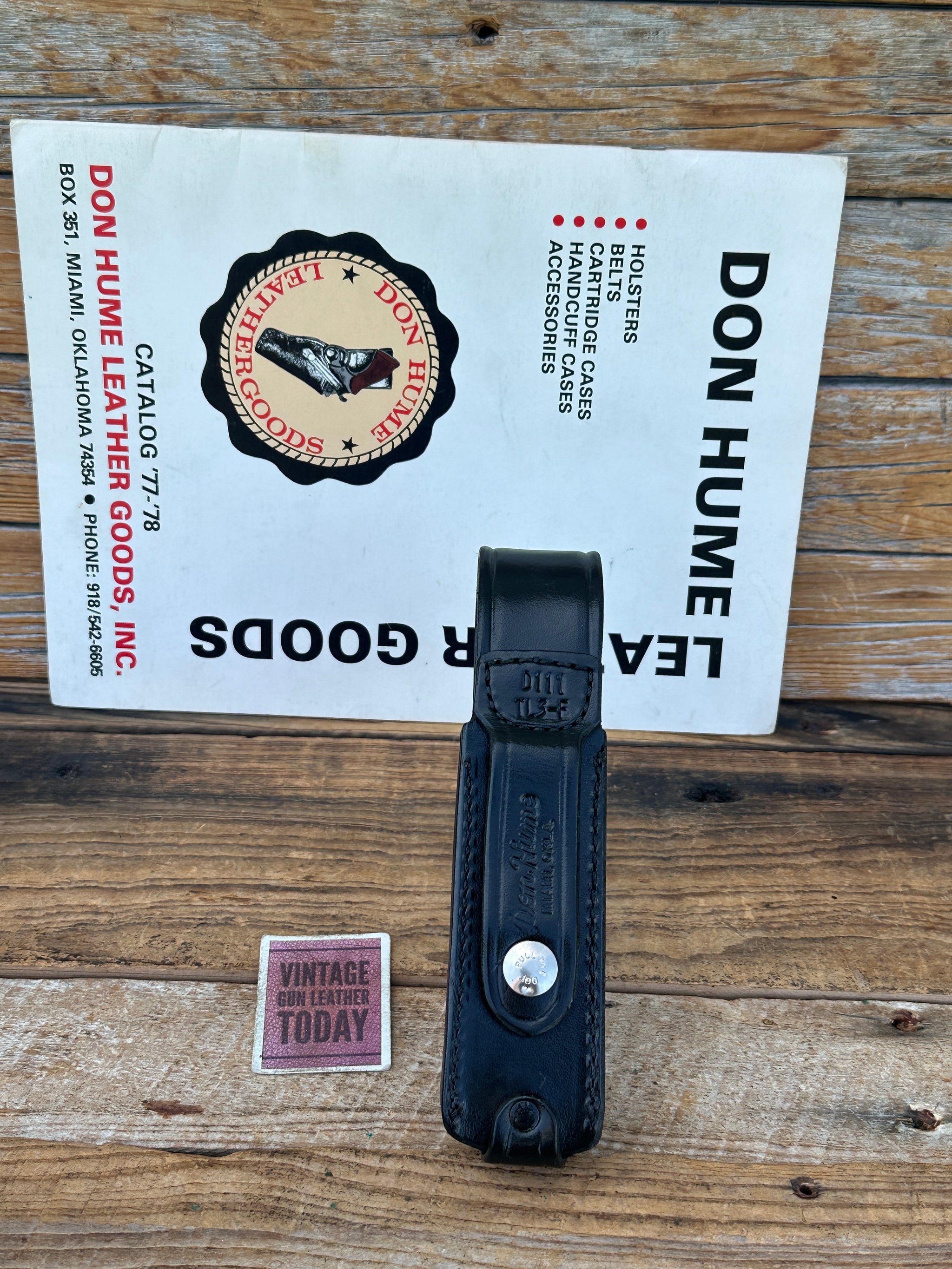 Vintage new old stock Don Hume D111-TL3 F plain black leather flashlight carrier with Nickel hardware and 2 1/4" belt slot with directional snap. Carrier will fit a flashlight 1" in diameter and up to 6 1/2" in length.