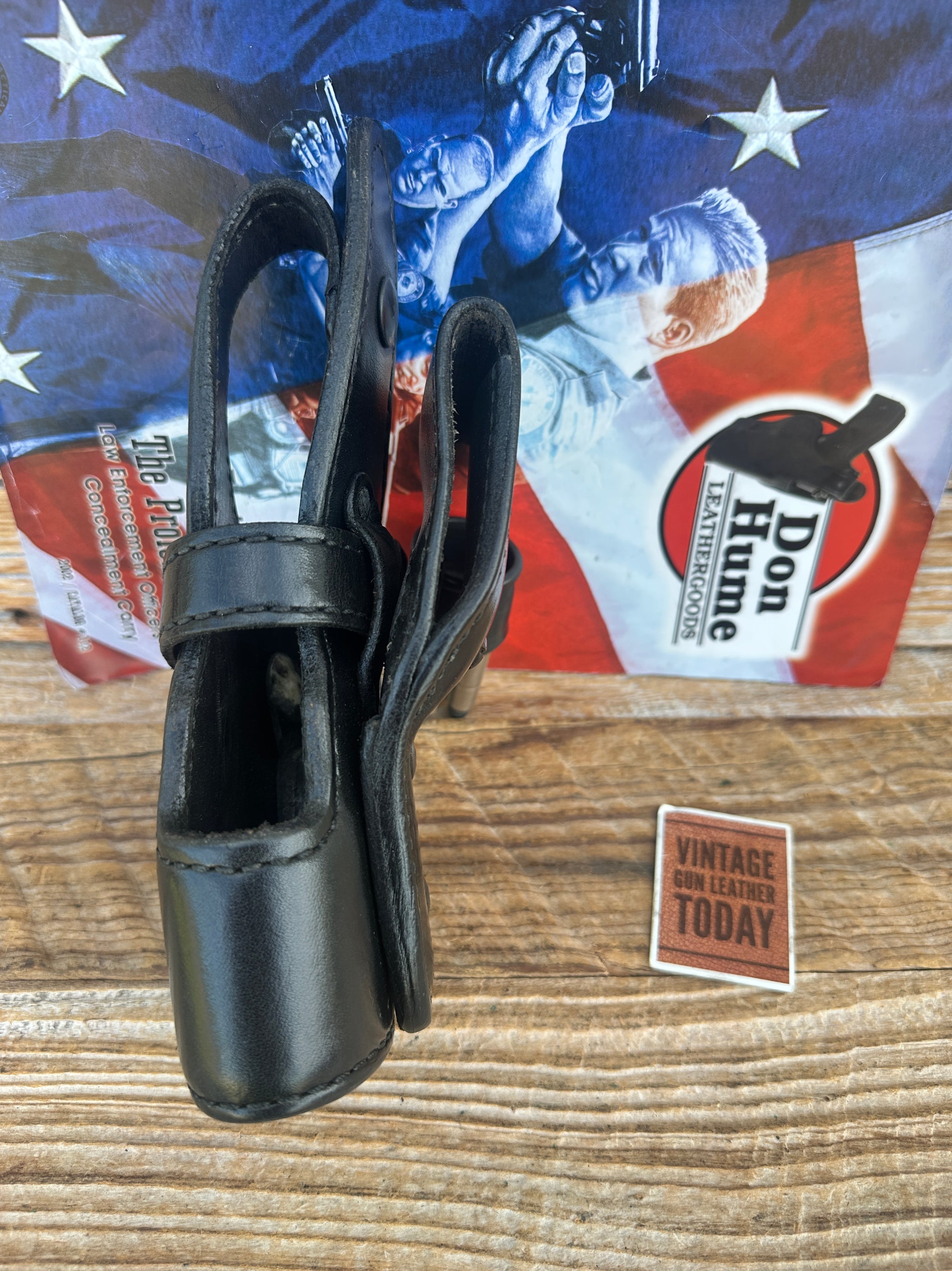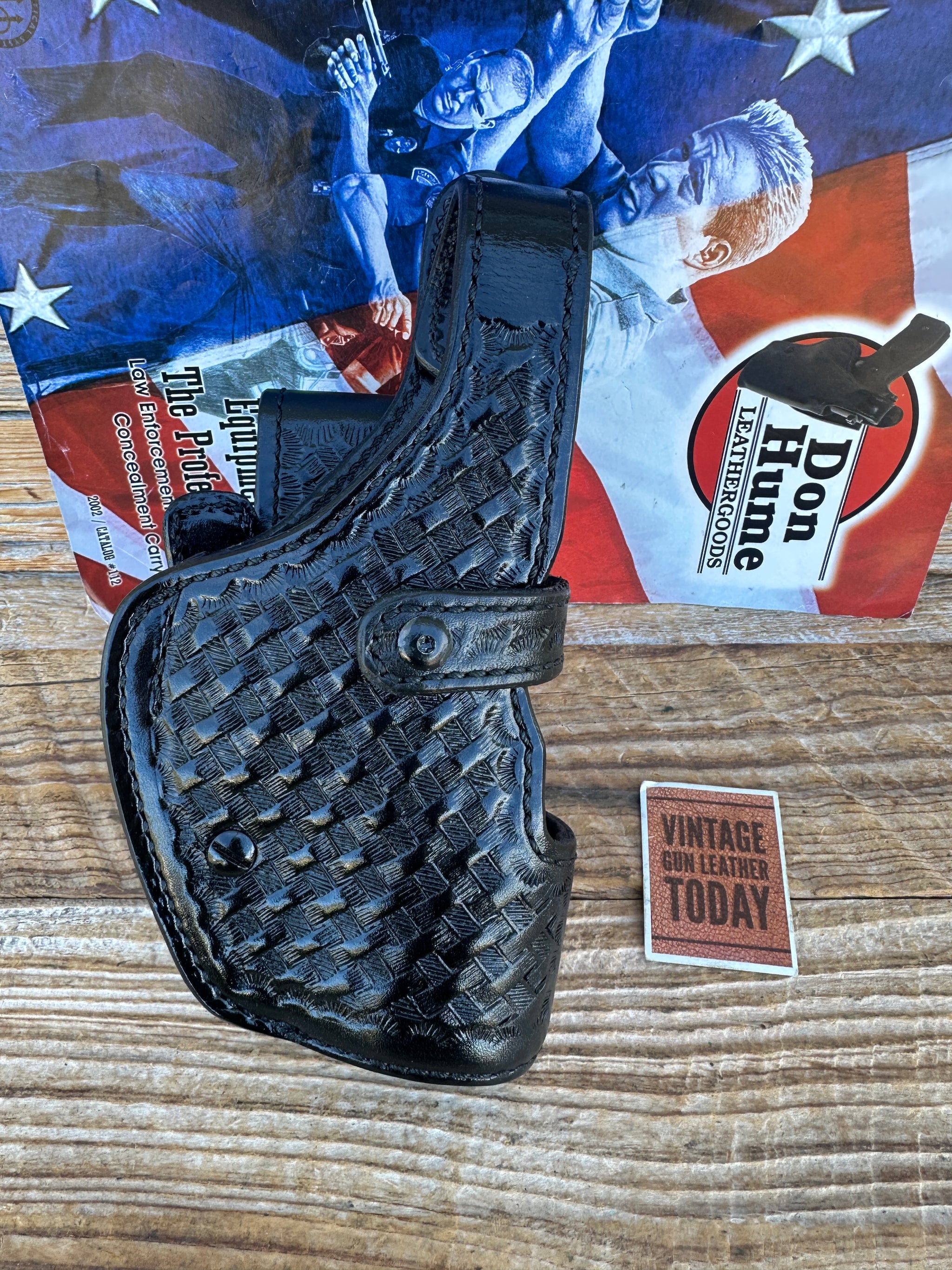 Holster is Don Hume black basket stamped / plain leather and smooth leather lined. Holster will fit a standard 2 1/4" duty belt and can be locked in position with a locking screw. Very solid well made holster to last a career..