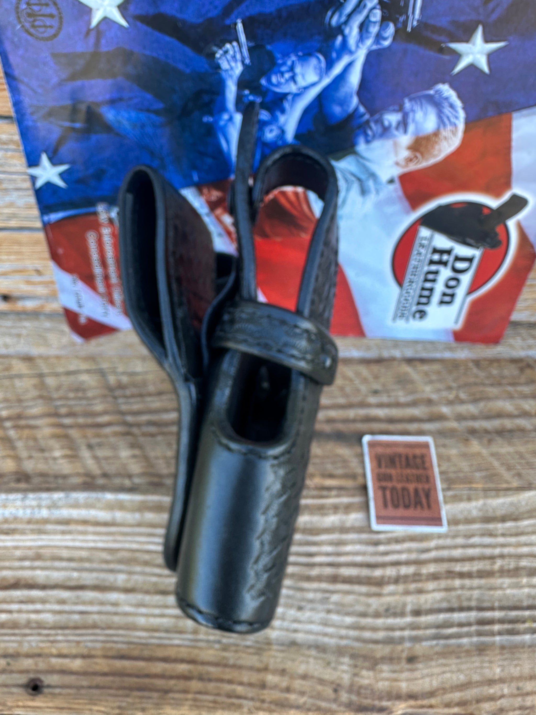 Holster is Don Hume black basket stamped leather and smooth leather lined. Holster will fit a standard 2 1/4" duty belt and can be locked in position with a locking screw. Very solid well made holster to last a career..