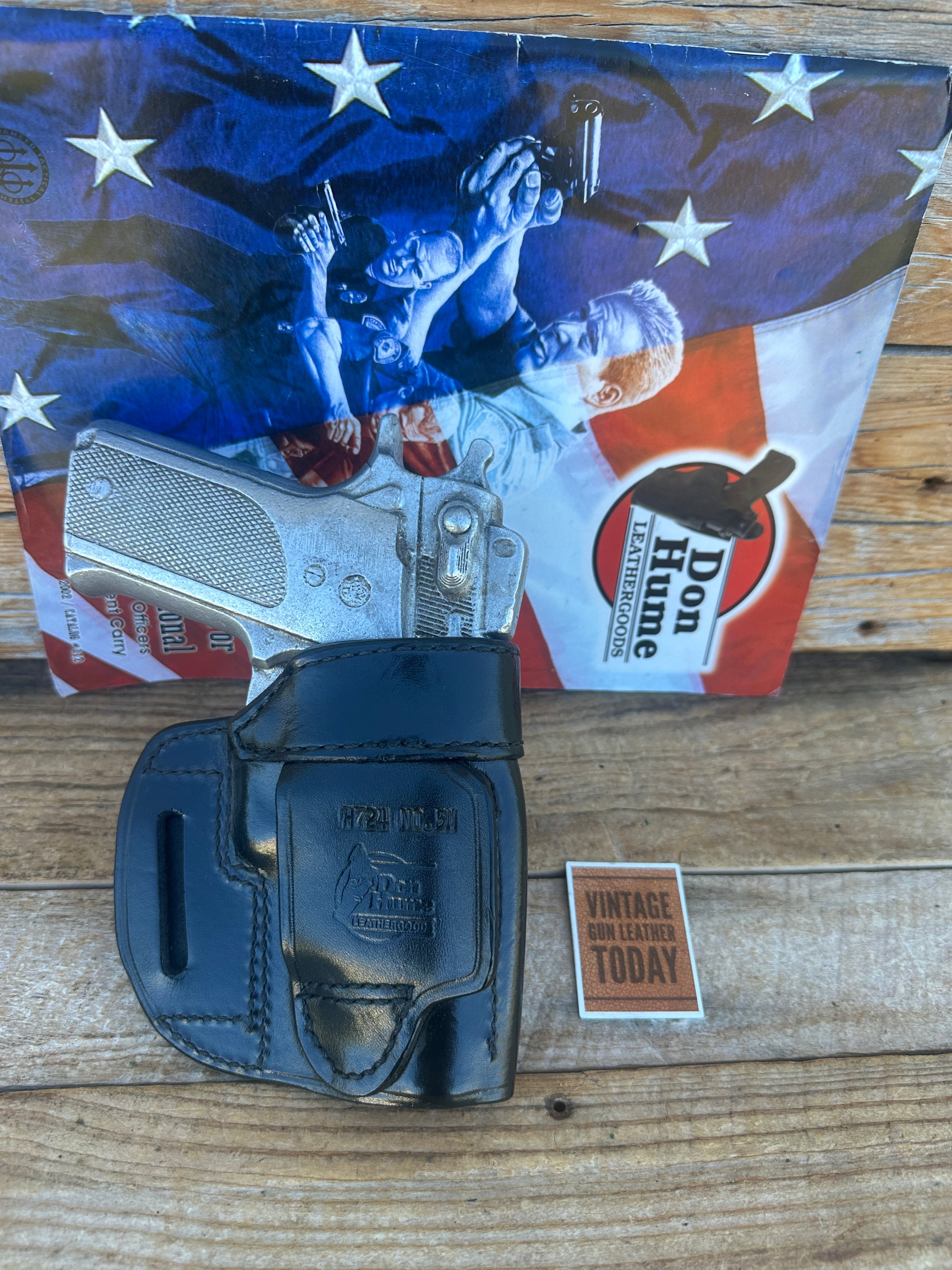 Vintage new old stock Don Hume Askins' Avenger style Holster H724 OT 5M. Holster is black leather and black stitched with sewn sight rail. This is for the following: