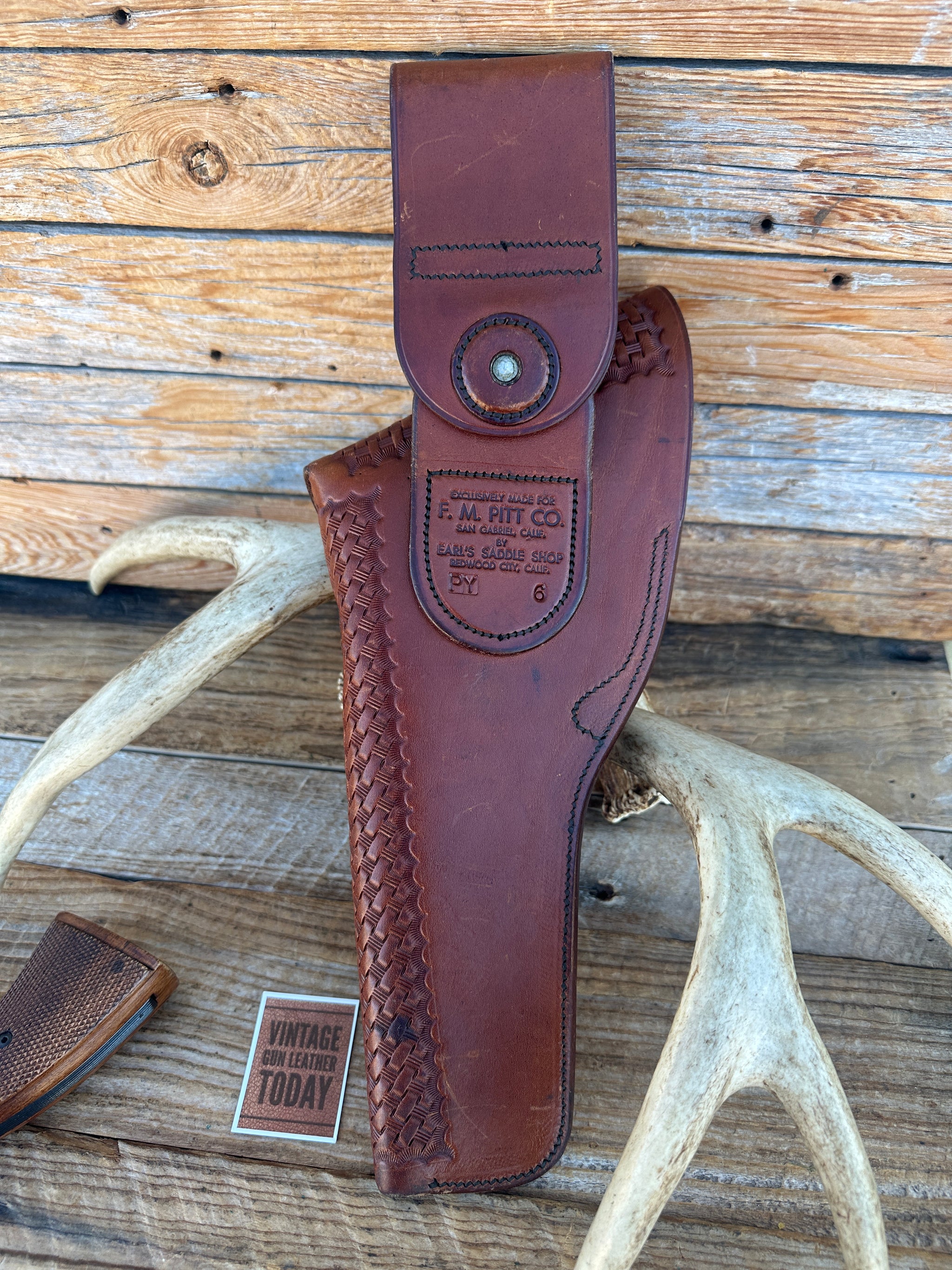 Beautiful vintage Earls Saddle Shop Hollywood California flap holster made for F.M. PITT, San Gabriel Calif. Holster is brown basket stamped leather with swivel. Hanger will fit a belt up to 2 1/4". This is for a Colt Python 6". This will also fit a Standard Smith & Wesson L frame revolver such as a 586, 686 or similar. Holster is in excellent condition with swivel functioning properly.