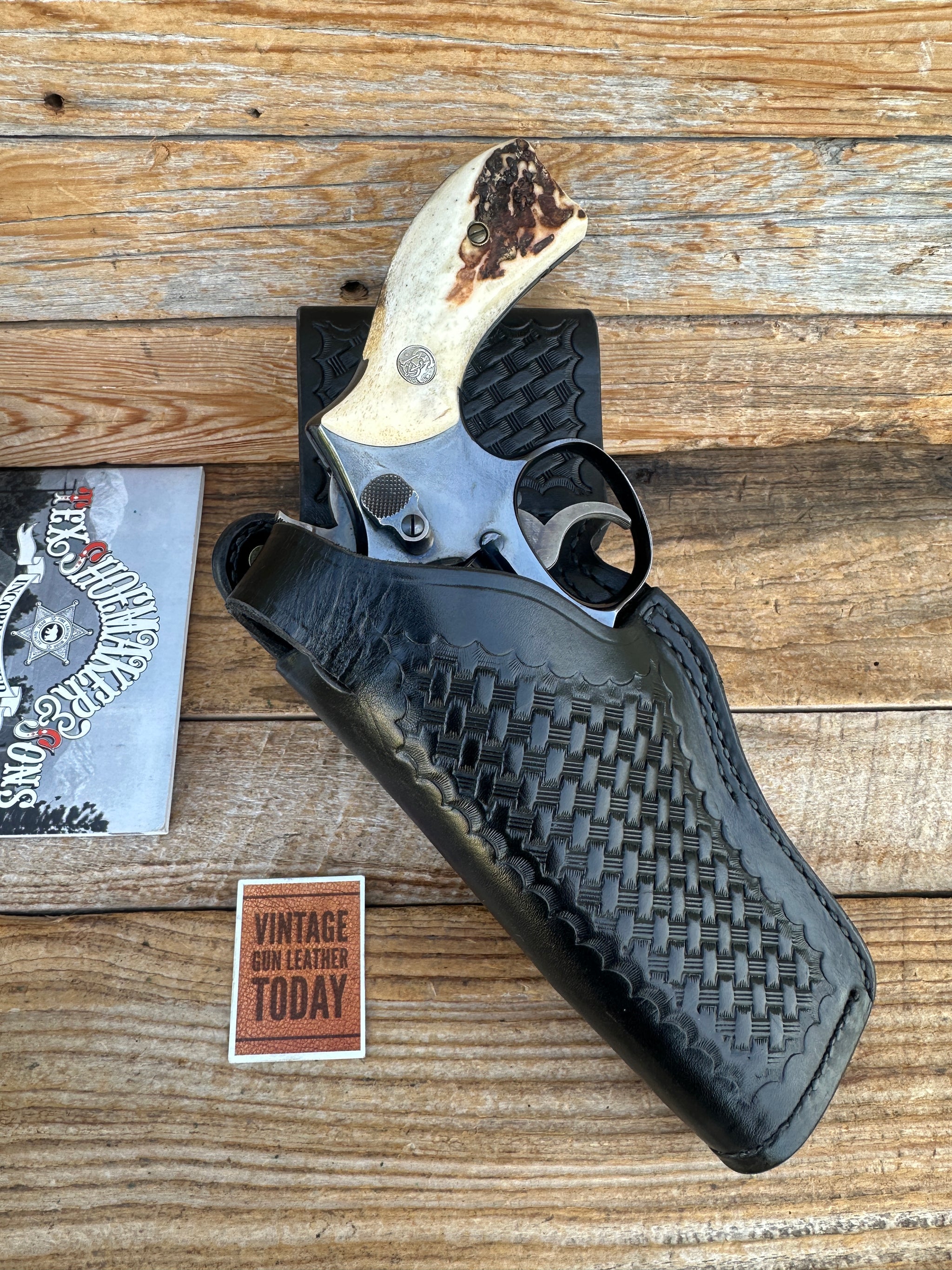 Tex Shoemaker 70's - 80's New Old Stock 35K black basketweave Border Patrol Style Holster. Holster fits a 4" S&W K Frame Revolver and is a Left draw. Hanger fits up to a 2 1/4" belt. This is the last of Tex Shoemakers New Old Stock..