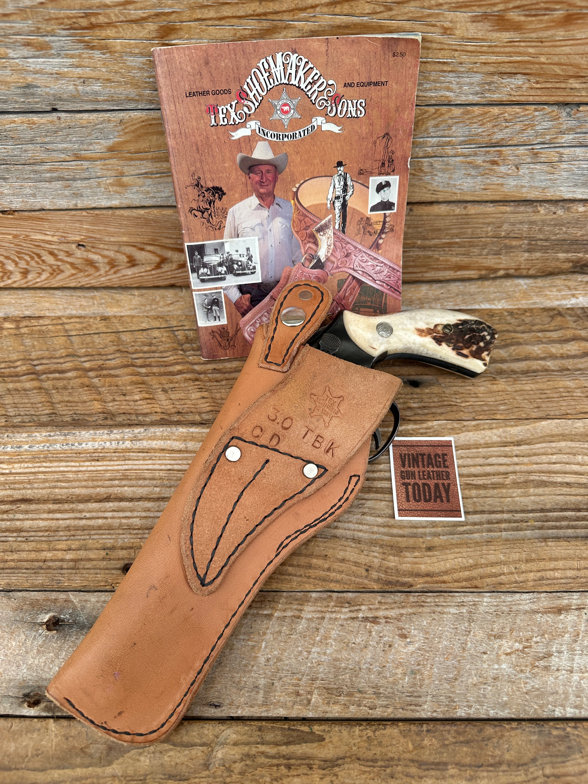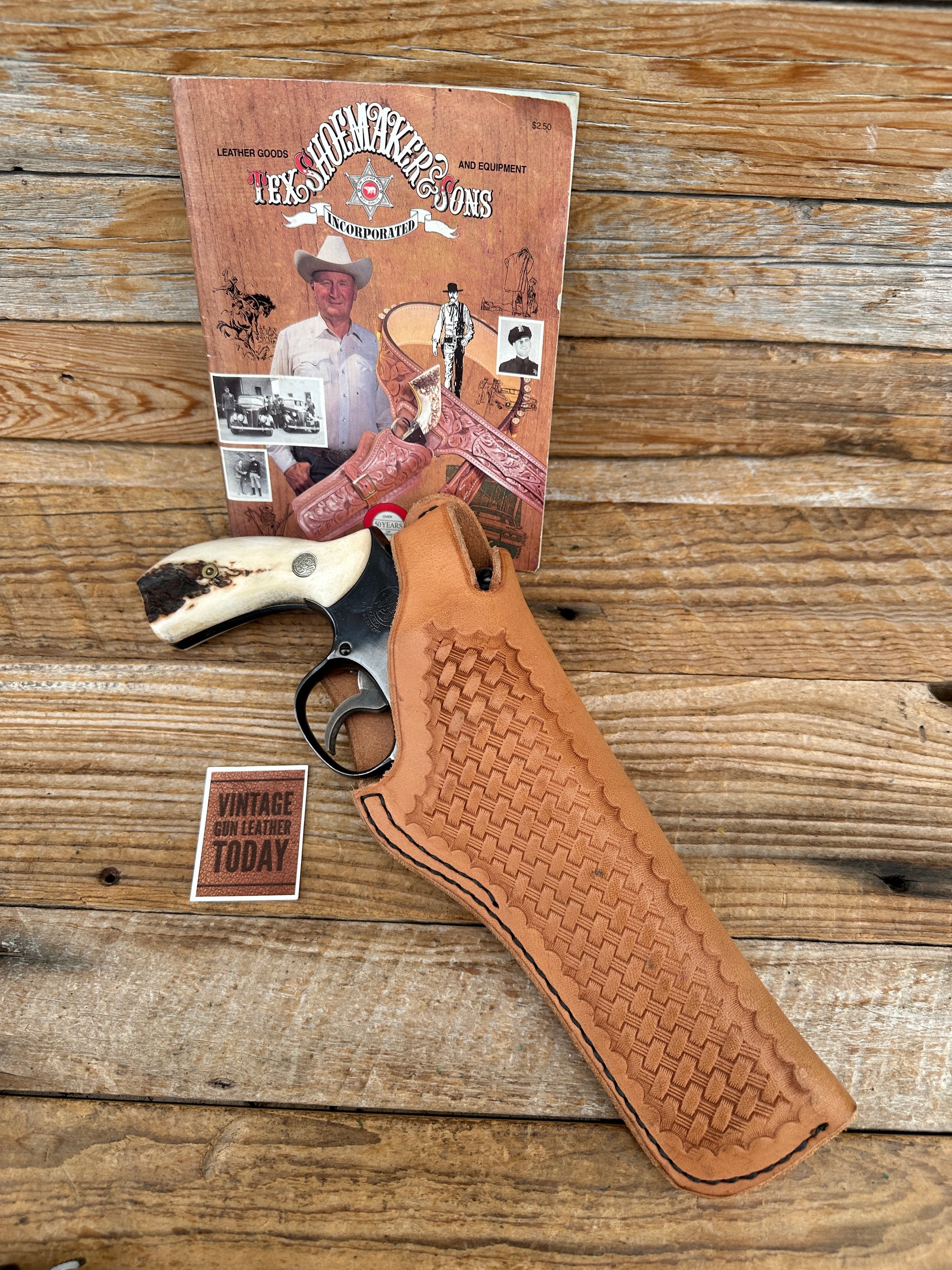 Vintage Tex Shoemaker 70's - 80's natural brown basket stamped leather holster with black stitching. Holster is a Righ draw cross draw holster for a Smith & Wesson K frame revolver up to 6". Loop will fit a belt up to 2 1/4". Leather, stitching and hardware all in very close to new condition. Belt NOT included..