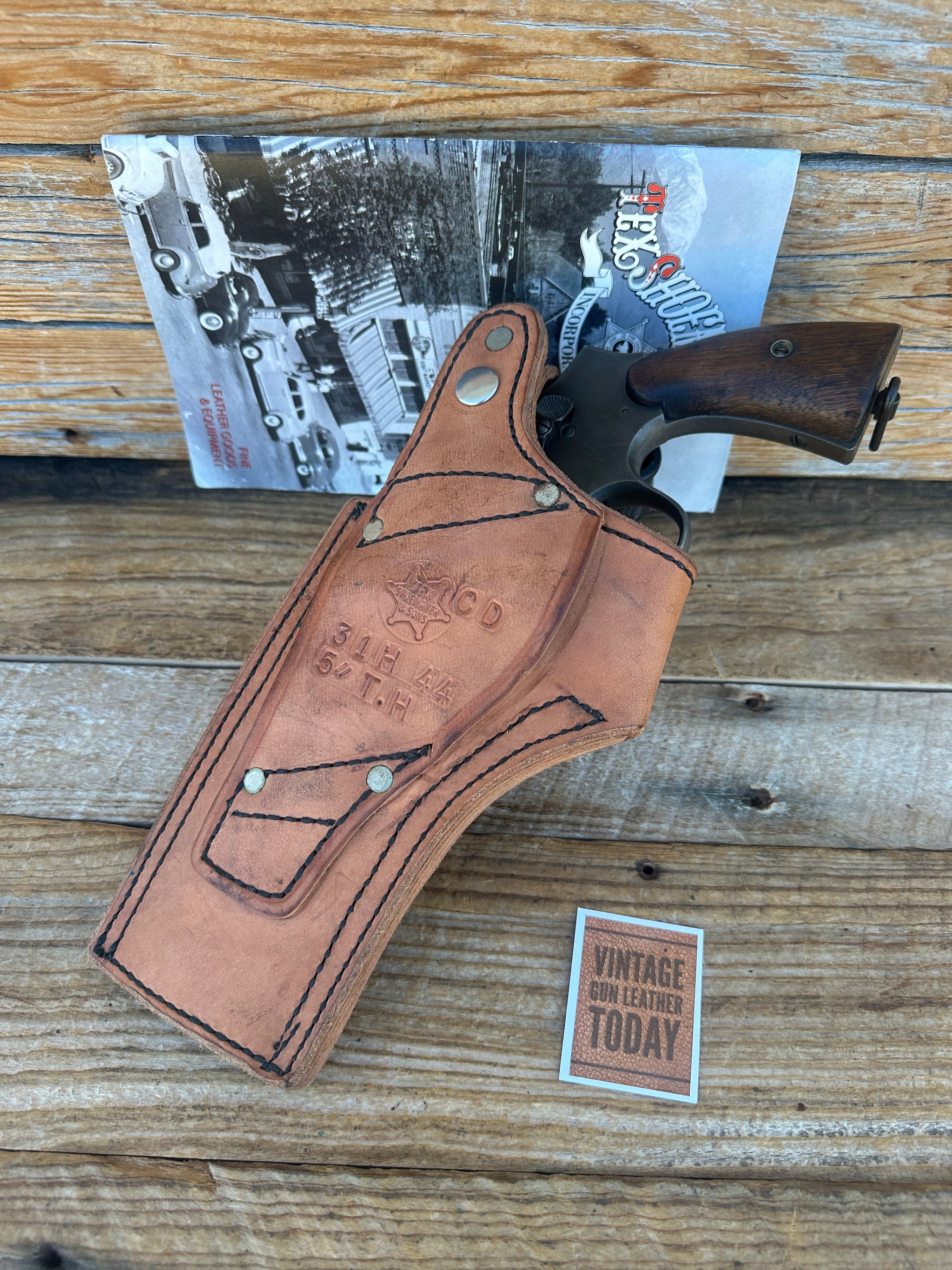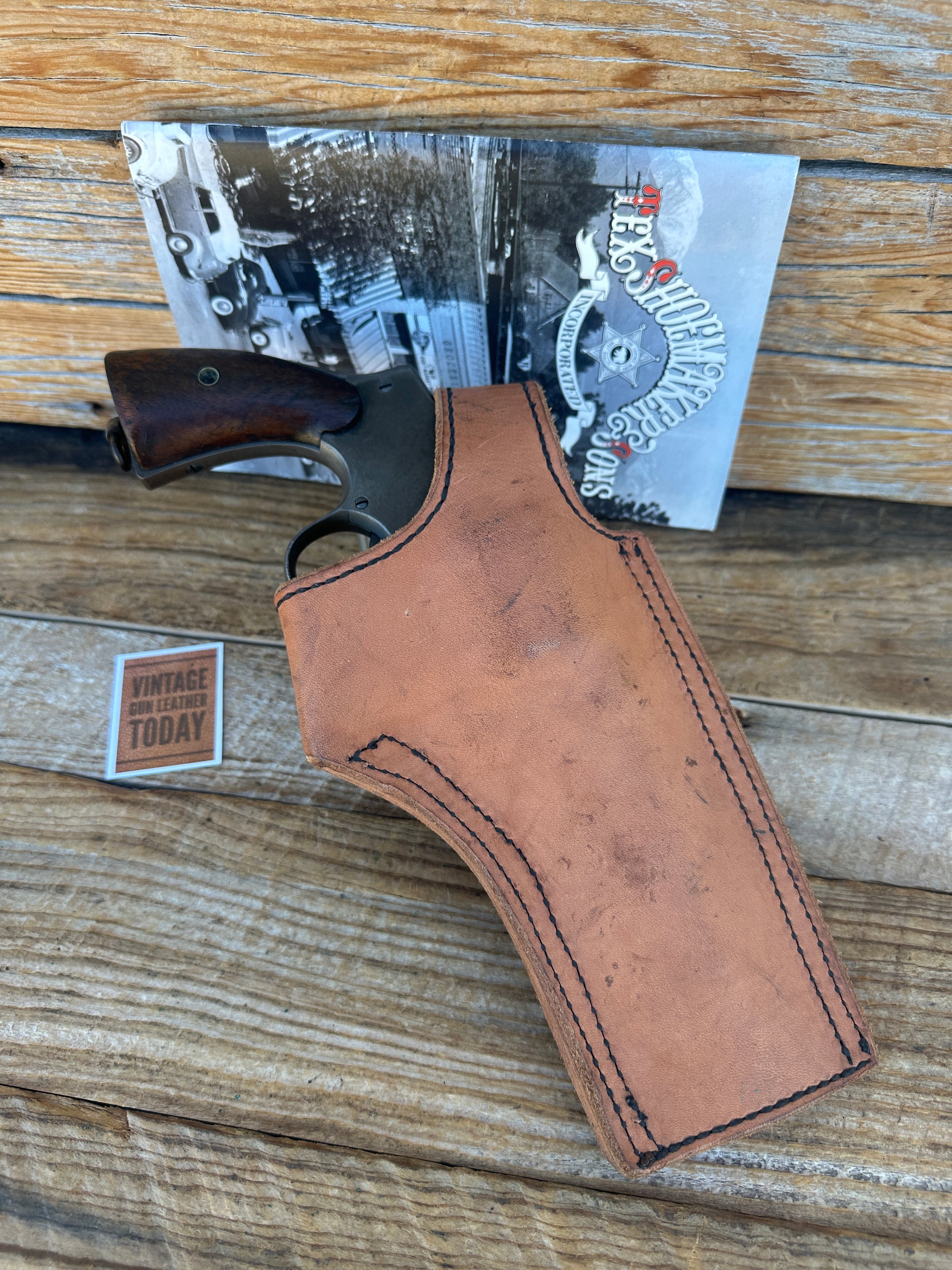 Vintage Tex Shoemaker brown leather cross draw holster Model 31H. Holster is for a 5 1/2" Smith & Wesson large .44 N frame revolver such as a model 29 or similar. In photo is a S&W 1917. This is a Cross draw holster worn on your left side and drawn with your right hand. Holster is smooth leather lined with a slot for a belt up to 2 1/4". This is listed as used because of the storage wear but this is new old stock..