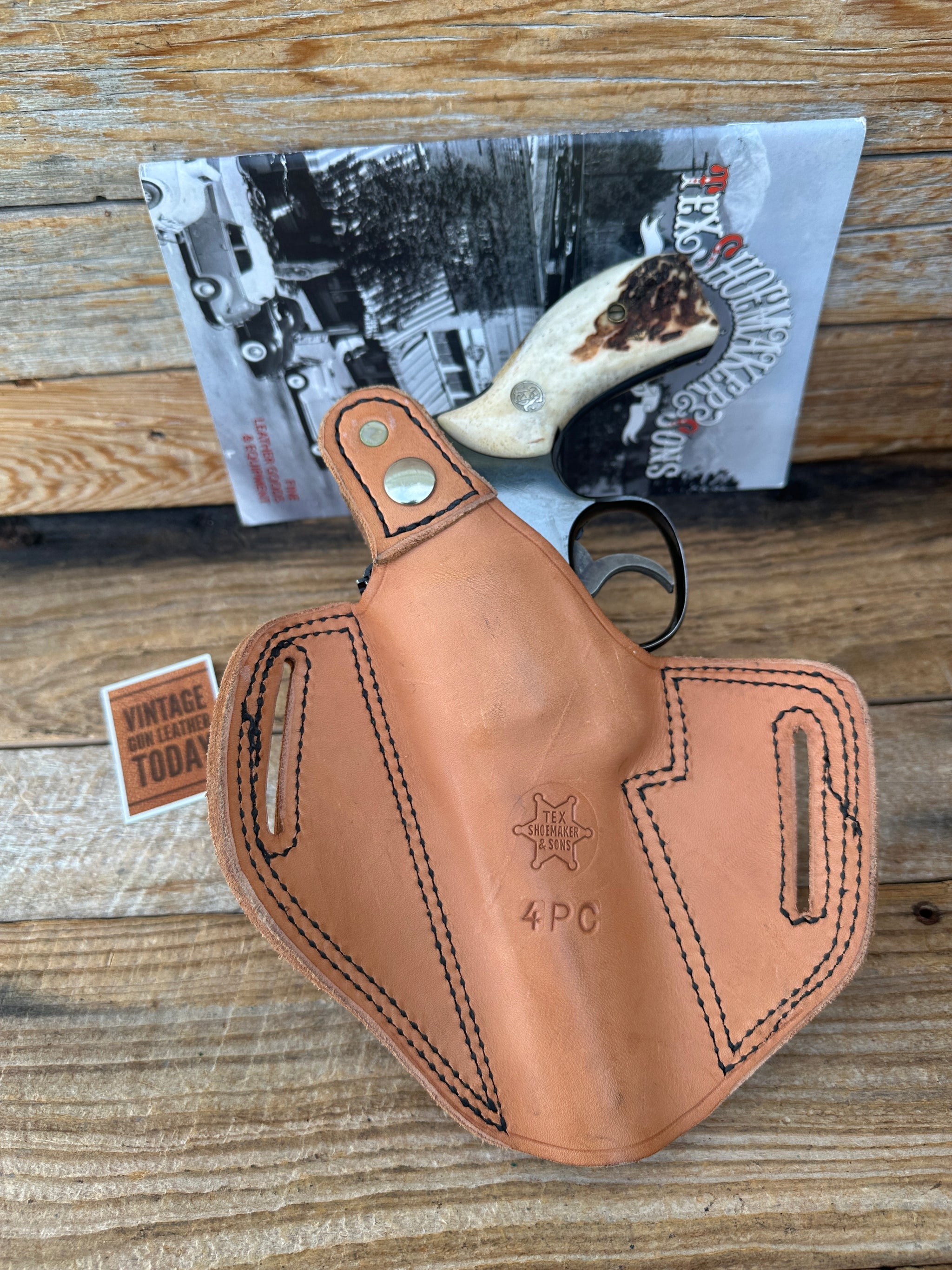 Vintage 1970's - 1980's new old stock Tex Shoemaker 4PC OWB PC Hugger Holster. This is natural brown and black stitched. Slots will fit a belt up to 1 3/4". This is new old stock with light storage wear, Holster is Right draw for the following 4" revolvers: