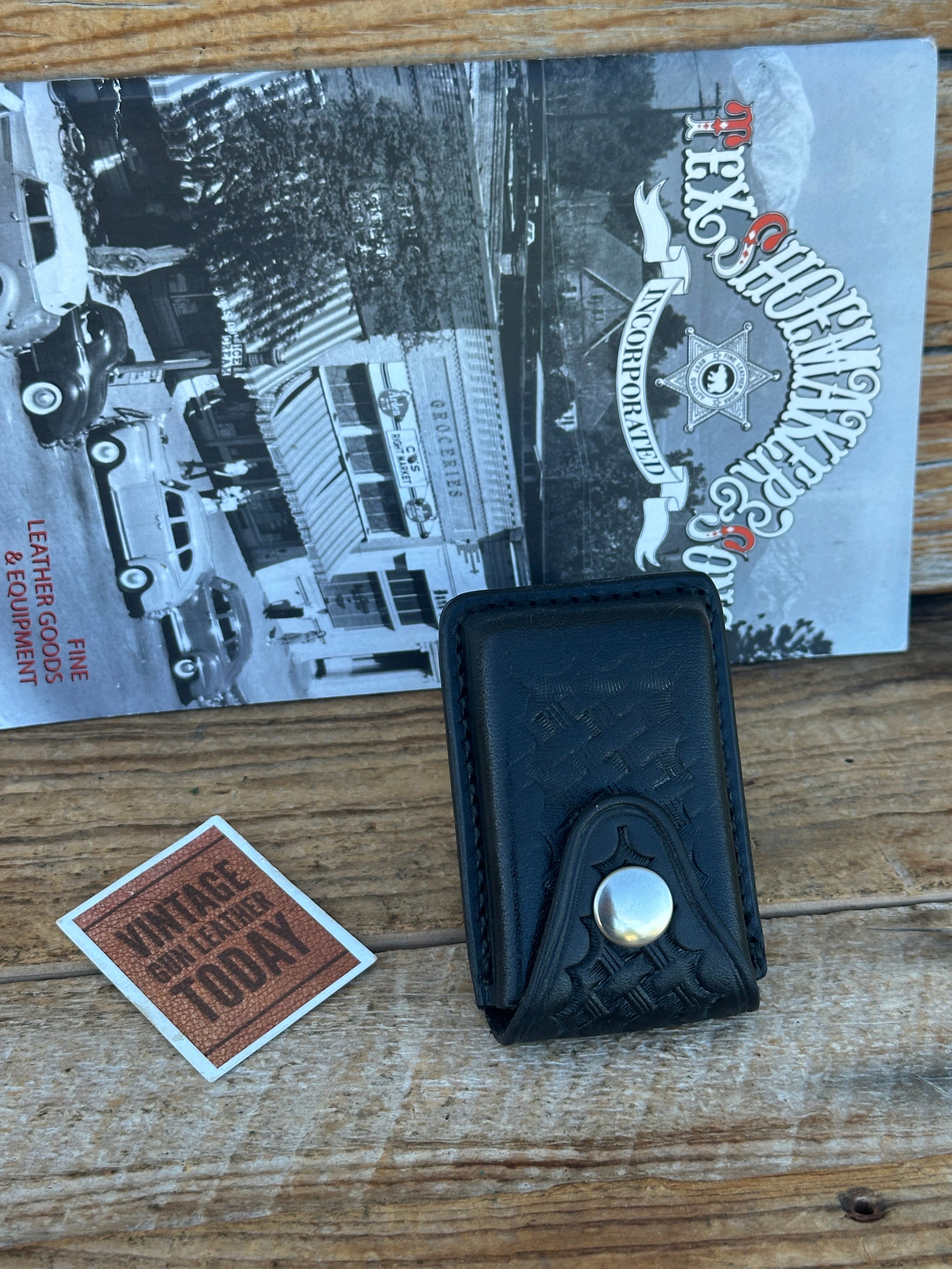 Vintage Tex Shoemaker black basket stamped Single cartridge box. This will hold 6 .38 cartridges. Hardware in Nickel and slot will fit a belt up to 1 3/4". Very compact cartridge carrier which also fits nicely in a coat or trouser pocket. Leather, stitching and hardware all in excellent condition. Rear has a scuff over Shoemaker Star. This was done when a item was no longer in production..