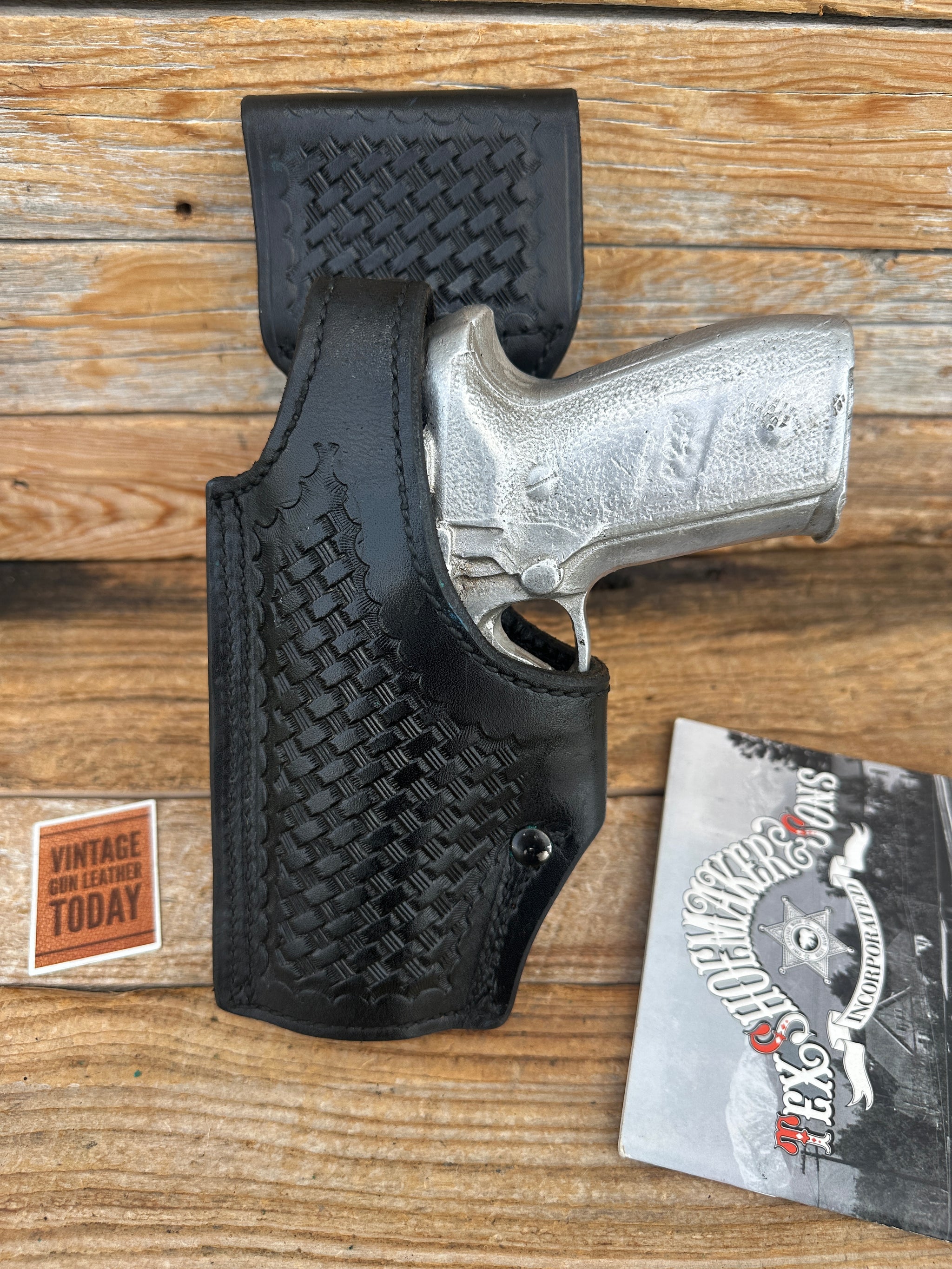 Vintage new old stock Tex Shoemaker HA 68 black basketweave leather lined holster. This holster was a special order item with a Longer Shank for a lower carry. Belt loop fit a belt up to 2 1/4". Holster is Left draw for: