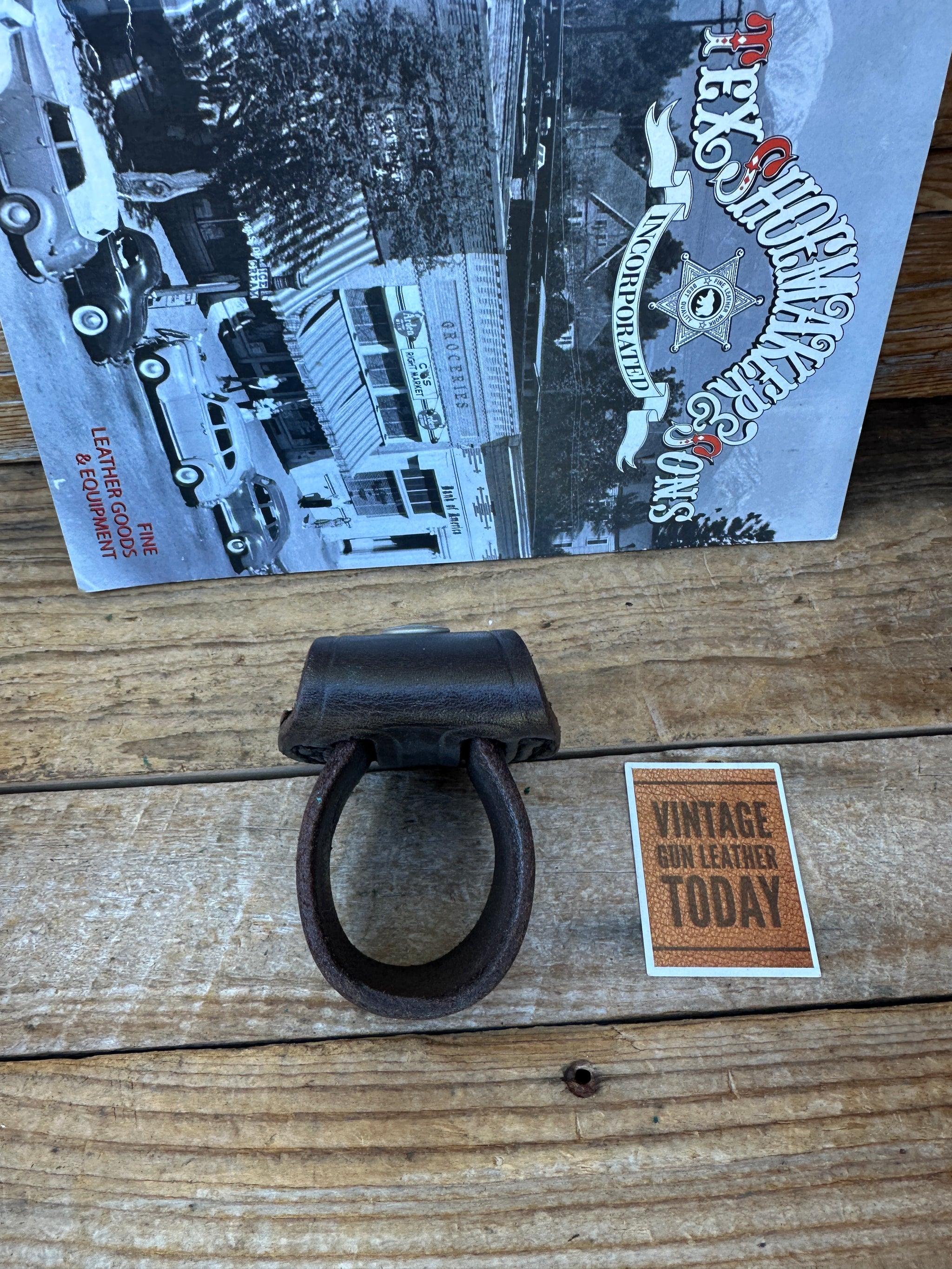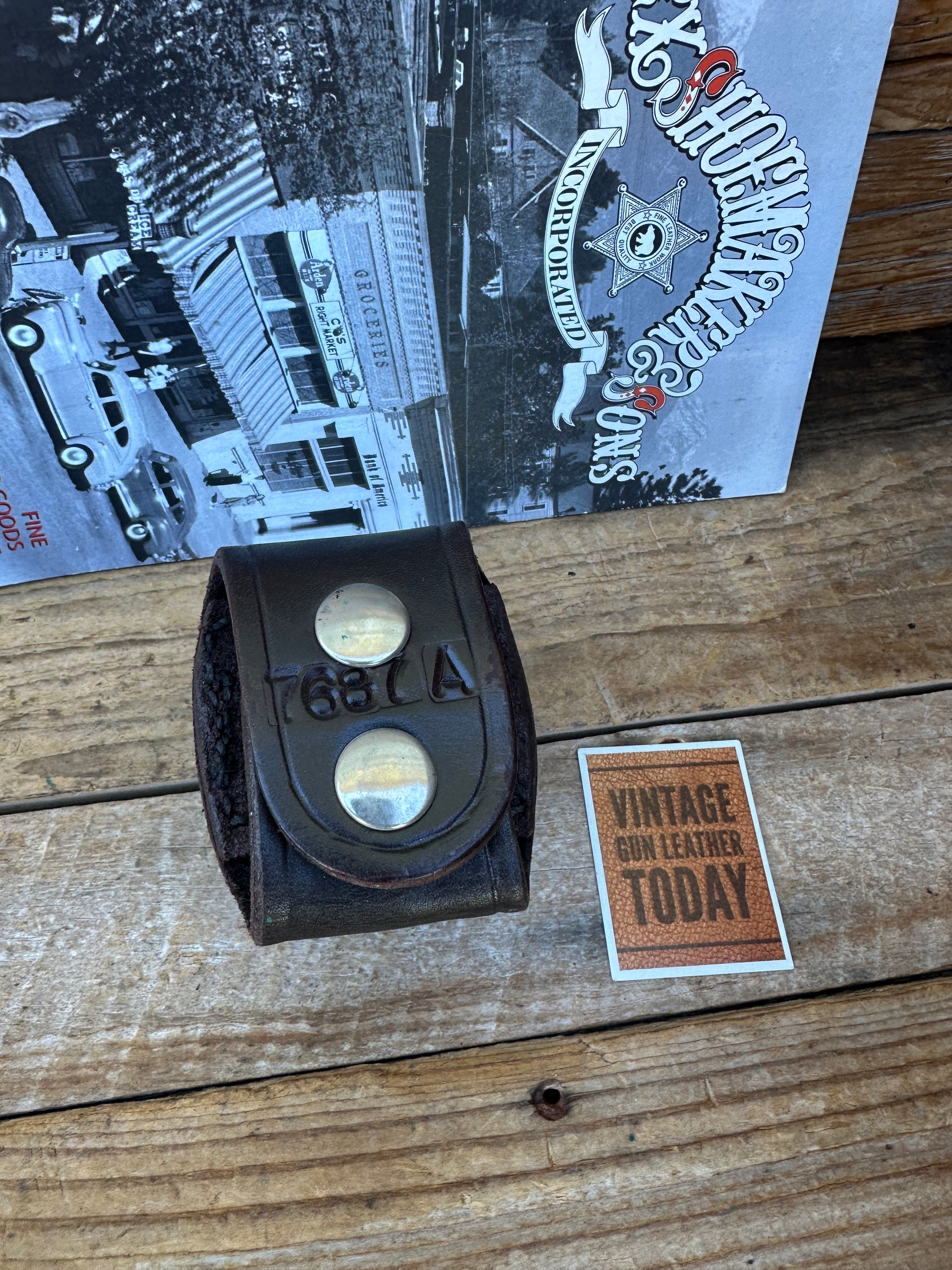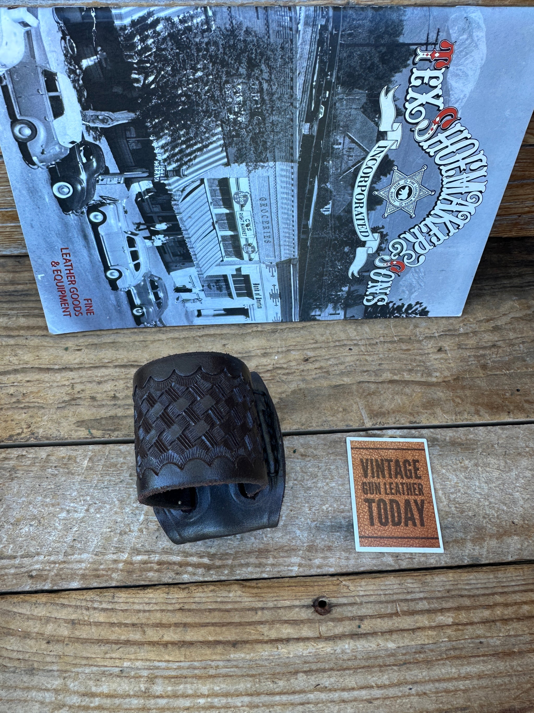 Vintage New Old Stock Tex Shoemaker 7687A cordovan brown basket stamped leather flashlight holder. This will fit a D cell 1 5/8" flashlight or similar 1 5/8" in diameter. Rear has 2 snaps which will snap over or slide onto a belt up to 2 1/4". Very solid high quality flashlight holder and the last we will see from Tex Shoemaker..