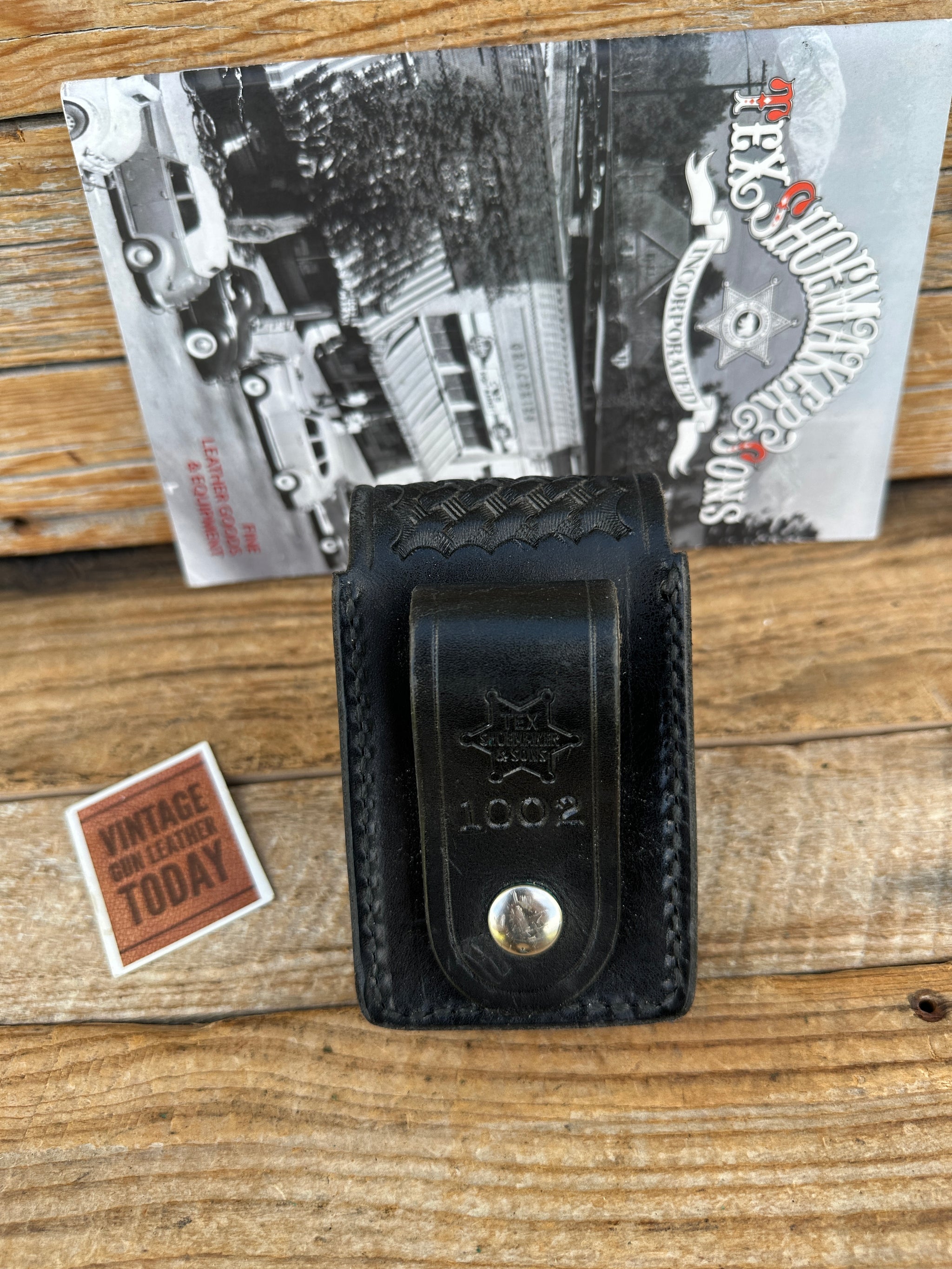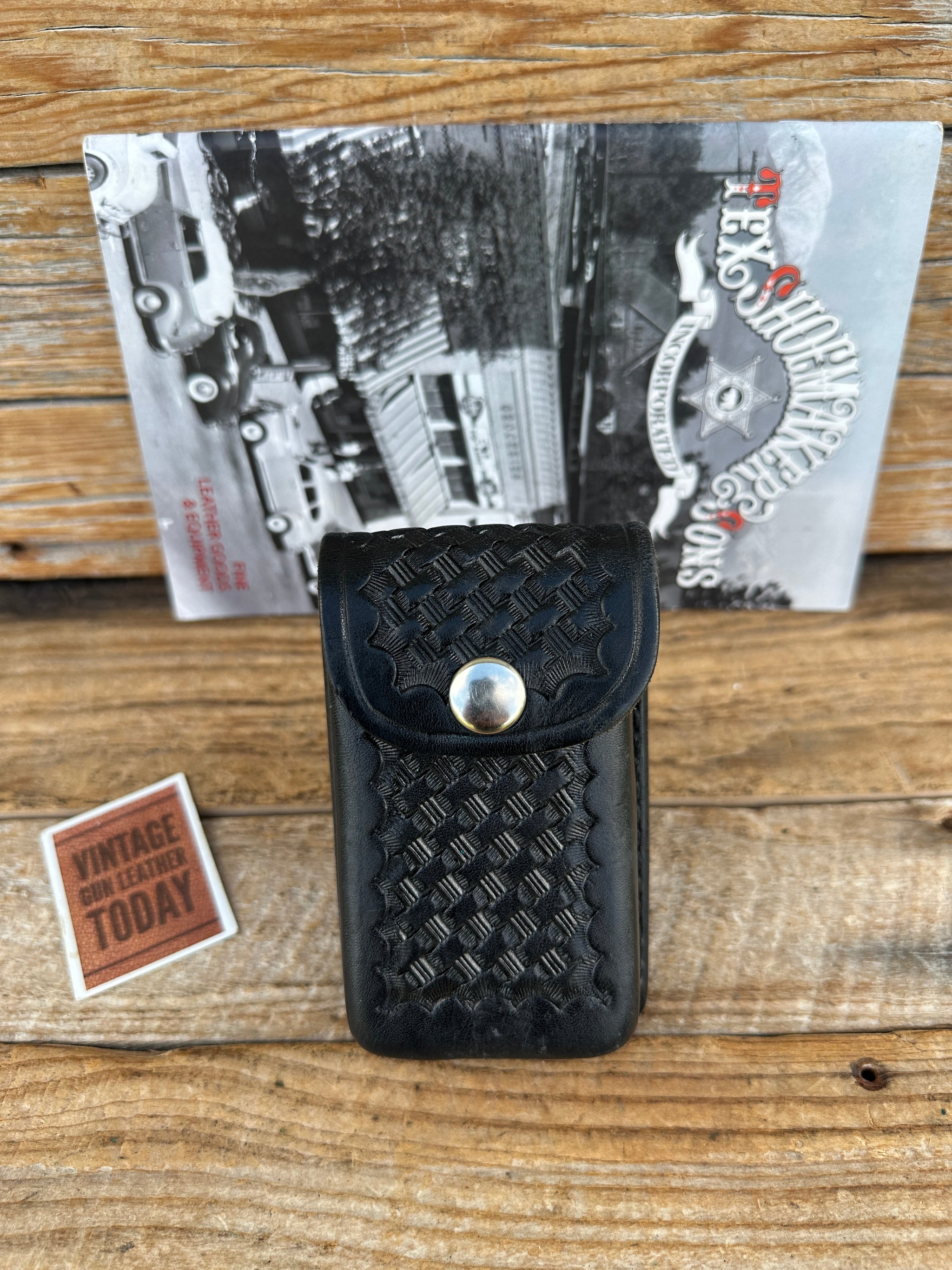 Vintage New Old Stock, Tex Shoemaker black basket stamped leather Multi-Purpose Case. Case measures 4" long x 2 5/8" wide x 1" deep. Great for latex Gloves, hand sanitizer, cigarette pack or other small items. Loop with directional snap fits a belt up to 2 1/4".