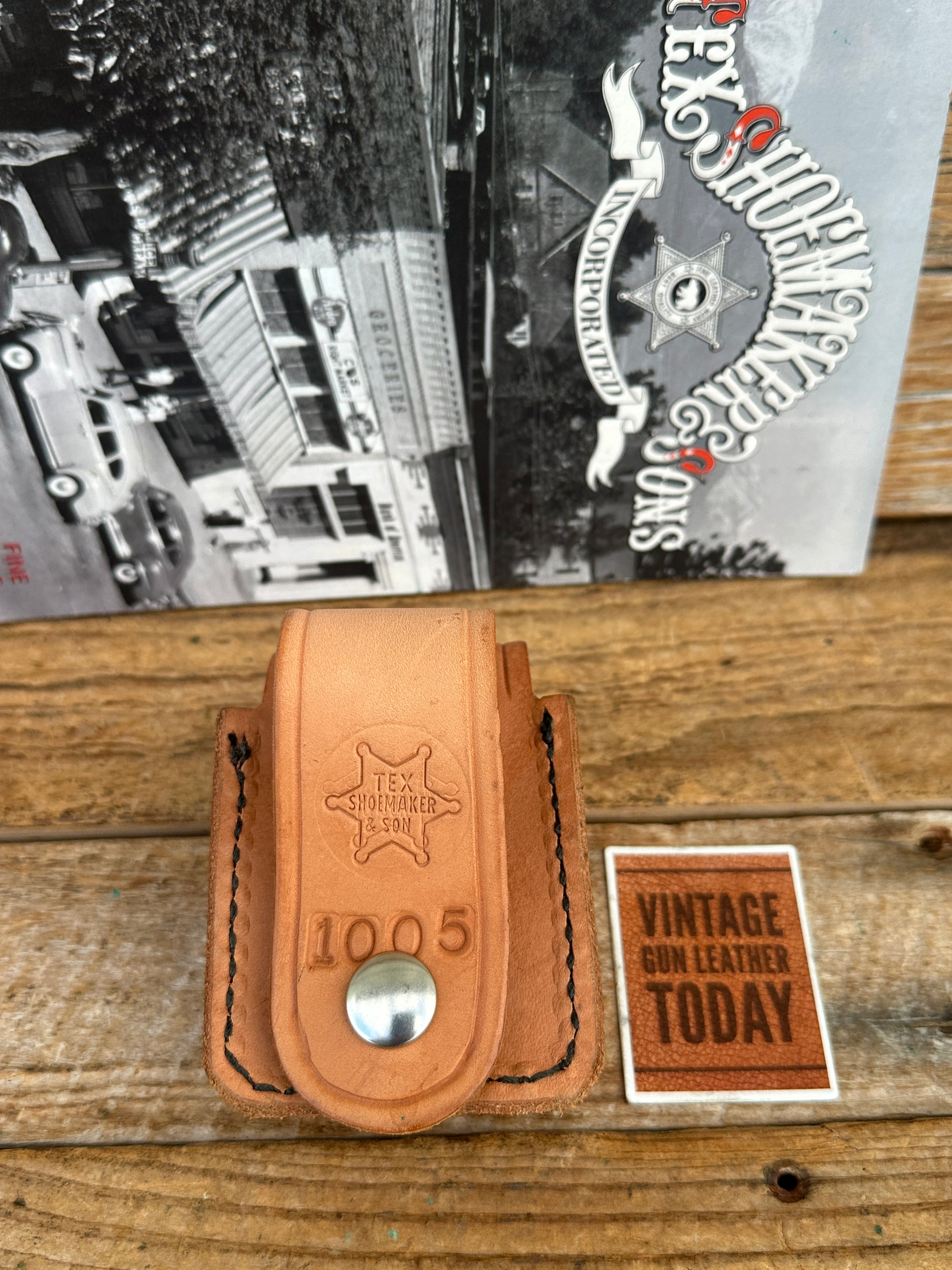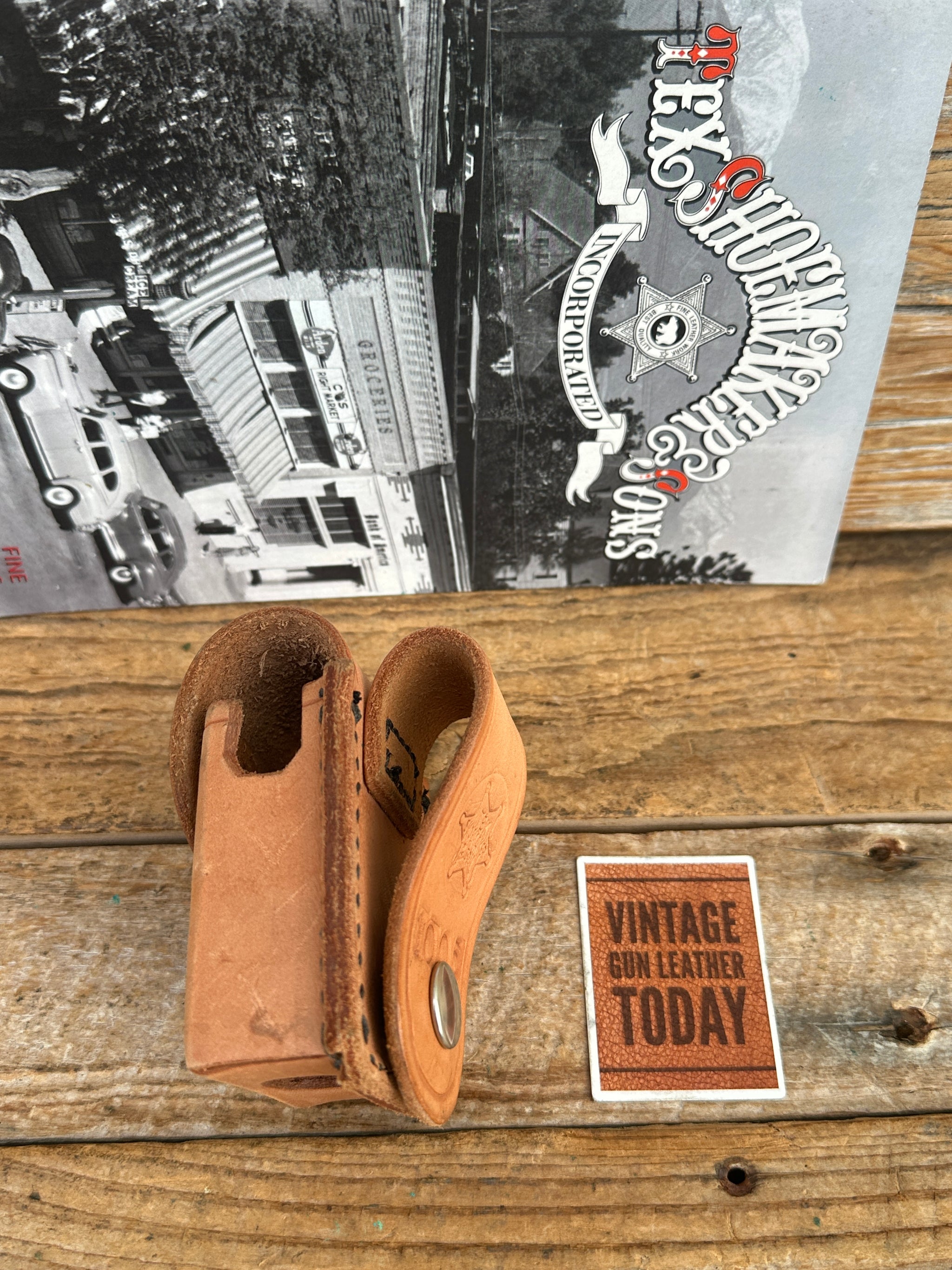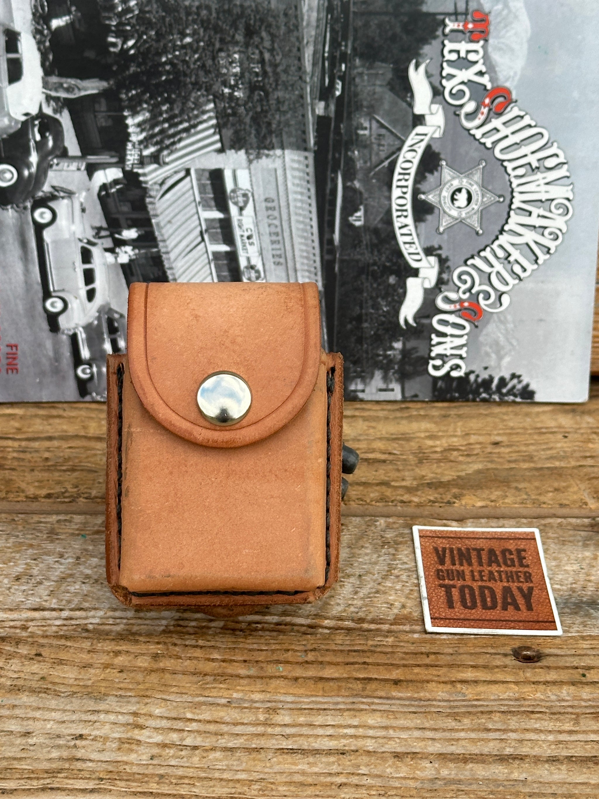 Vintage New Old Stock, Tex Shoemaker natural brown basket stamped leather Multi-Purpose Case. Case measures 3" long x 2" wide x 1" deep. Great for latex Gloves, hand sanitizer, Mic / Panic box or other small items. loop fits a belt up to 2 1/4". Top flap has a small notch. I believe this was initially made for a Mic box.