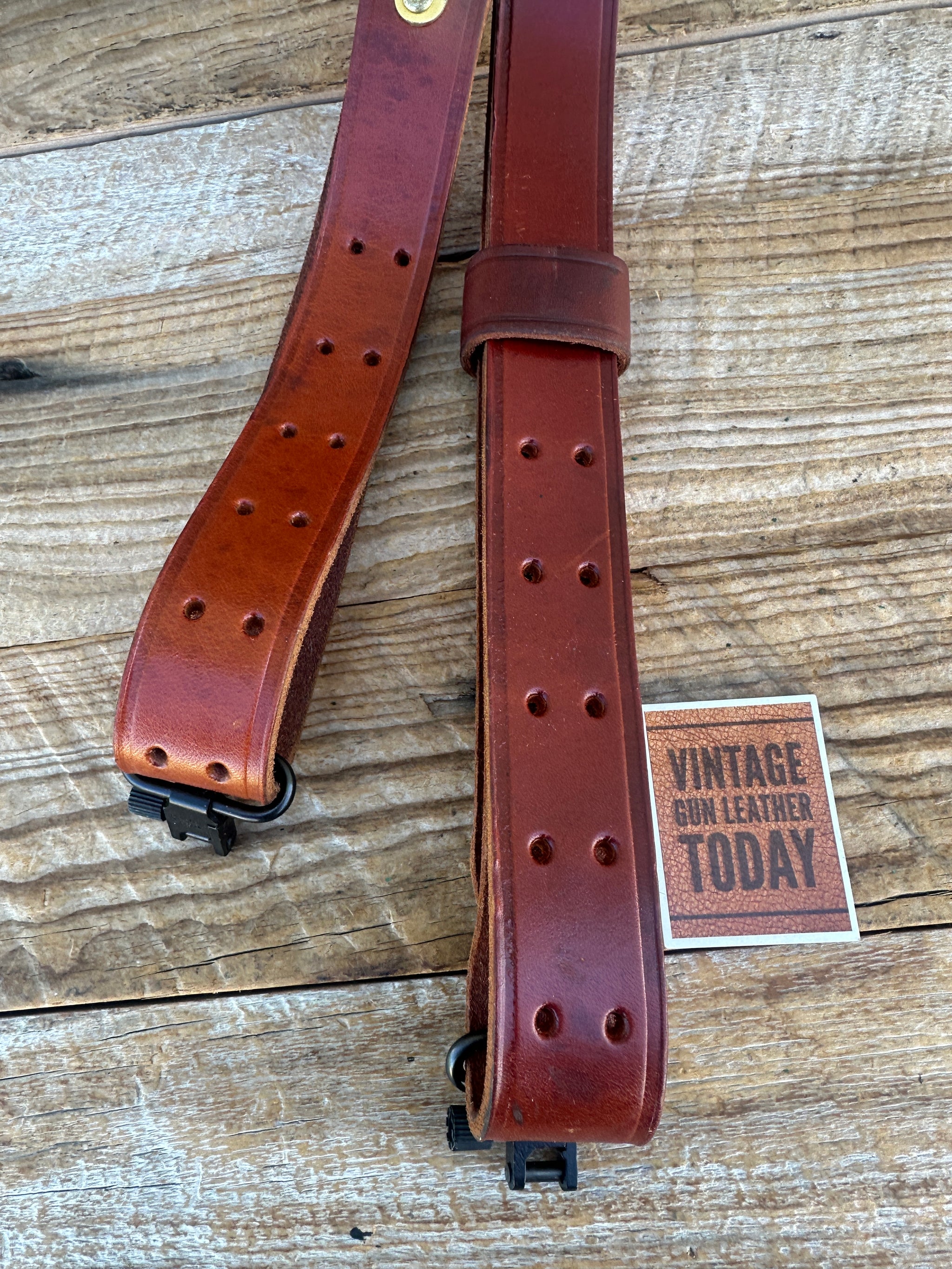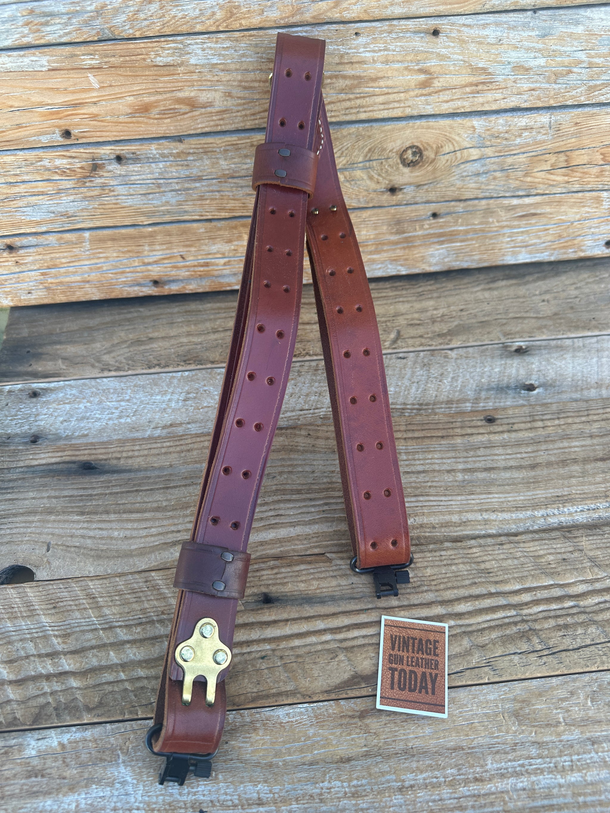 Like new vintage brown leather military style, competition rifle sling. Sling is 1 1/4" wide and is adjustable with brass hooks. Included with sling are 2 sling swivels. Leather, stitching and hardware all in excellent condition..