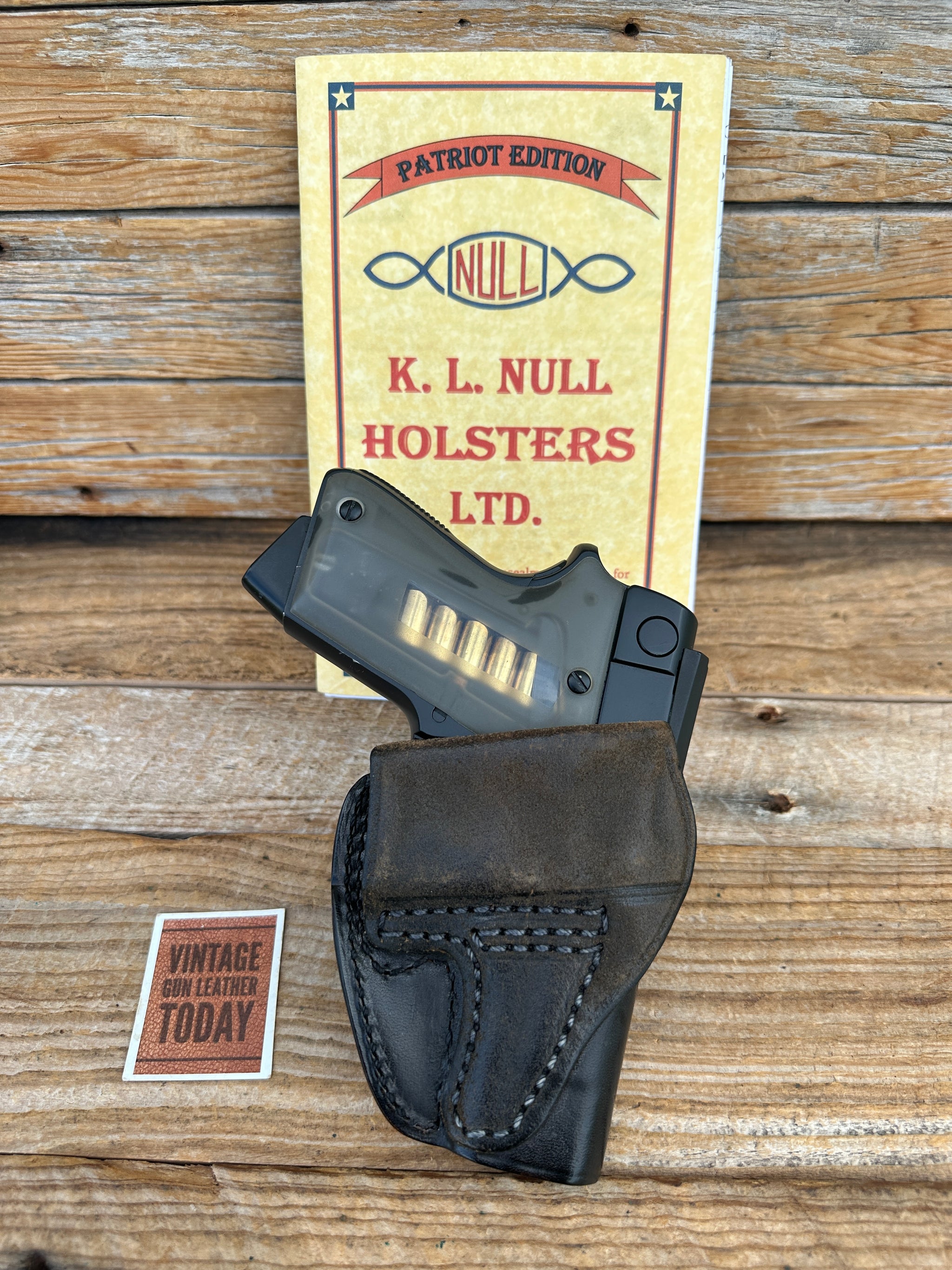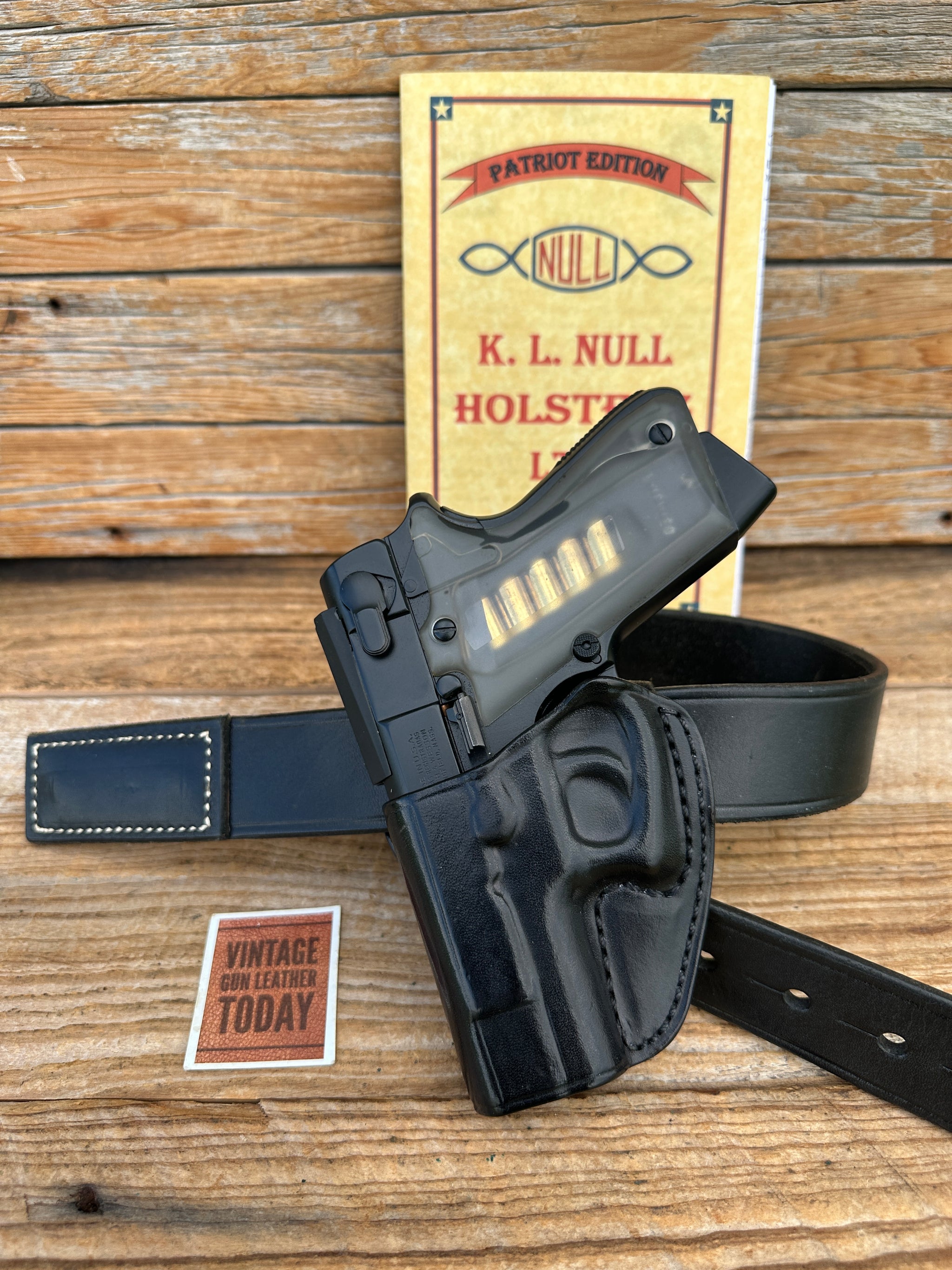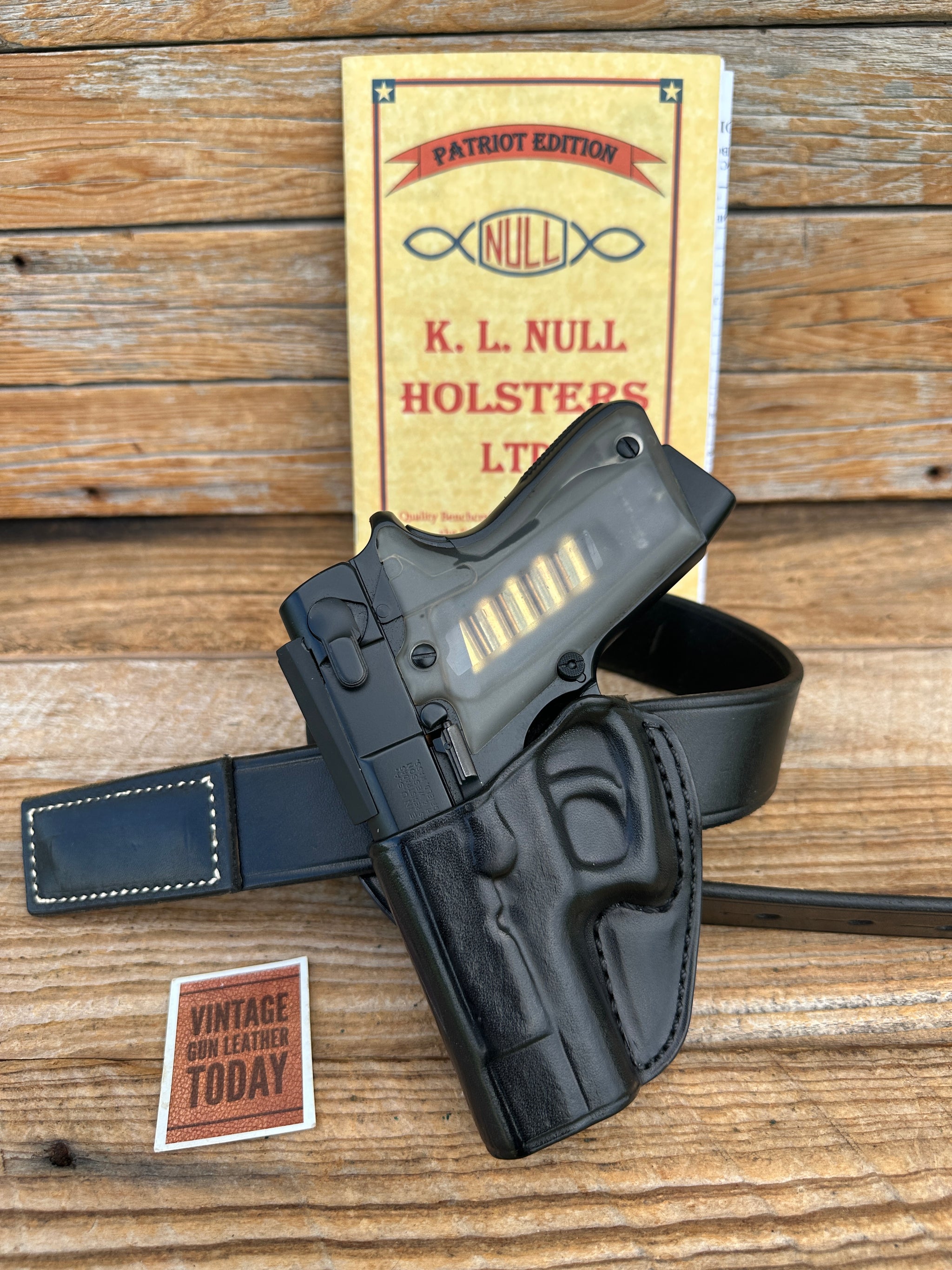 Vintage 1980's Ken Null, black horsehide SSS Super Speed Scabbard OWB holster. This is LEFT draw for the Smith & Wesson ASP, designed by Paris Theodore. Theodore converted an unknown number of M39’s over to his new firearm from 1968 onwards. He patented the design itself in 1971.This was obtained in a group of ASP holsters from Null's early days of holster making. In this group 2 have Null Hanover P.A. heat branded on holster which is how Null marked his holster for about 5 or 6 months at some point between 1972-1976 which he then discontinued.