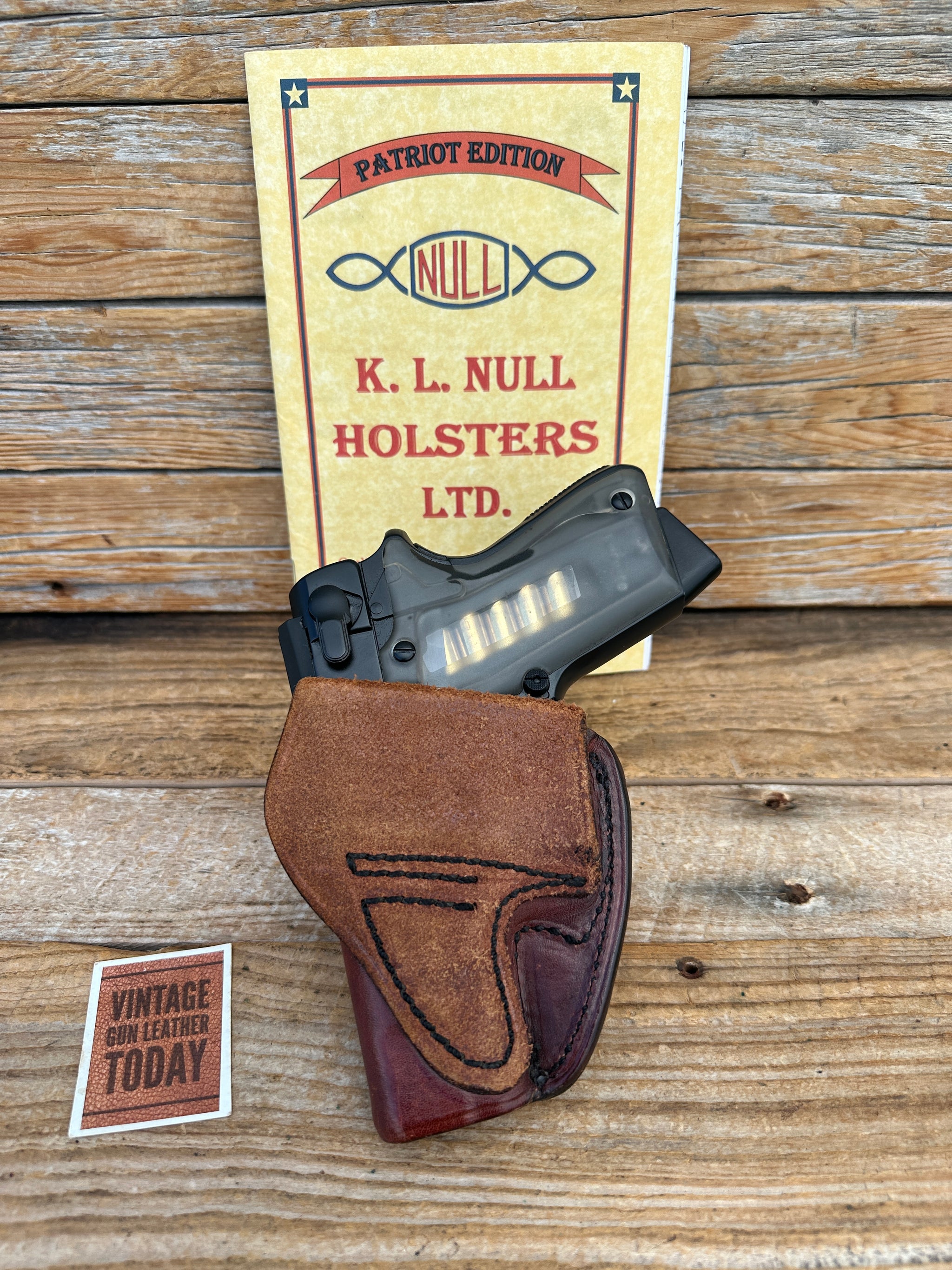 Vintage 1980's Ken Null, brown horsehide SSS Super Speed Scabbard OWB holster. This is RIGHT draw for the Smith & Wesson ASP, designed by Paris Theodore. Theodore converted an unknown number of M39’s over to his new firearm from 1968 onwards. He patented the design itself in 1971.This was obtained in a group of ASP holsters from Null's early days of holster making. In this group 2 have Null Hanover P.A. heat branded on holster which is how Null marked his holster for about 5 or 6 months at some point between 1972-1976 which he then discontinued.