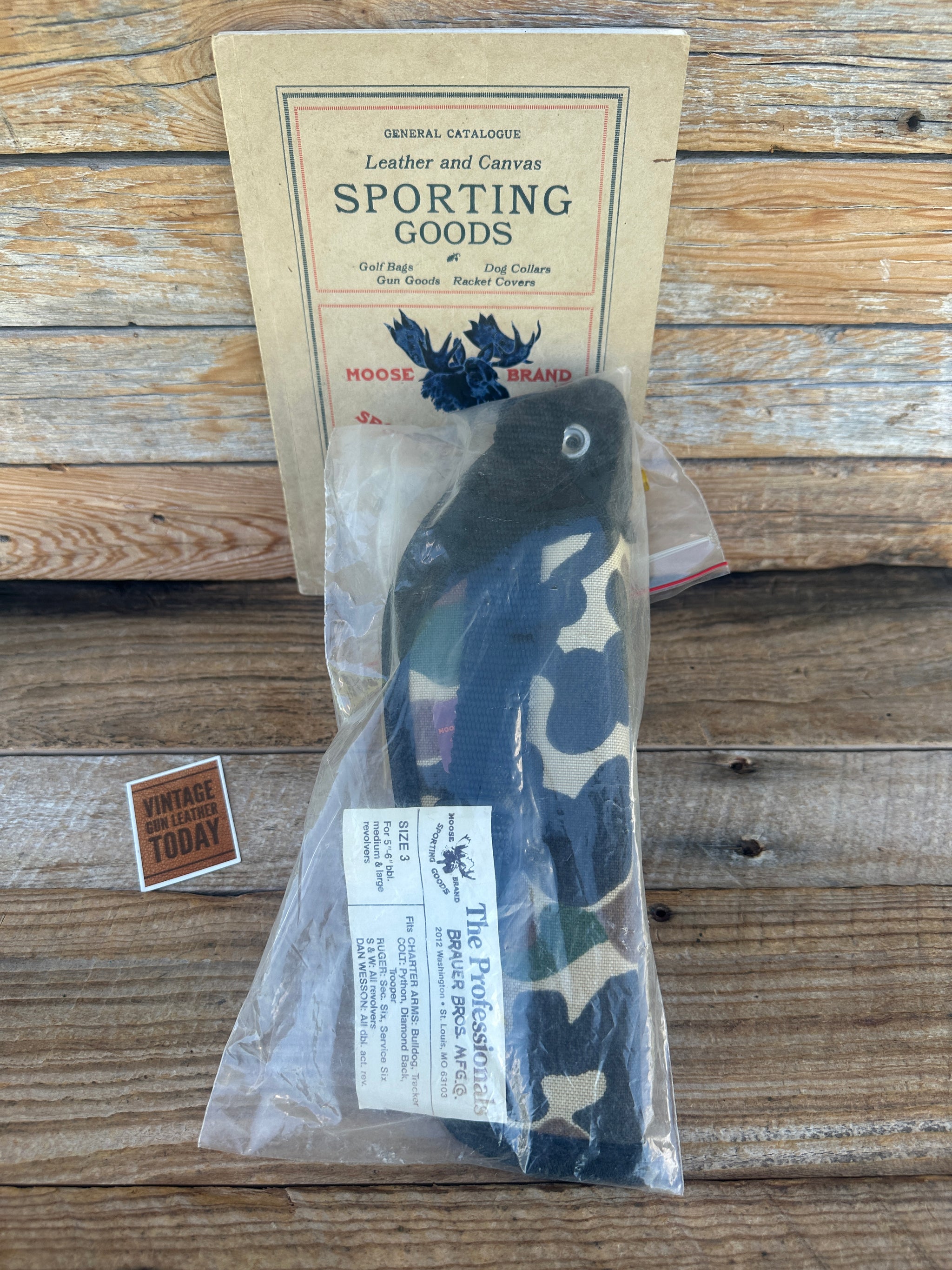 Vintage new old stock, Brauer Brothers / Moose Brand Camouflage size 8 OWB holster. Holster is nylon with padded interior and Vietnam Era Camo. style. Belt has 1 1/2" slot and 2 1/4" slot. Retention strap is adjustable and removable. Holster is for the following 3" to 4 1/2" Medium Automatics: