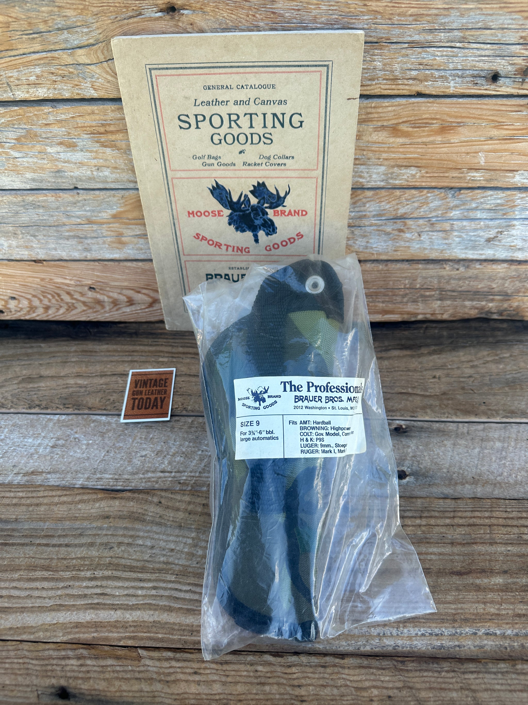 Vintage new old stock, Brauer Brothers / Moose Brand Camouflage size 9 OWB holster. Holster is nylon with padded interior and Vietnam Era Camo. style. Belt has 1 1/2" slot and 2 1/4" slot. Retention strap is adjustable and removable. Holster is for the following 3 1/2" to 6" large automatics: