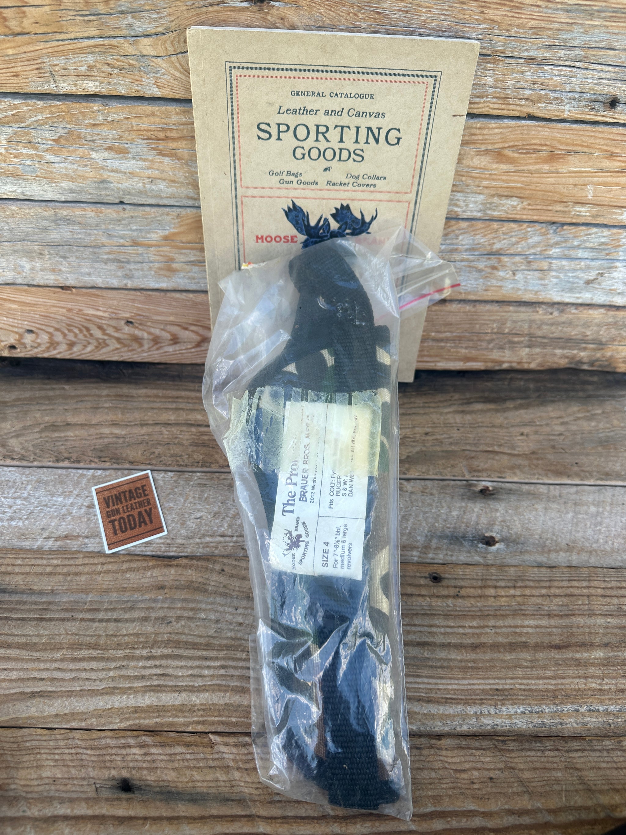 Vintage new old stock, Brauer Brothers / Moose Brand Camouflage size 4. Retention tion strap is adjustable and removable. This has vintage duck hunting style Camo. Holster is for the following 7' to 8 3/8" medium and large revolvers: