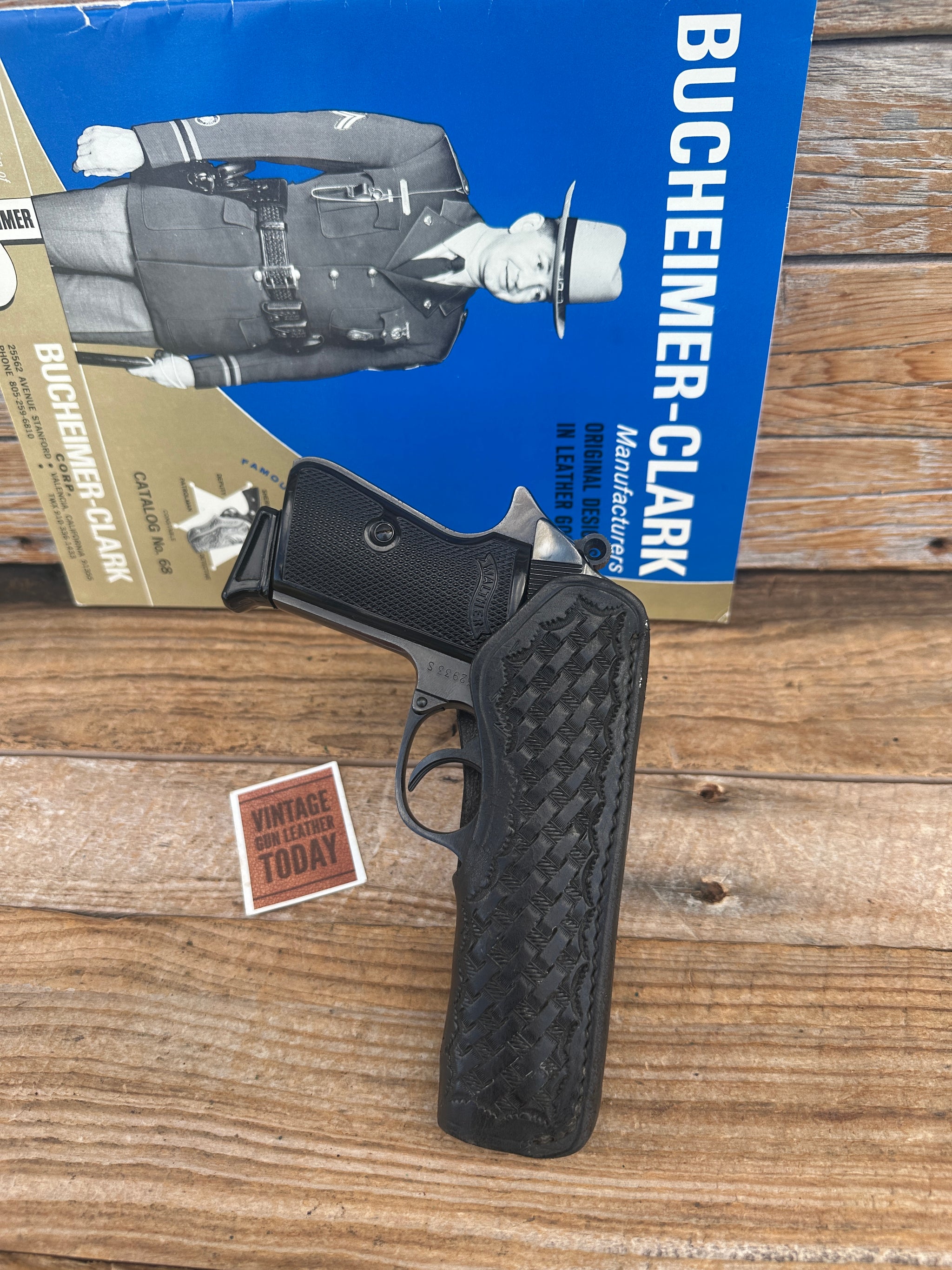 Vintage Bucheimer black basket stamped leather, black stitched Plainsman Holster. This is for a Walther PP, PPK or PPK/S Right draw. Holster can be worn on a belt up to 1 1/2". Very thin and concealable holster. Leather and stitching in very nice condition..