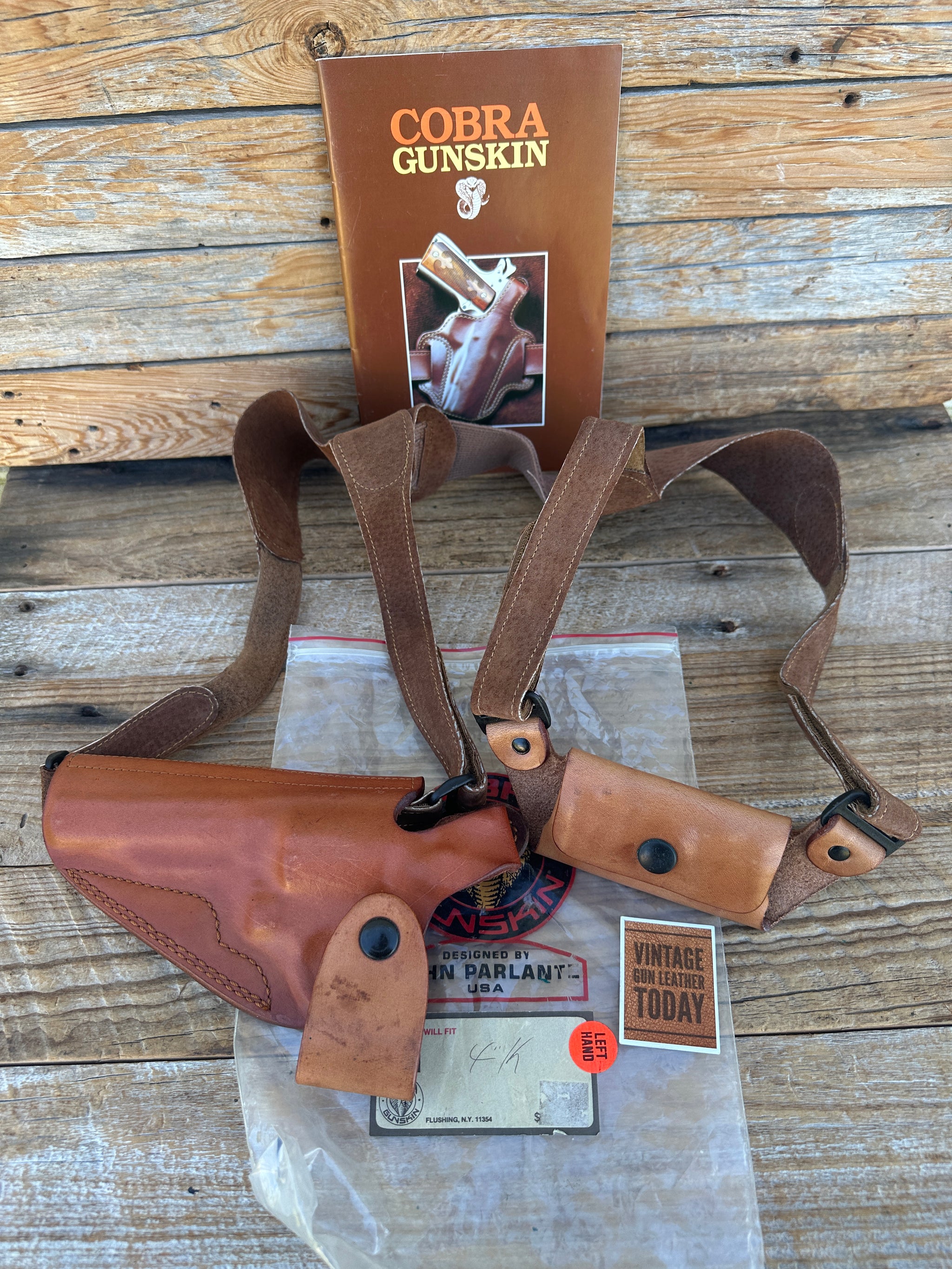 Vintage new old stock Cobra brown leather shoulder holster rig. Holster is for a Smith & Wesson K frame revolver 4", LEFT draw. Off side holds 6 .38 / .357 cartridges. Harness is adjustable with multiple settings for holster and cartridge carrier. Holster can also be removed from harness and worn OWB or IWB. This is new old stock with light storage wear. Stock is from a dealer who provided holsters and accessories to NYPD officers in the 1990's..