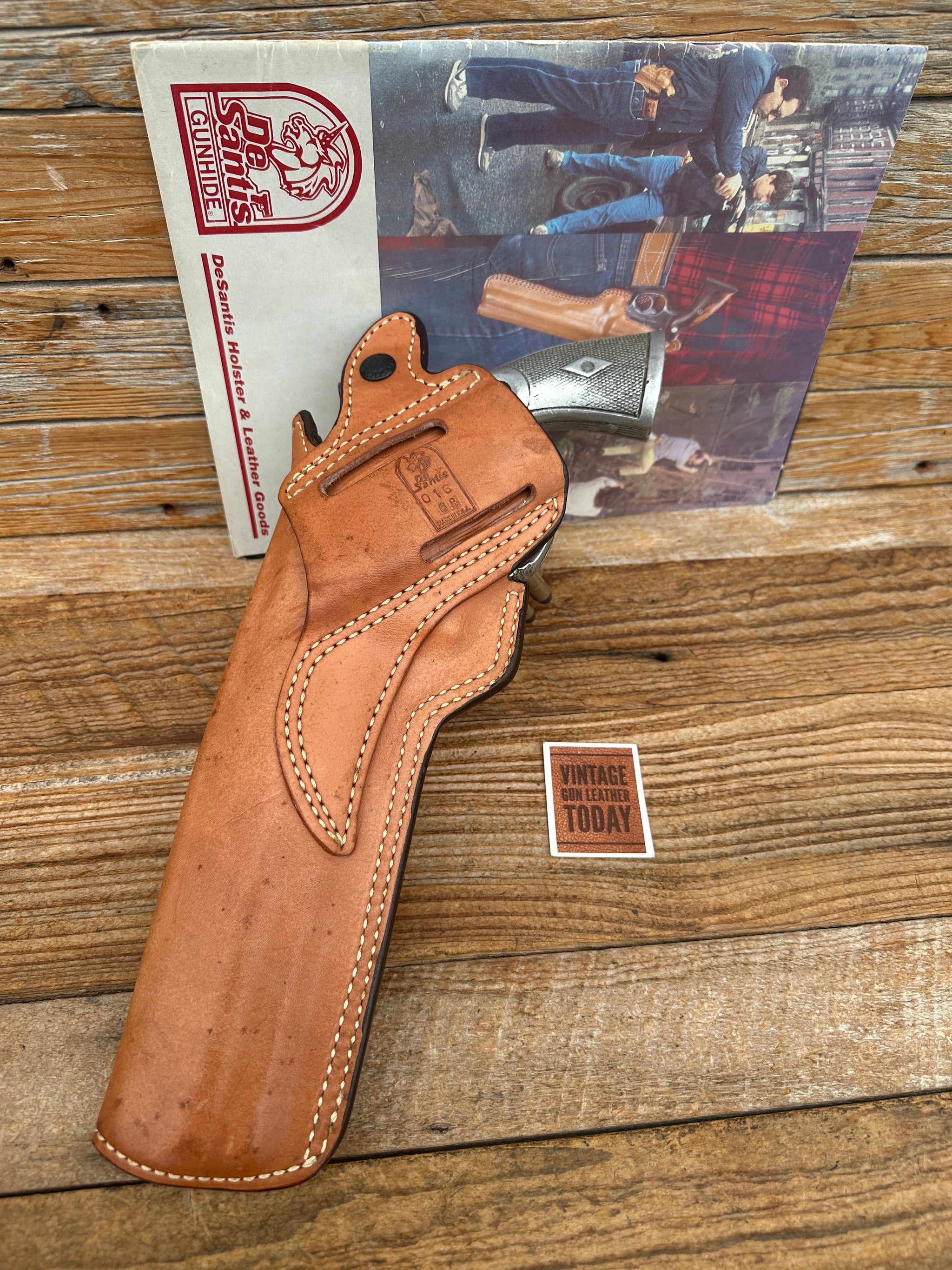 Desantis vintage Dual Angle Hunter. Holster is brown leather and can be worn strong side on a belt up to 2" or cross draw on a belt up to 1 1/2" for a Right handed shooter. Holster is for a 6" Smith & Wesson Classic 8.375". This is the early version with light tan suede interior and thicker leather. This holster is no longer offered by Desantis for this size revolver..