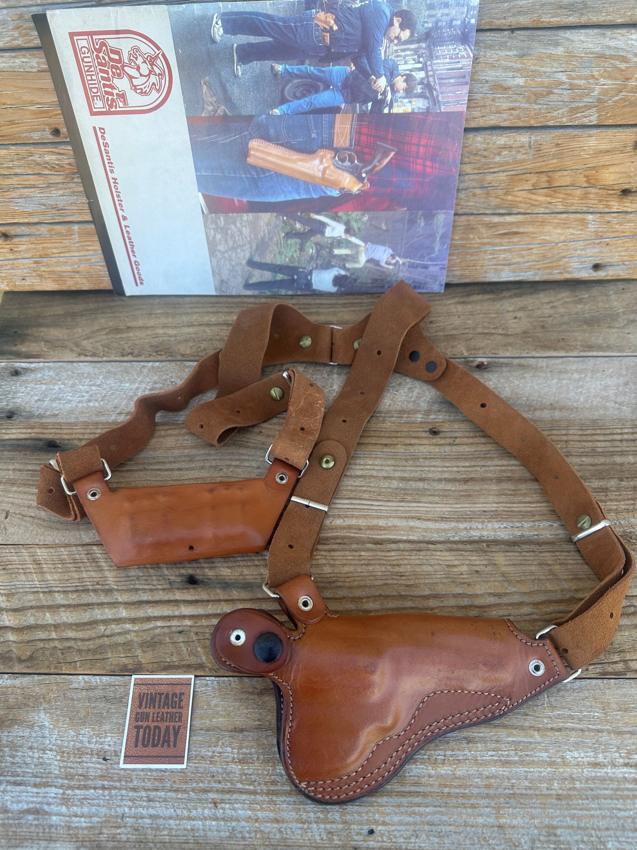 This brown leather Desantis Slant Shoulder Rig was made in late 1980's or 1990's and is NEW in original packaging. This is LEFT DRAW for the following: