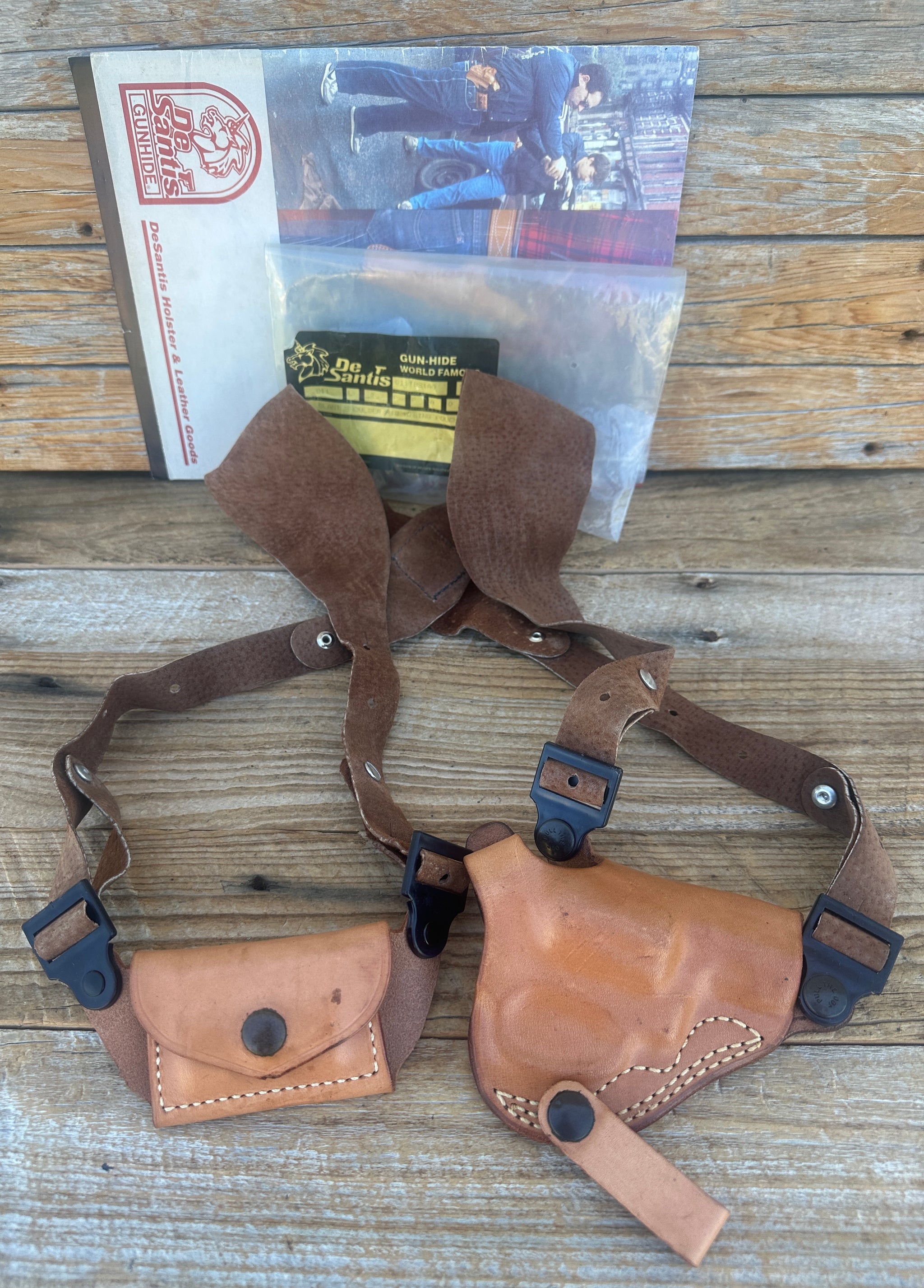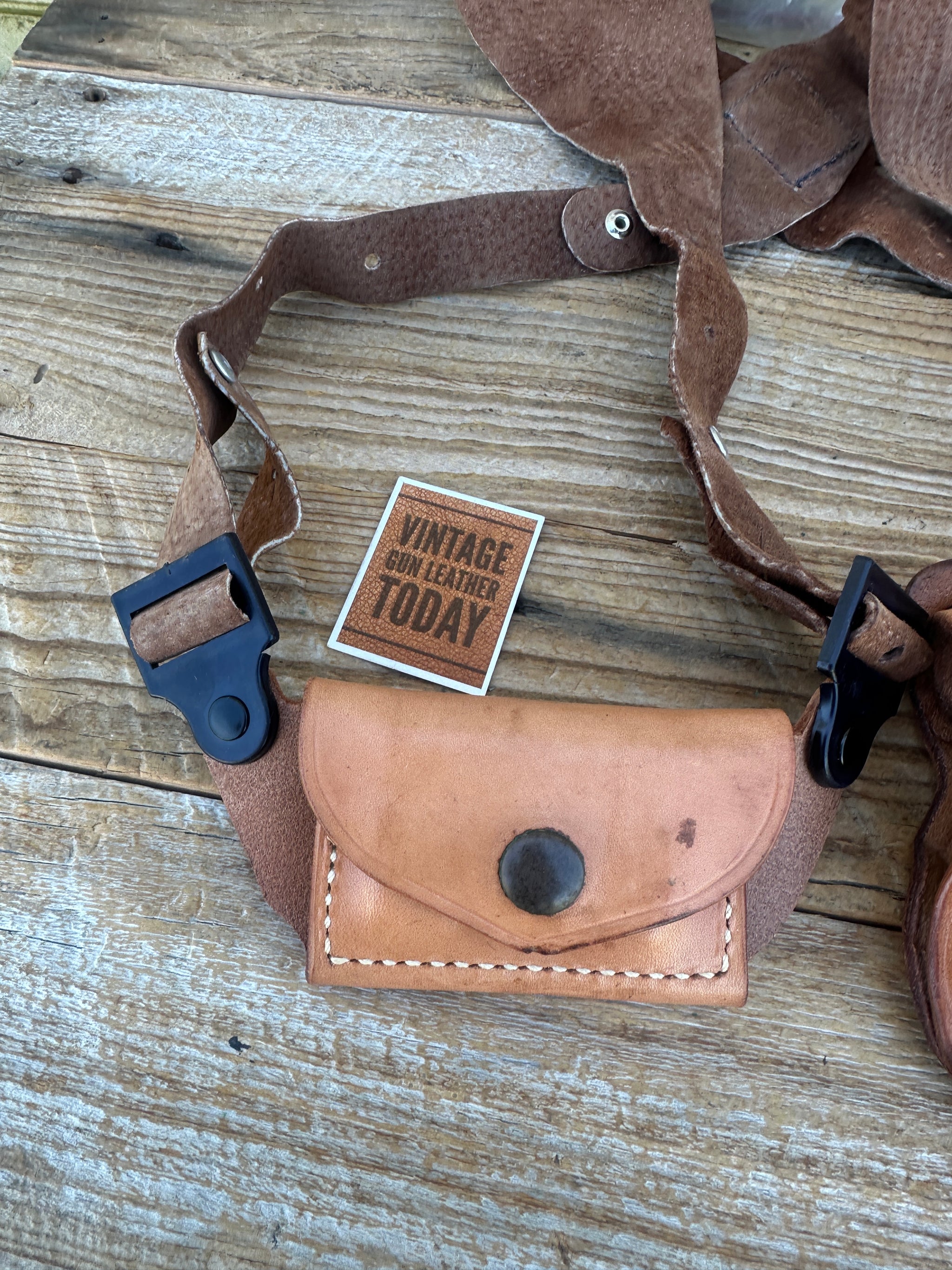 Pouch holds 6 rounds of .38 ammo. Leather harness is adjustable. Holster is vintage, New and impossible to find in this condition and for the above revolvers..