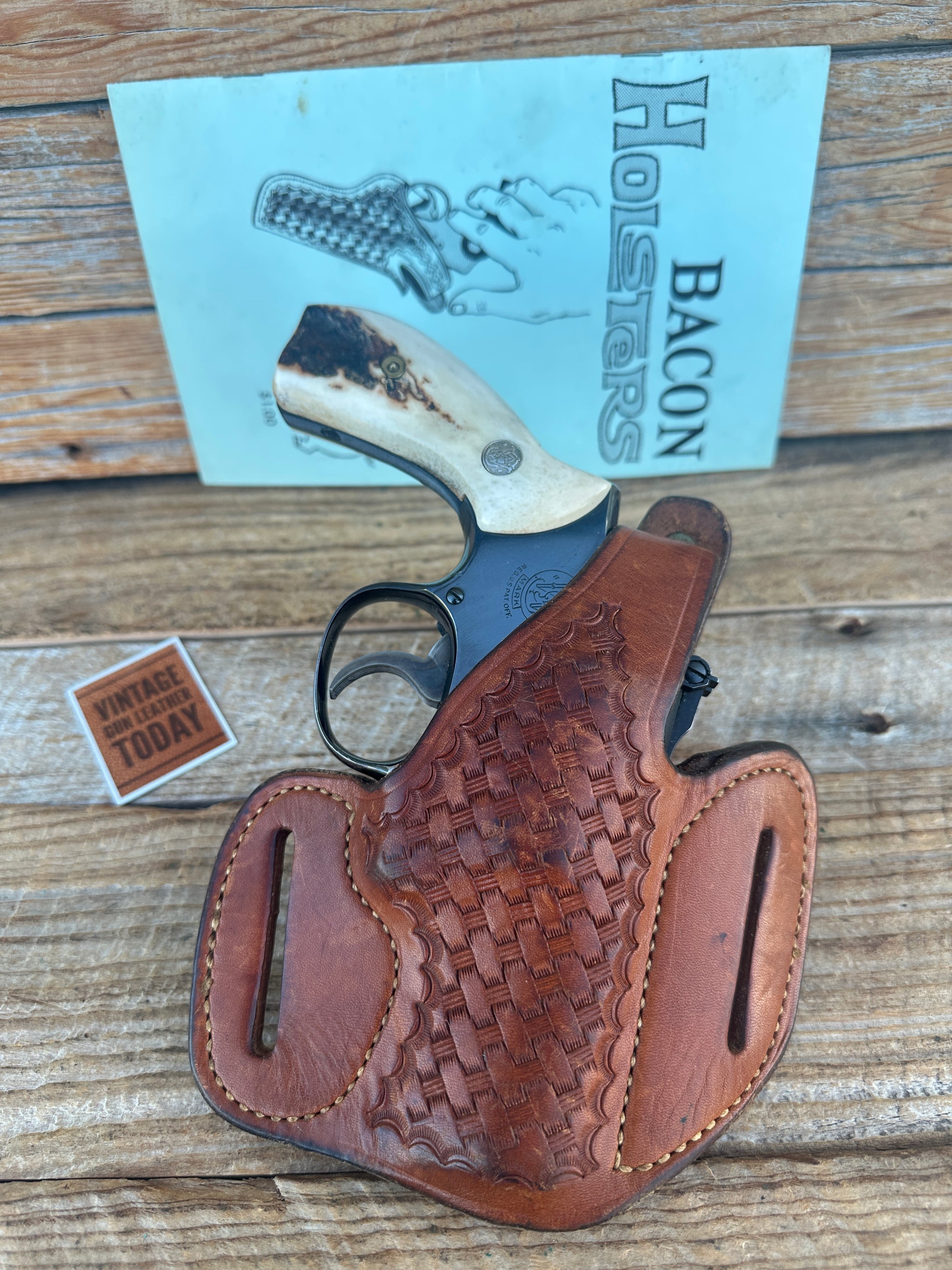 Vintage Dick Bacon, Rosemead California, brown basket stamped leather M6 OWB holster for Smith & Wesson 2 1/2" K frame revolver. This will fit the Model 10, 12, 15, 19 or similar. Bottom of holster is open. Leather, stitching and hardware all in very nice condition.
