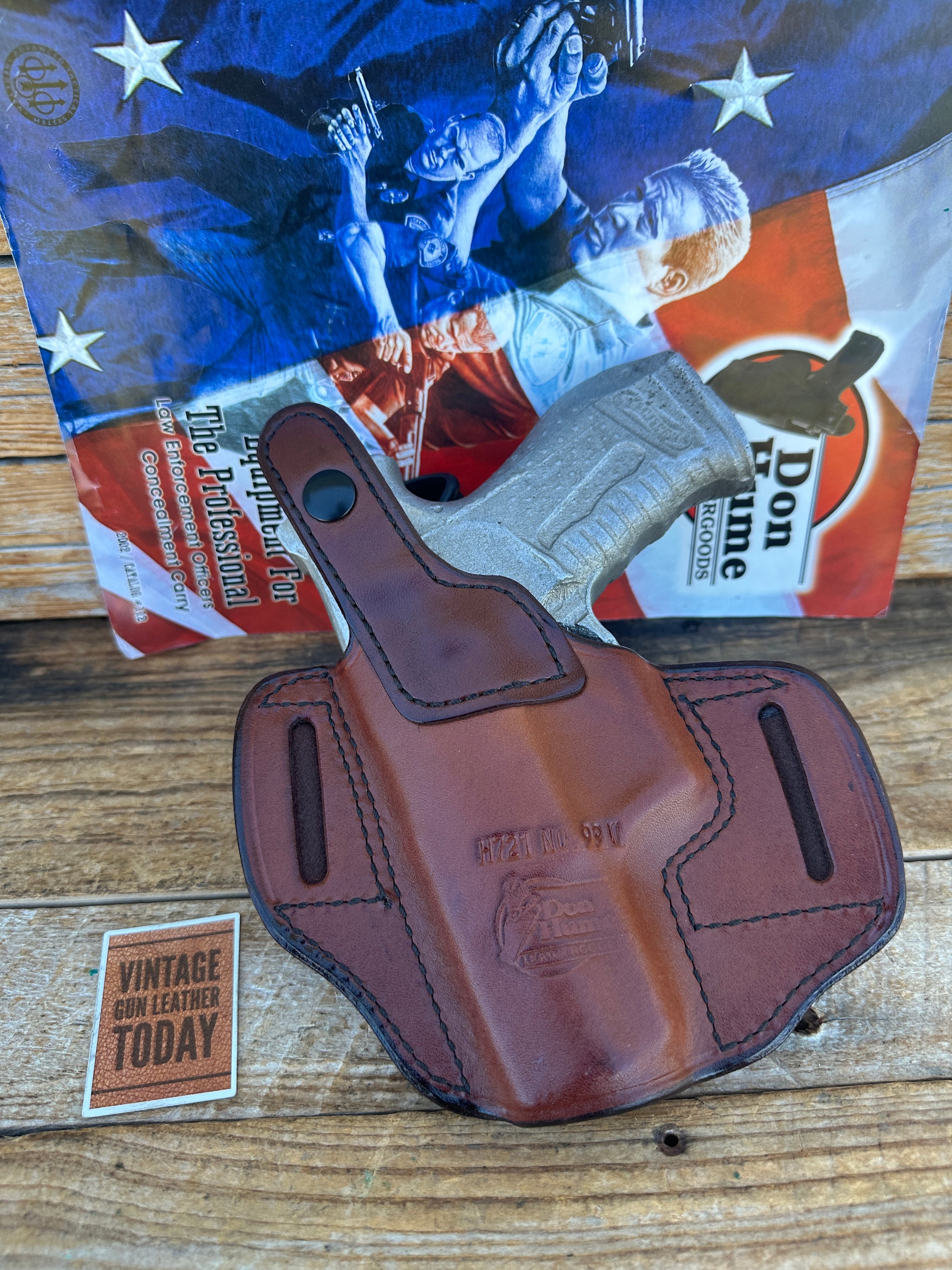 Vintage new old stock Don Hume H721 99W Double 9 Holster. Holster is plain black / saddle Brown leather with covered 1 3/4" belt slots. This is for the Walther P99 Right draw..