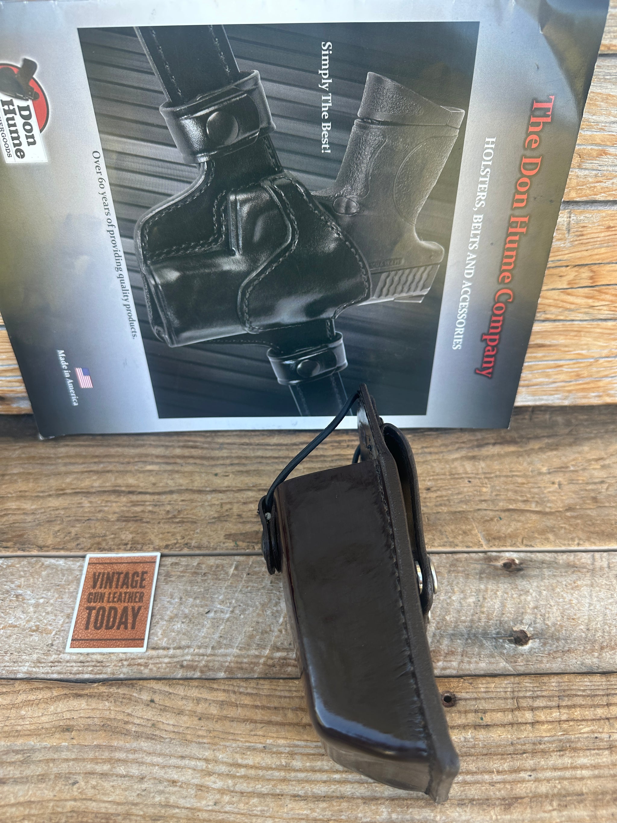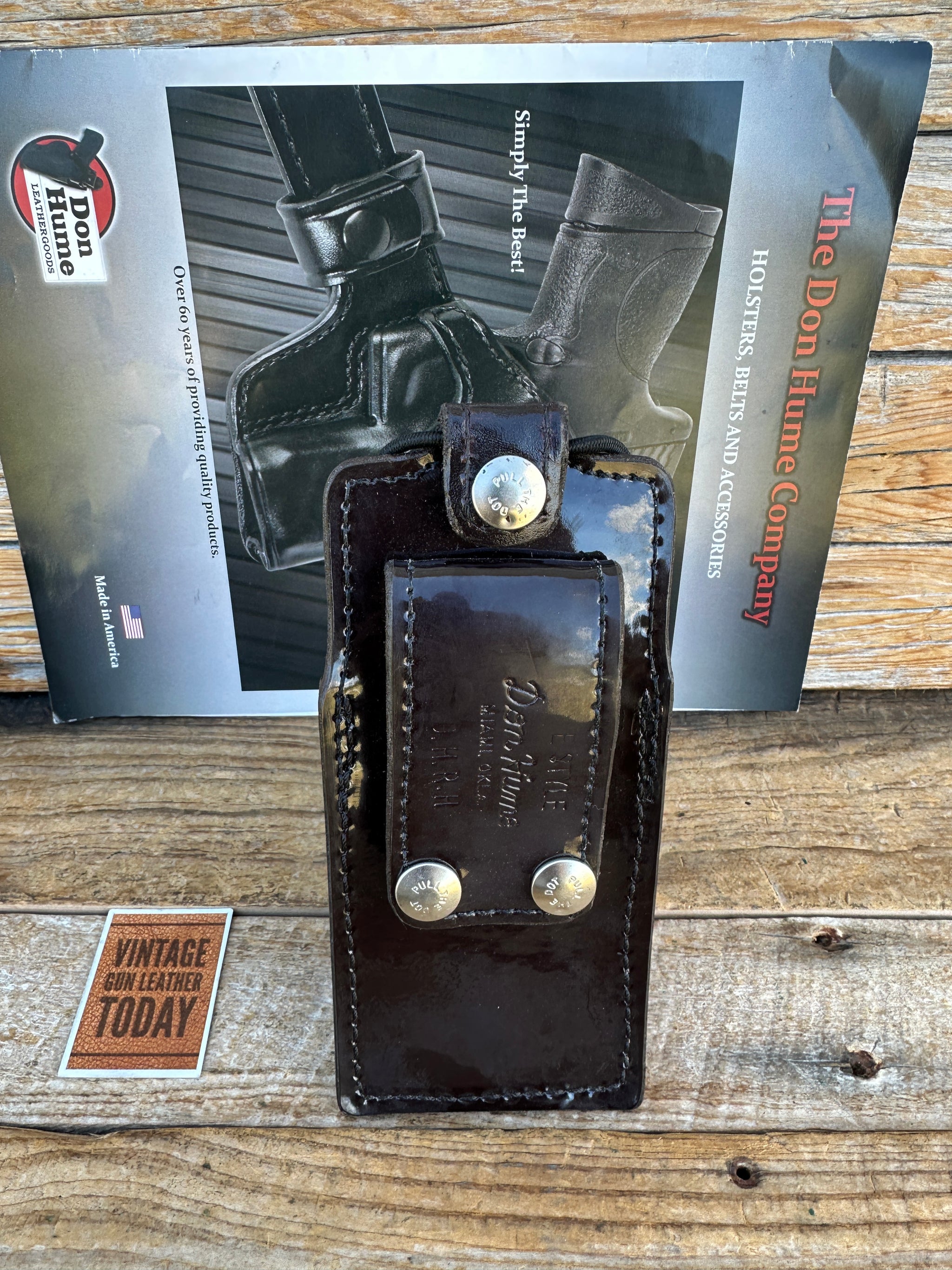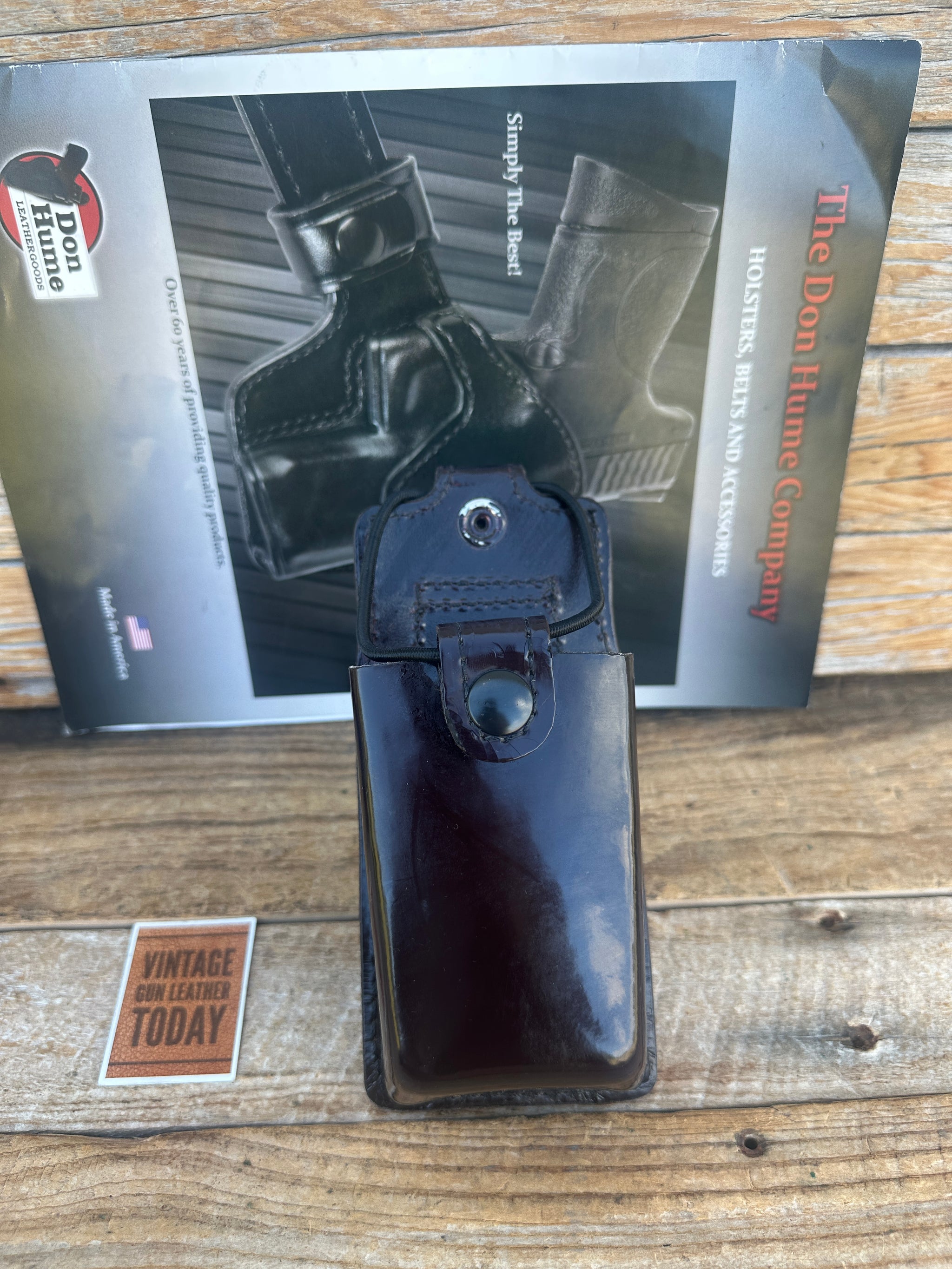 Vintage new old stock Don Hume D.H.R.H. E Style, portable radio holder. This is brown gloss / Clarino leather with black snap and 2 1/2" belt slot with directional snaps. Holder is for the following or similar: