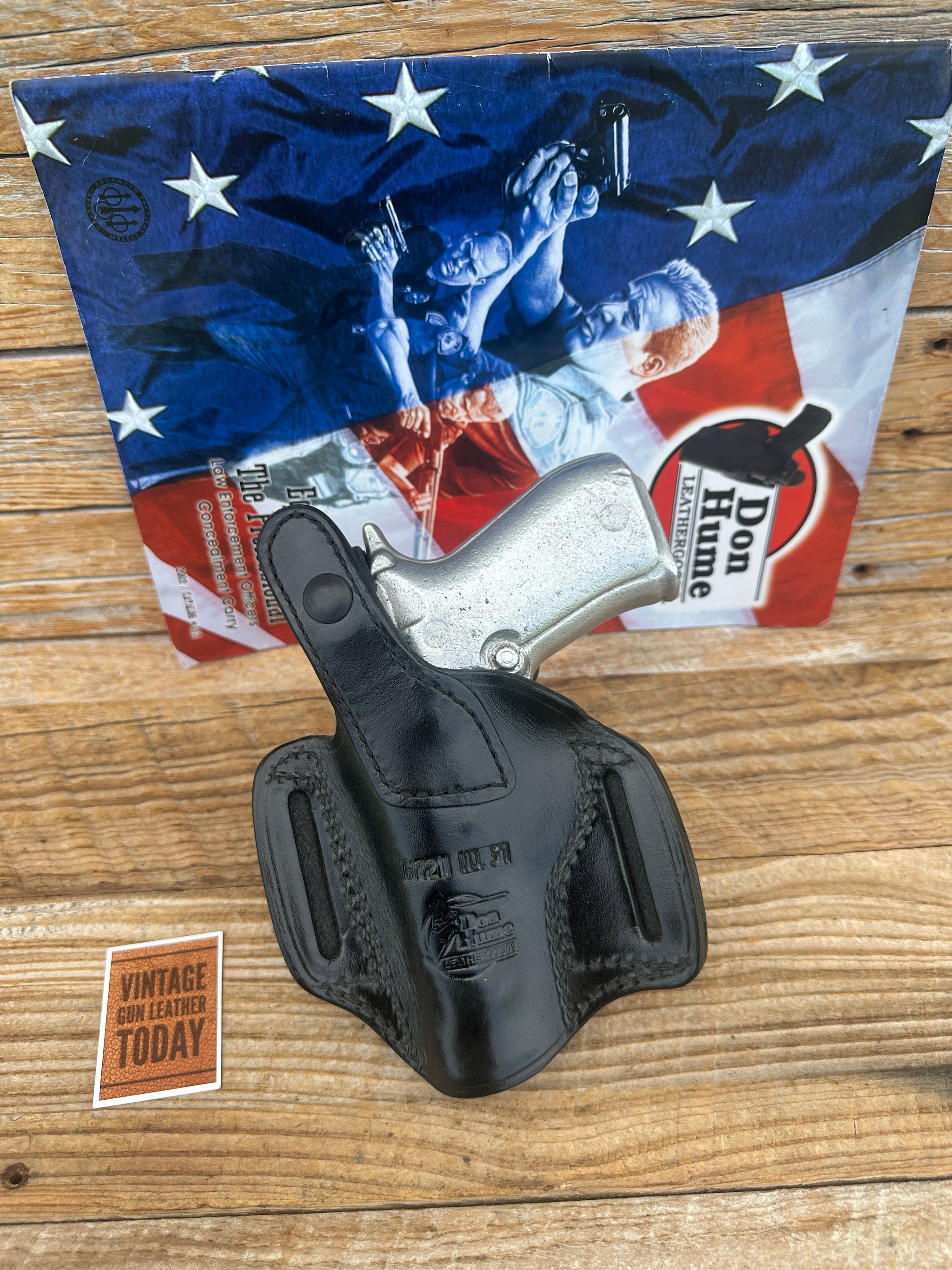 Vintage new old stock Don Hume H721 31 Double 9 Holster. Holster is plain black leather with Covered 1 3/4" belt slots. Excellent period correct holster for: