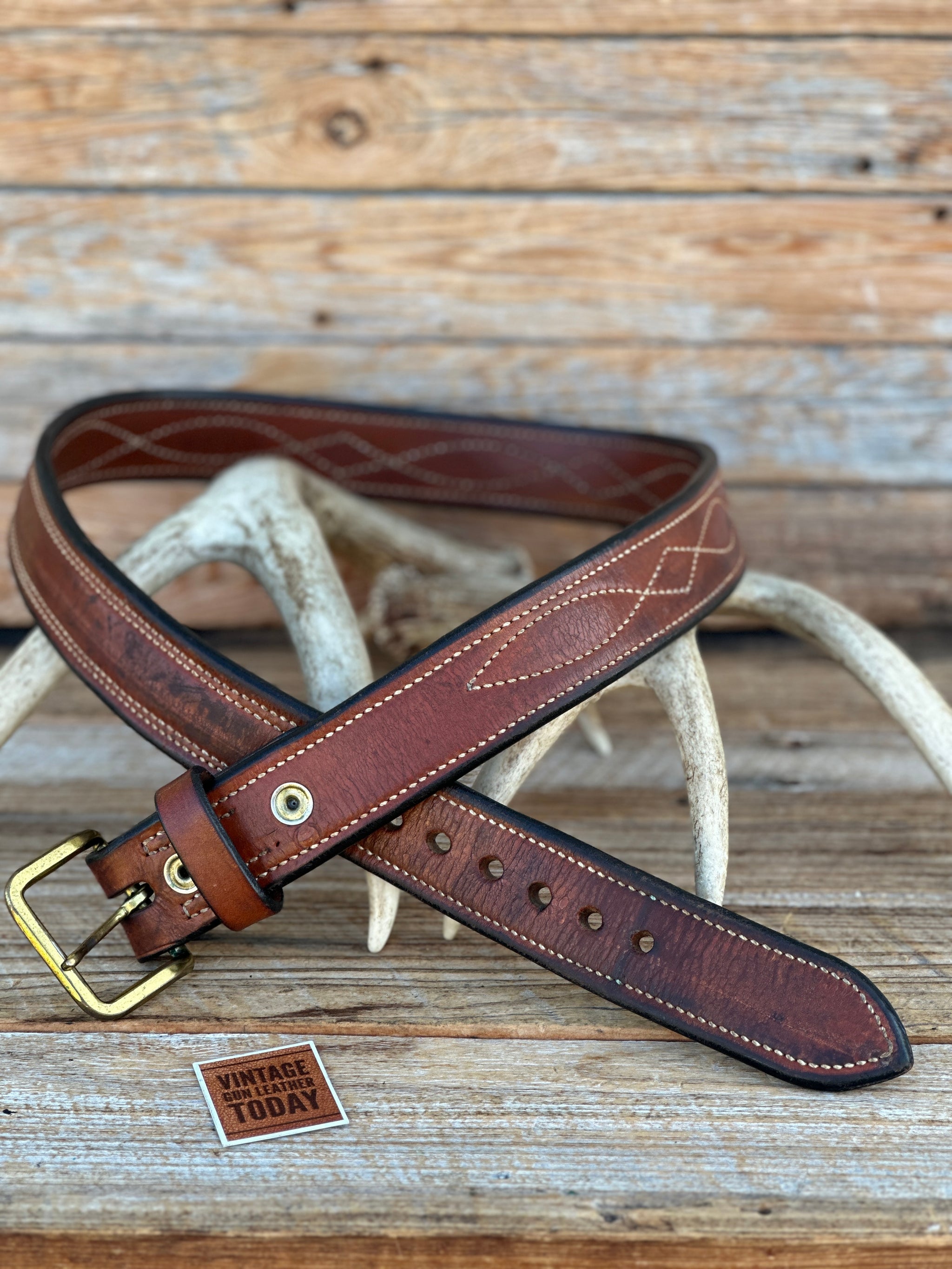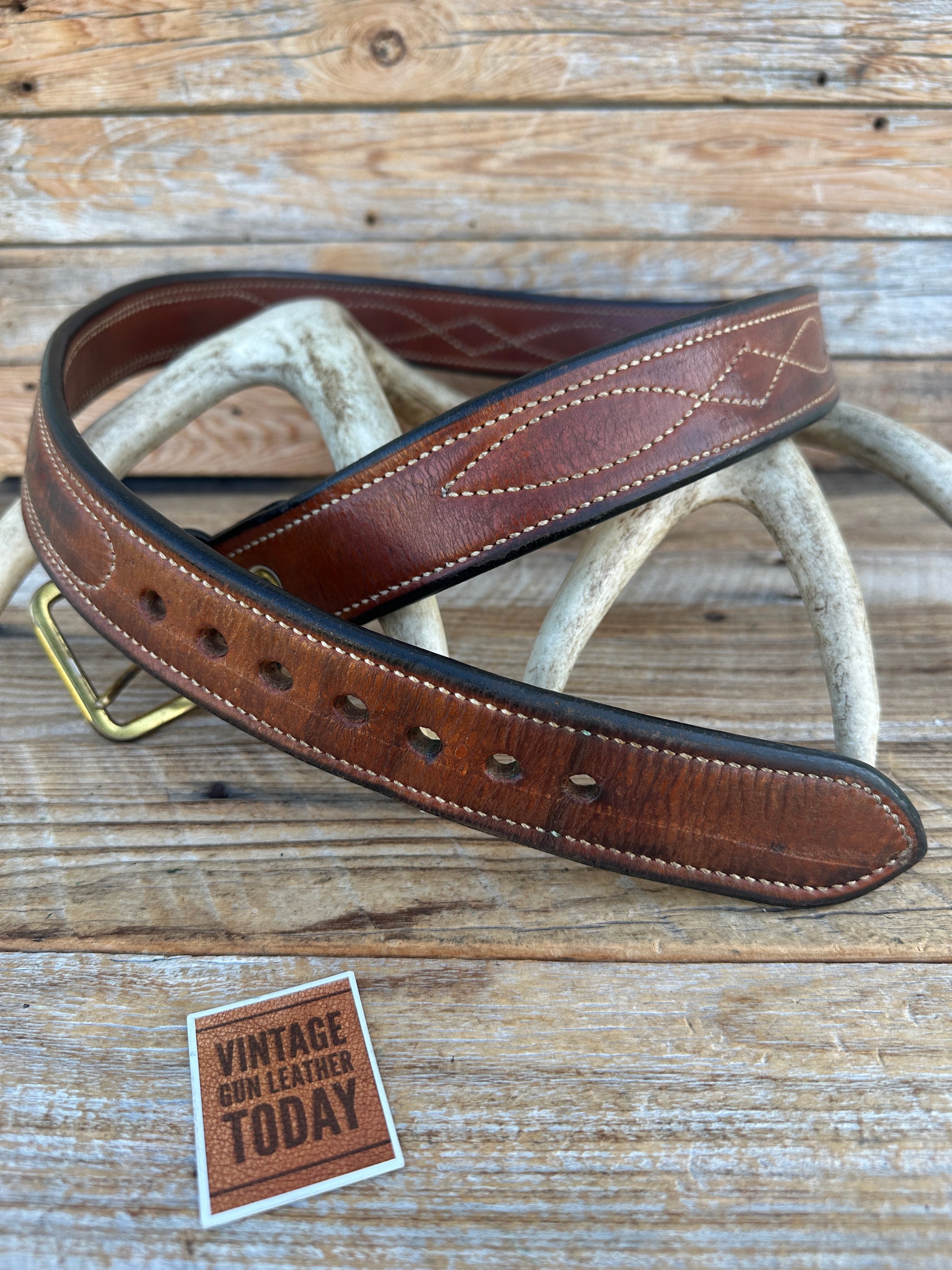 Vintage Earnie Hill Speed Leather Gun Belt. Belt is 1 5/8" wide, Size 40 measuring 37 1/2" to the smallest setting and 42 1/2" to the largest setting, measuring from leather end prior to buckle. Buckle is solid brass and can be removed if desired. Belt is brown leather, smooth leather lined and fancy / boot stitched. Belt and buckle are very solid and made to last a lifetime..